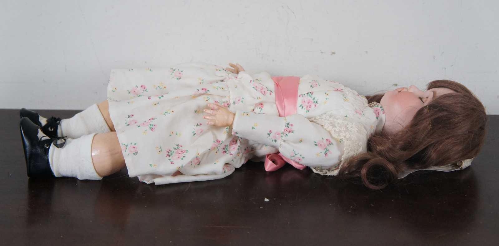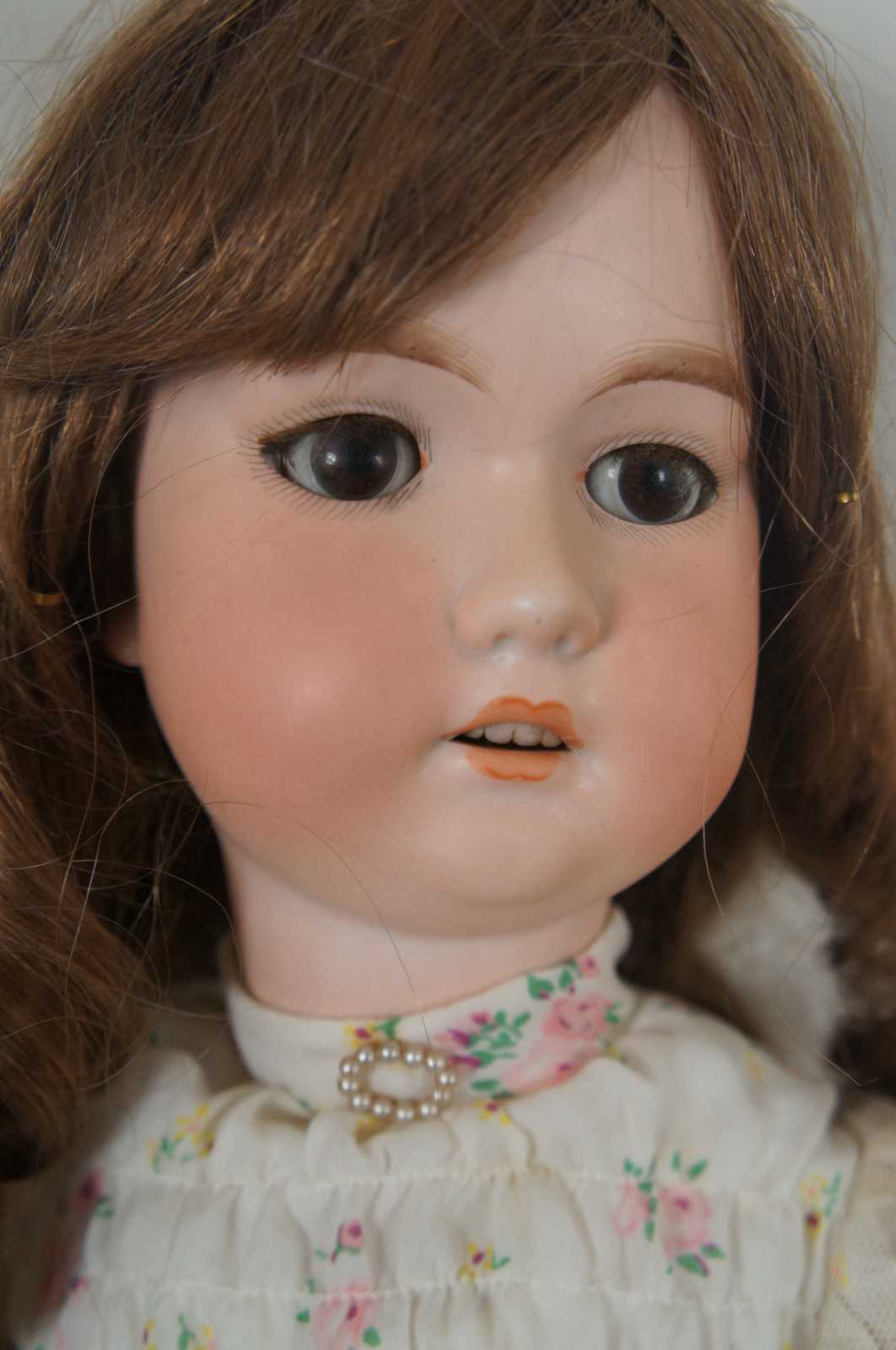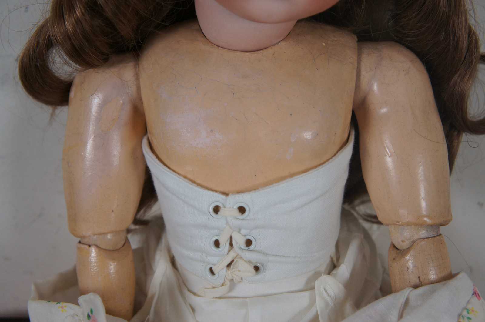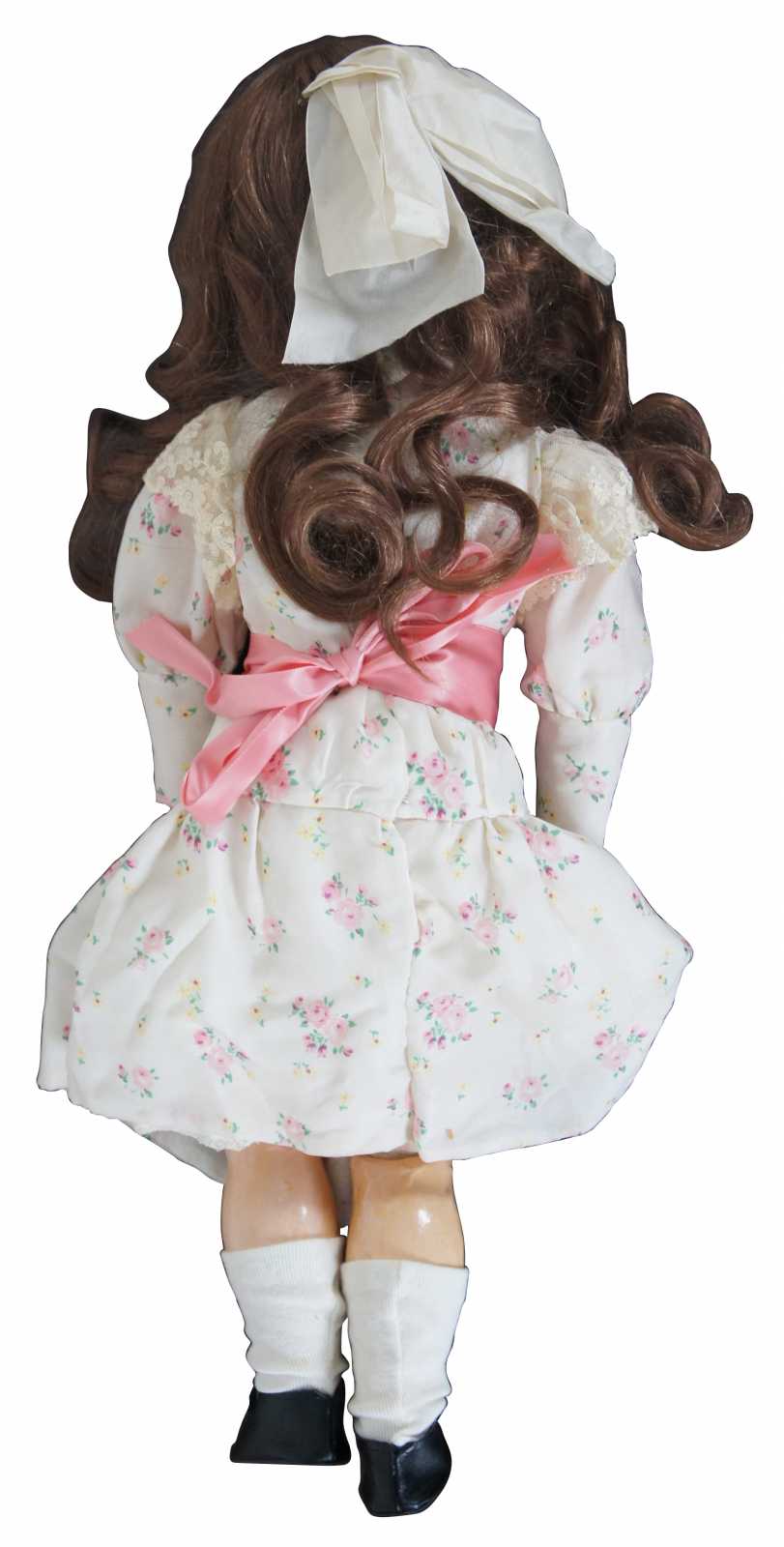 Antique German bisque head doll by CM Bergmann with articulated jointed limbs and composite body, non-original human hair, sleep eyes, marked “Made in Germany CM Bergmann II” on back of neck, dressed in a floral dress with pink sash and undergarments that include training stays. “Charles M. Bergmann operated a doll company in Waltershausen, Thüringia, Germany, by 1909 he added a factory in Friedrichroda, Germany, until they went bankrupt in 1931. Bergmann dolls came in sizes from 13" to 34" tall, with composition ball jointed bodies and a bisque socket head or bisque shoulder head and kid body, supplied from other manufacturers; Armand Marseilles, ABG - Alt, Beck & Gottschalck, William Gobel, Simon & Halbig and maybe others. Bergmann also made papier mache dolls, kid leather bodied dolls, character baby dolls. Dolls were distributed in the United States by Louis Wolf & Company, who registered these doll trademarks for them