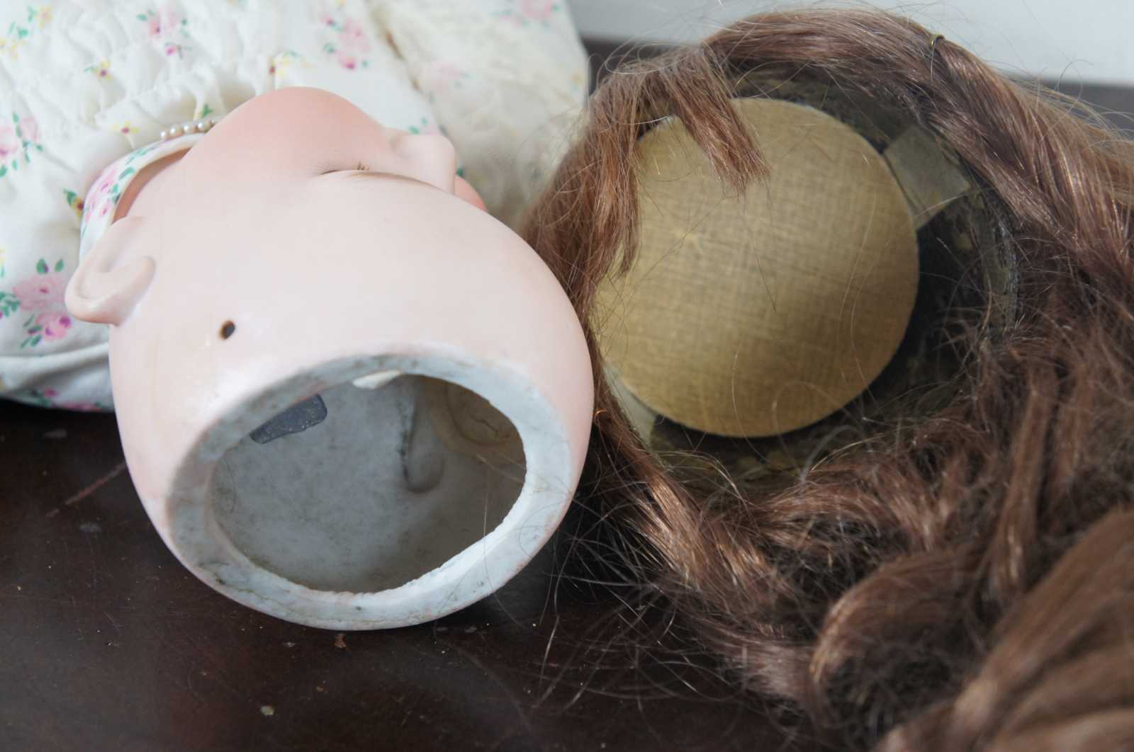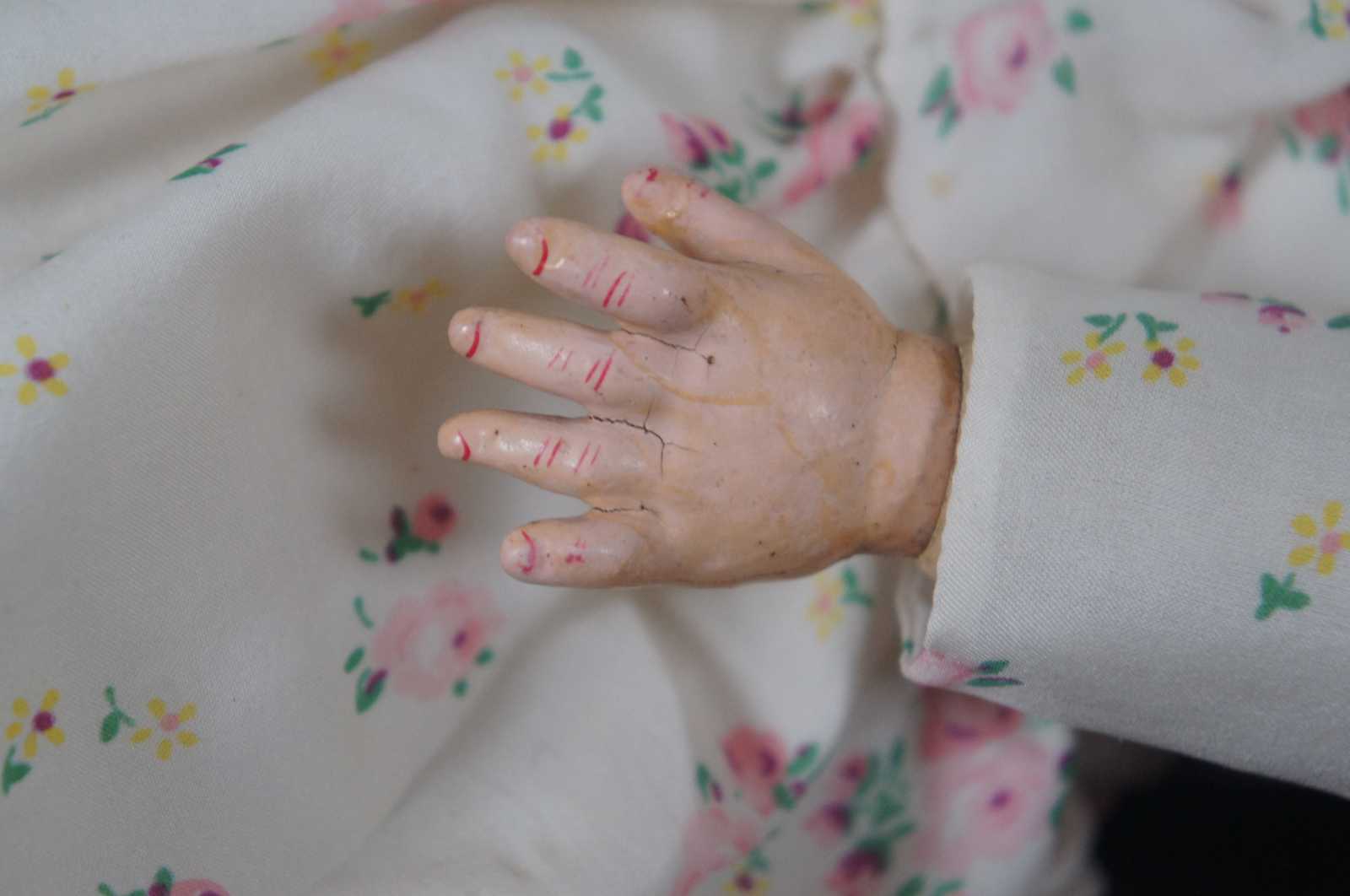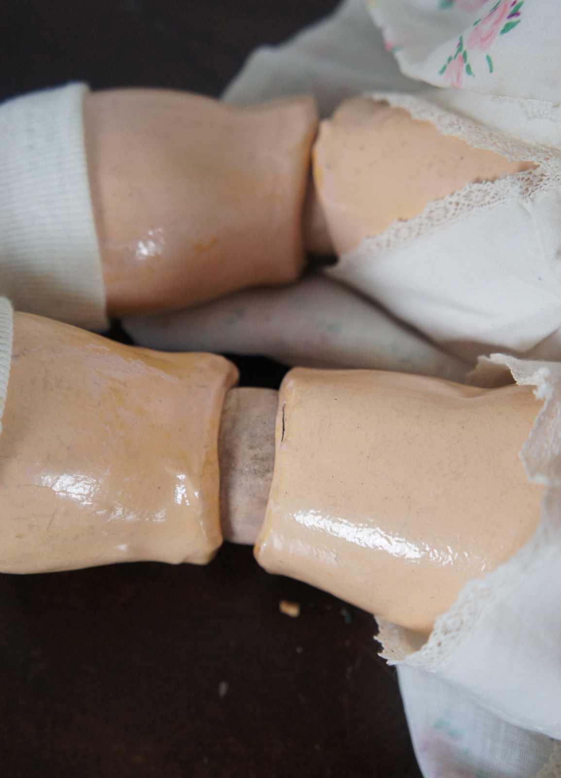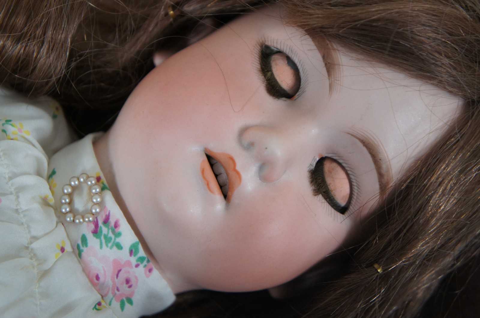 Antique German bisque head doll by CM Bergmann with articulated jointed limbs and composite body, non-original human hair, sleep eyes, marked “Made in Germany CM Bergmann II” on back of neck, dressed in a floral dress with pink sash and undergarments that include training stays. “Charles M. Bergmann operated a doll company in Waltershausen, Thüringia, Germany, by 1909 he added a factory in Friedrichroda, Germany, until they went bankrupt in 1931. Bergmann dolls came in sizes from 13" to 34" tall, with composition ball jointed bodies and a bisque socket head or bisque shoulder head and kid body, supplied from other manufacturers; Armand Marseilles, ABG - Alt, Beck & Gottschalck, William Gobel, Simon & Halbig and maybe others. Bergmann also made papier mache dolls, kid leather bodied dolls, character baby dolls. Dolls were distributed in the United States by Louis Wolf & Company, who registered these doll trademarks for them