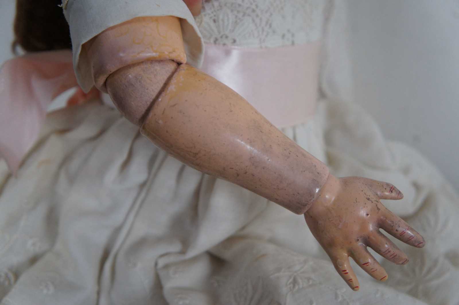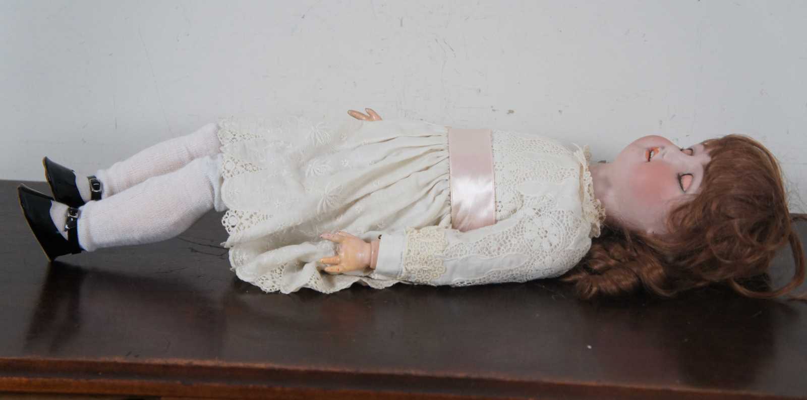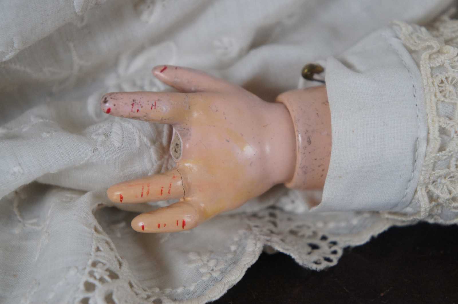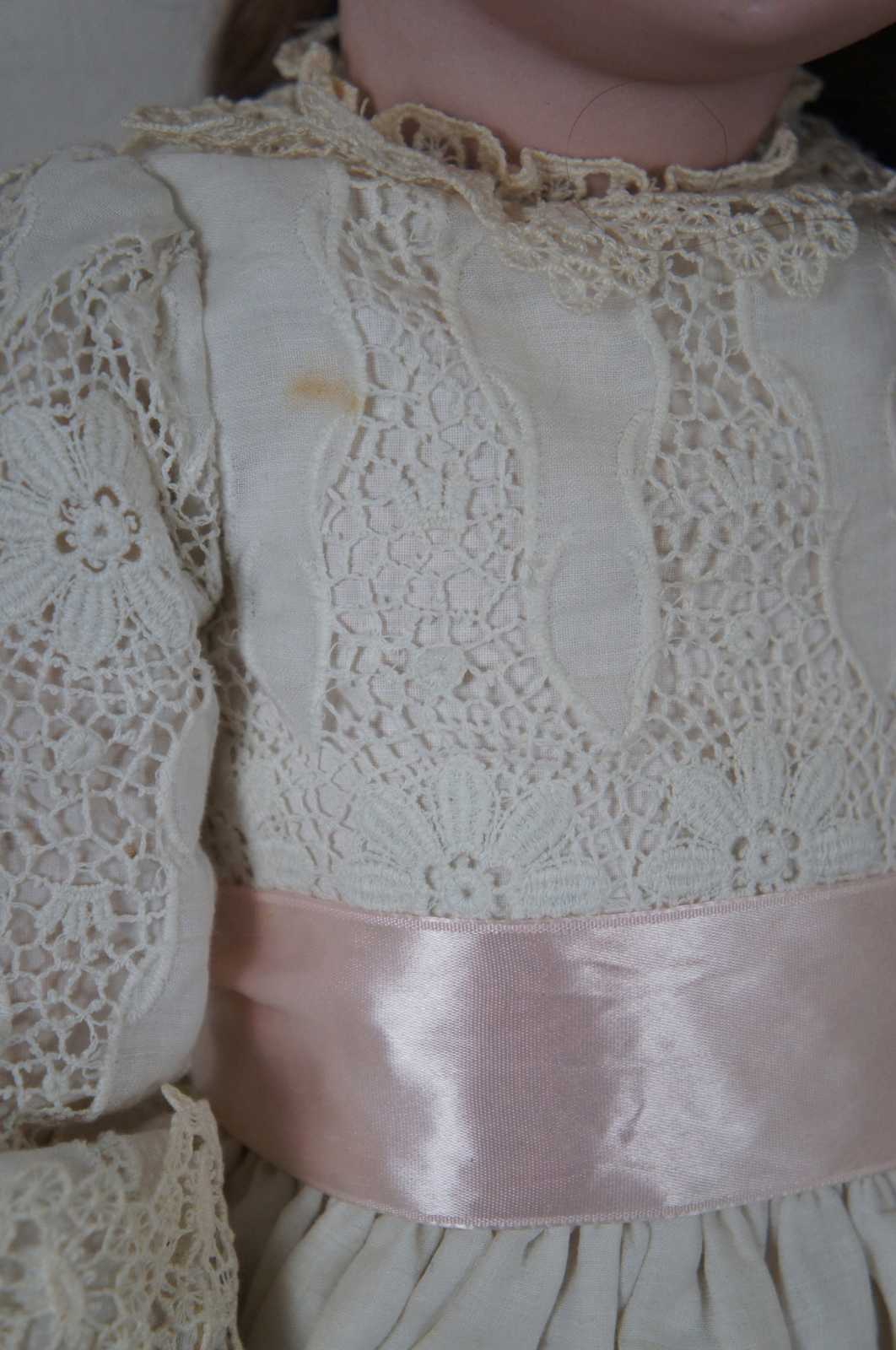 Antique German bisque head doll by CM Bergmann with composite body and articulated jointed limbs, sleep eyes, marked “CM Bergmann Simon & Halbig 12” on the back of the neck and dressed in white lace dress with pink sash. “ Charles M. Bergmann operated a doll company in Waltershausen, Thüringia, Germany, by 1909 he added a factory in Friedrichroda, Germany, until they went bankrupt in 1931. Bergmann dolls came in sizes from 13" to 34" tall, with composition ball jointed bodies and a bisque socket head or bisque shoulder head and kid body, supplied from other manufacturers; Armand Marseilles, ABG - Alt, Beck & Gottschalck, William Gobel, Simon & Halbig and maybe others. Bergmann also made papier mache dolls, kid leather bodied dolls, character baby dolls. Dolls were distributed in the United States by Louis Wolf & Company, who registered these doll trademarks for them.