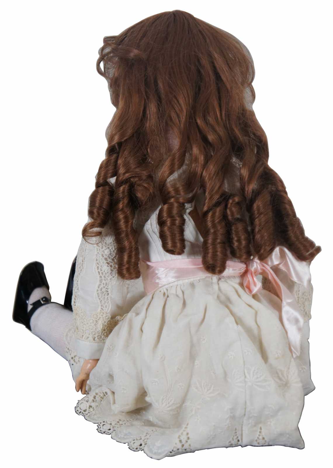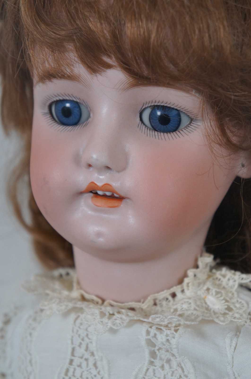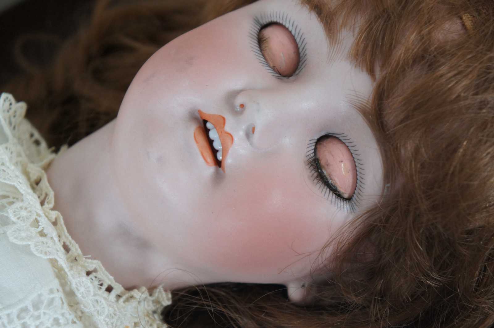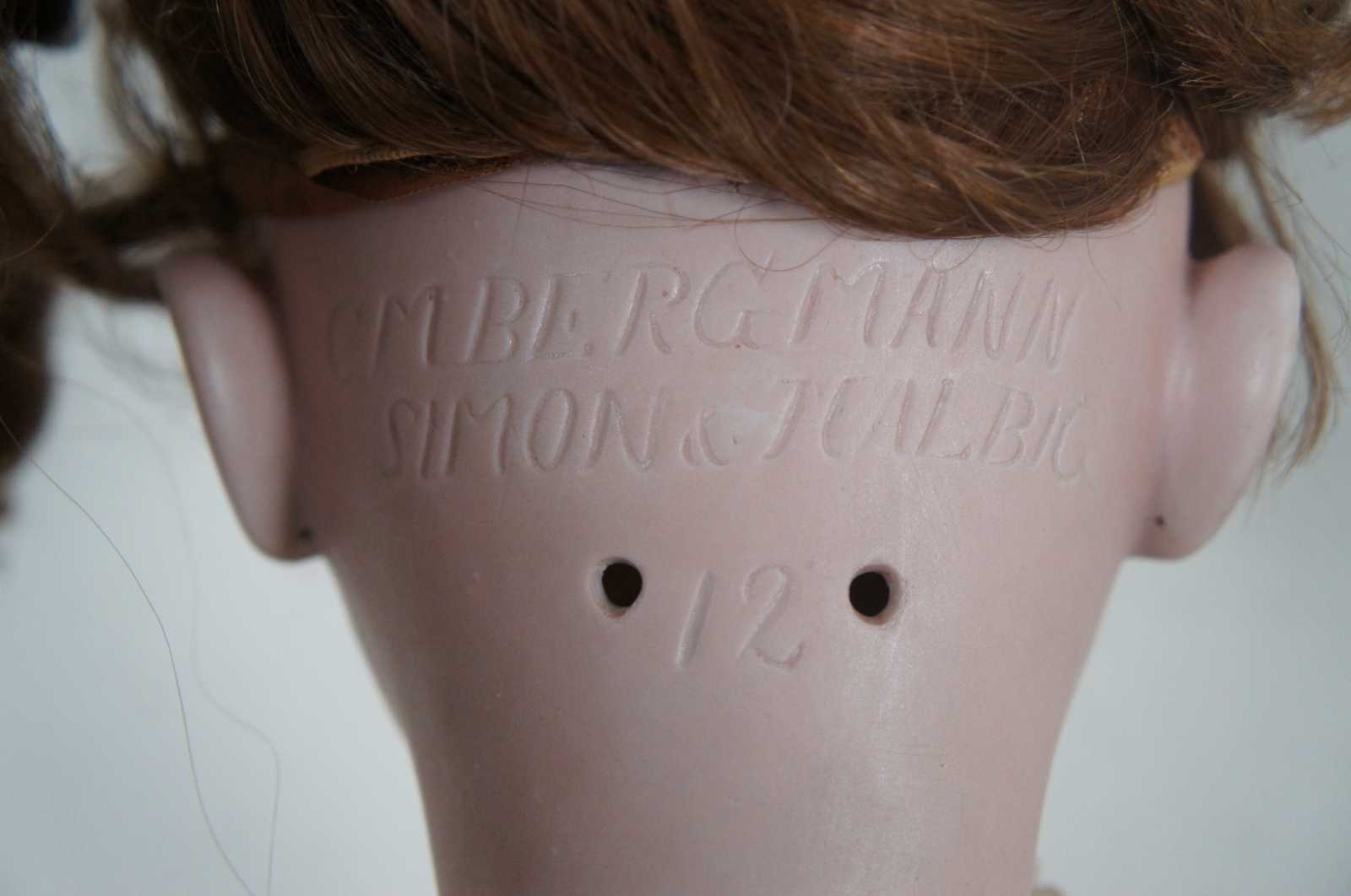 Antique German bisque head doll by CM Bergmann with composite body and articulated jointed limbs, sleep eyes, marked “CM Bergmann Simon & Halbig 12” on the back of the neck and dressed in white lace dress with pink sash. “ Charles M. Bergmann operated a doll company in Waltershausen, Thüringia, Germany, by 1909 he added a factory in Friedrichroda, Germany, until they went bankrupt in 1931. Bergmann dolls came in sizes from 13" to 34" tall, with composition ball jointed bodies and a bisque socket head or bisque shoulder head and kid body, supplied from other manufacturers; Armand Marseilles, ABG - Alt, Beck & Gottschalck, William Gobel, Simon & Halbig and maybe others. Bergmann also made papier mache dolls, kid leather bodied dolls, character baby dolls. Dolls were distributed in the United States by Louis Wolf & Company, who registered these doll trademarks for them.
