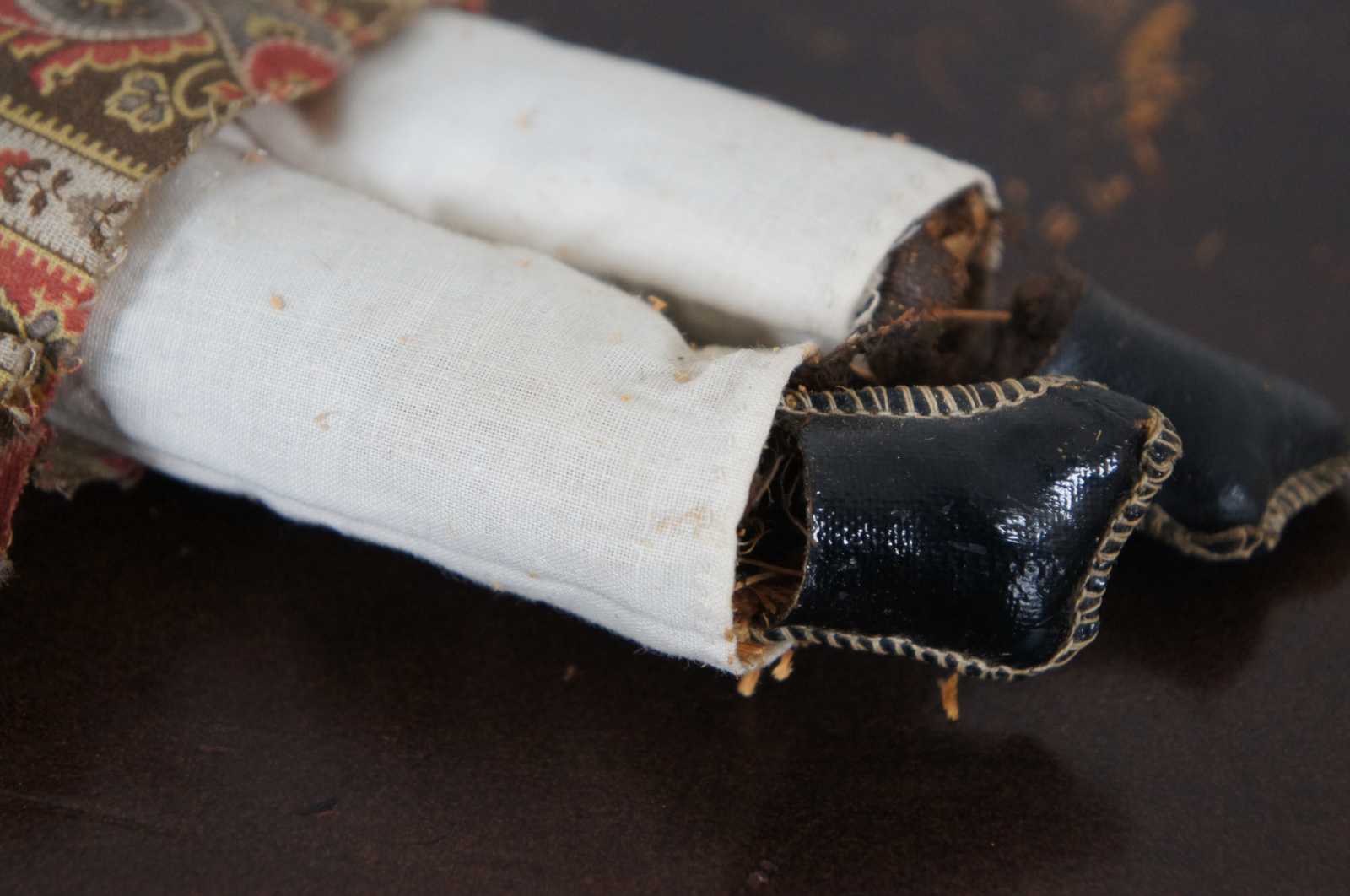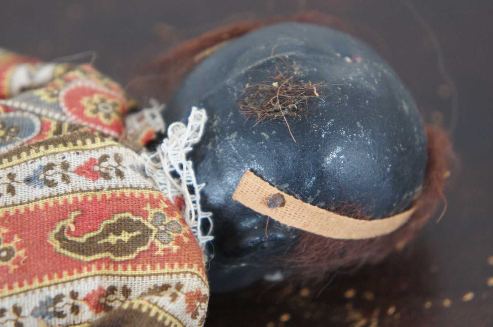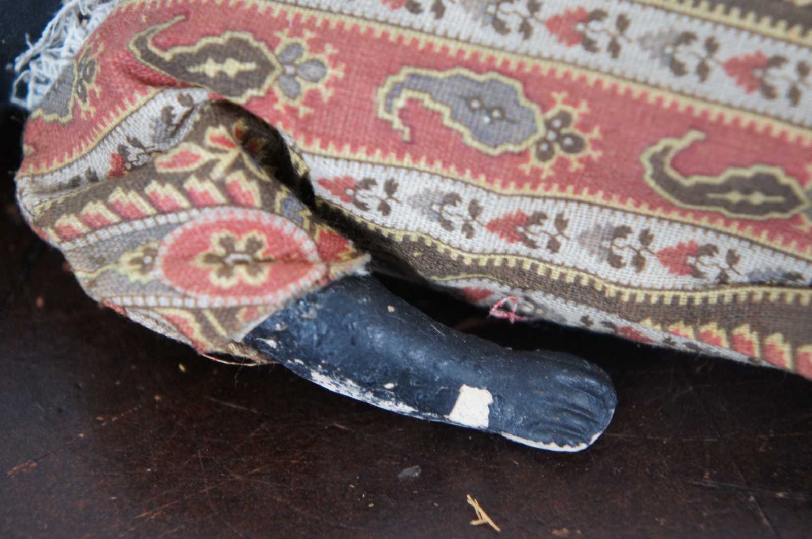 Antique 19th century doll with black bisque head and hands, glass eyes, sawdust filled cloth body, and sewn leather shoes/feet, dressed in white bloomers and a paisley patterned dress.