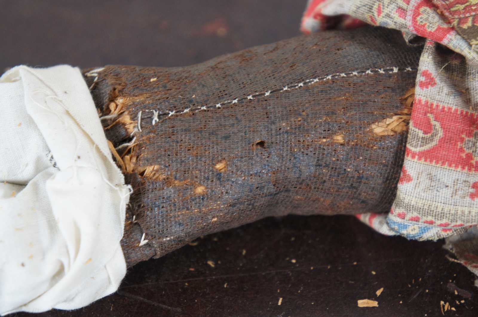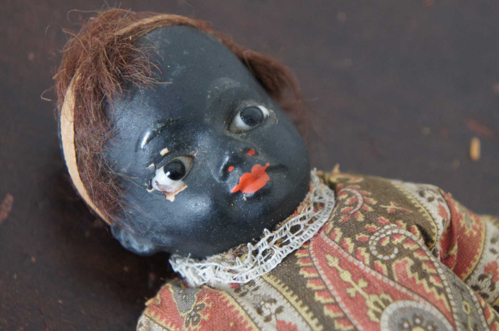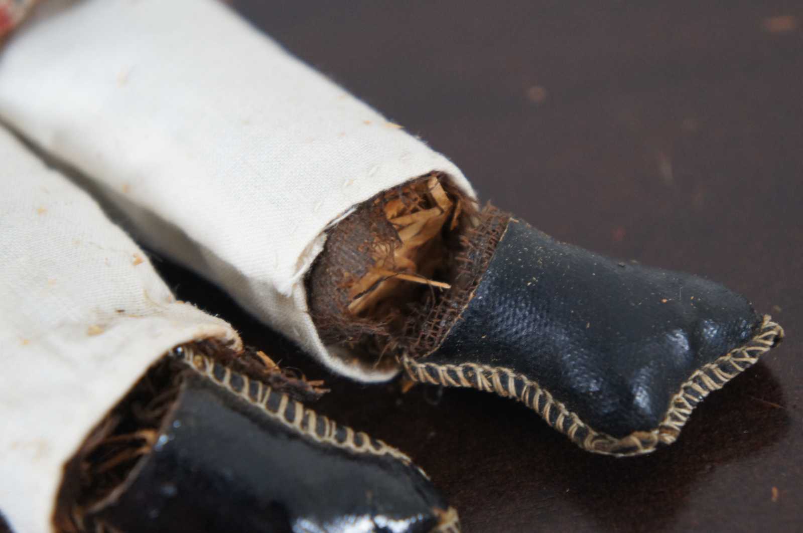 Antique 19th century doll with black bisque head and hands, glass eyes, sawdust filled cloth body, and sewn leather shoes/feet, dressed in white bloomers and a paisley patterned dress.