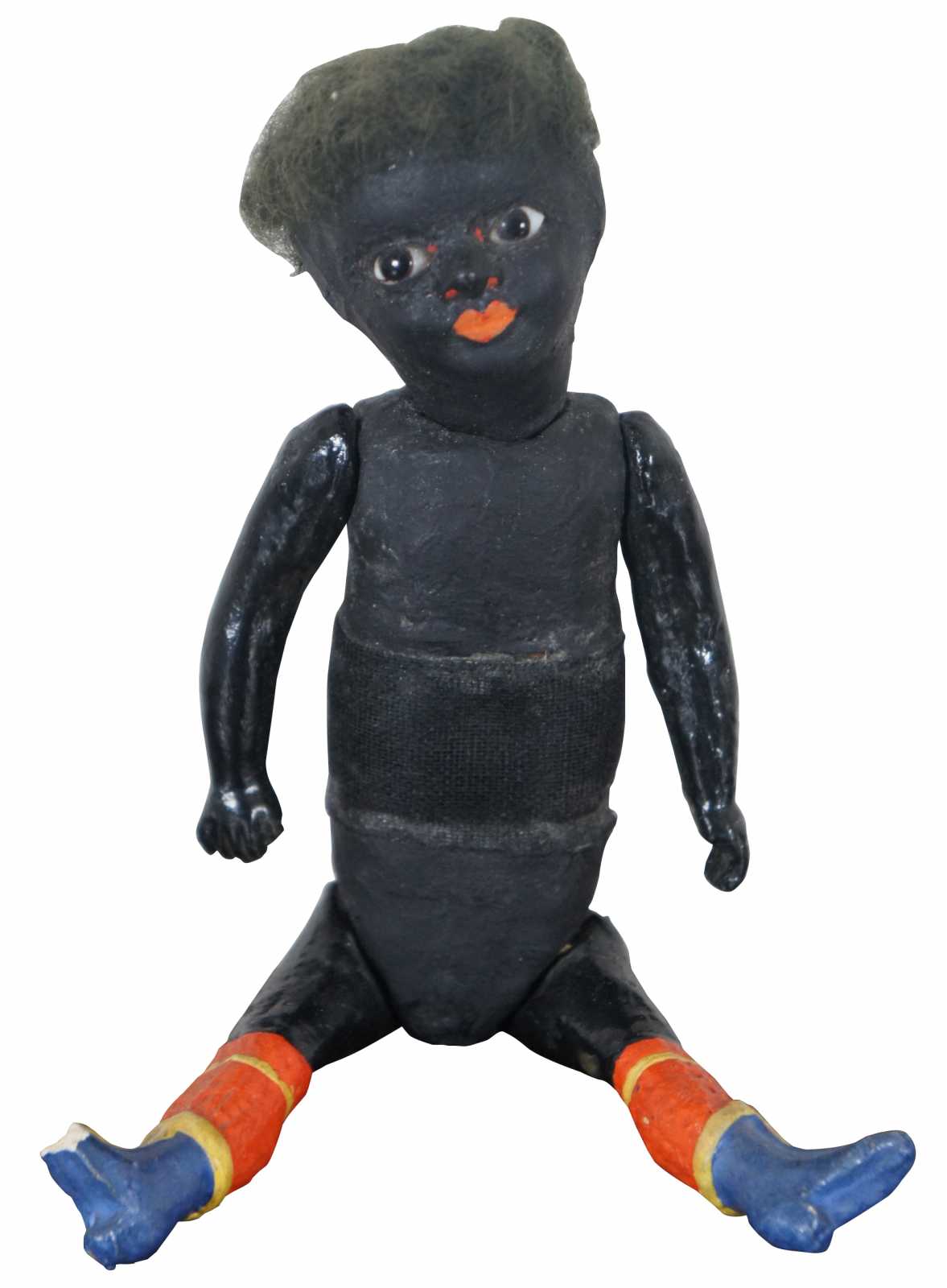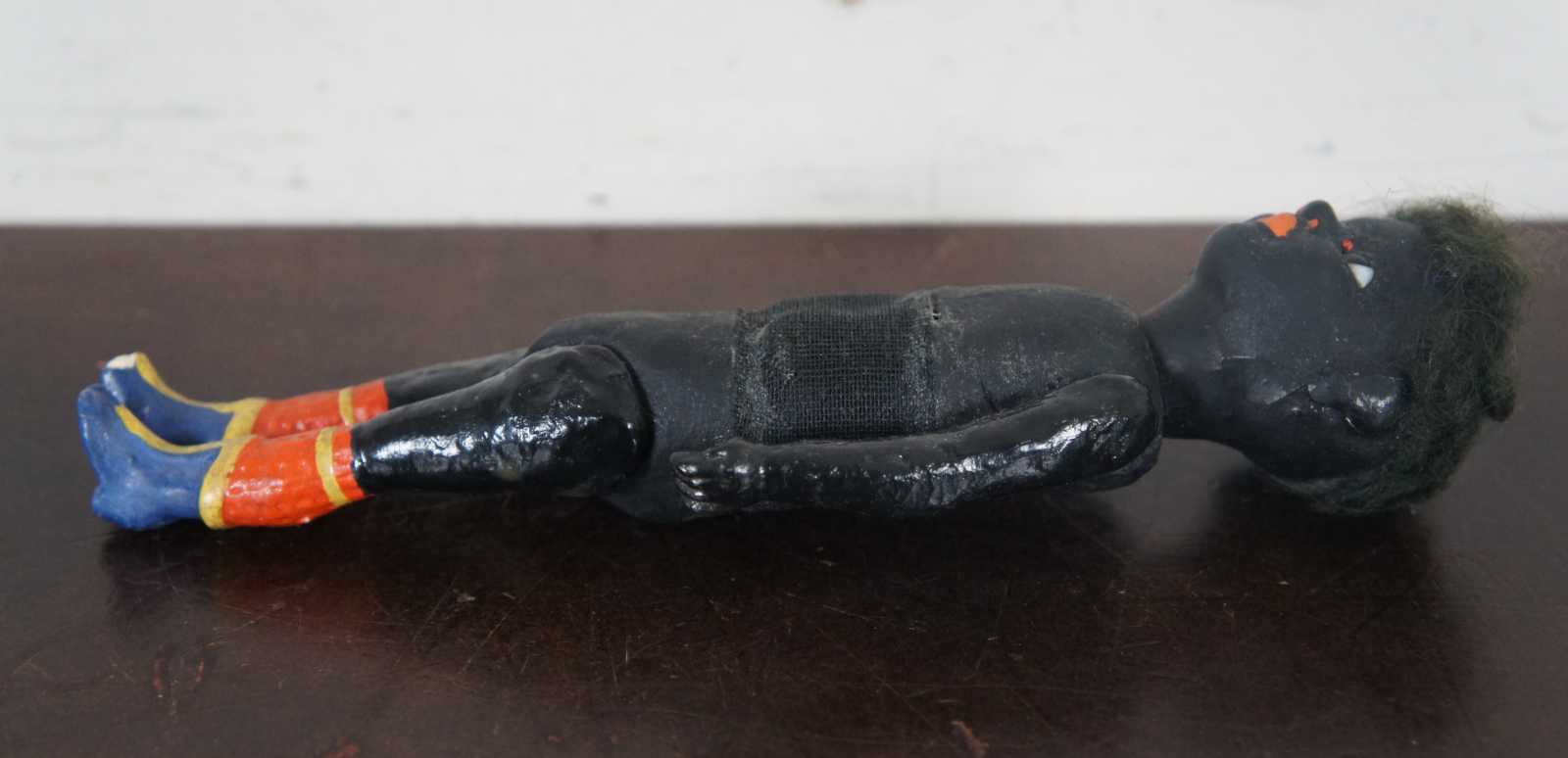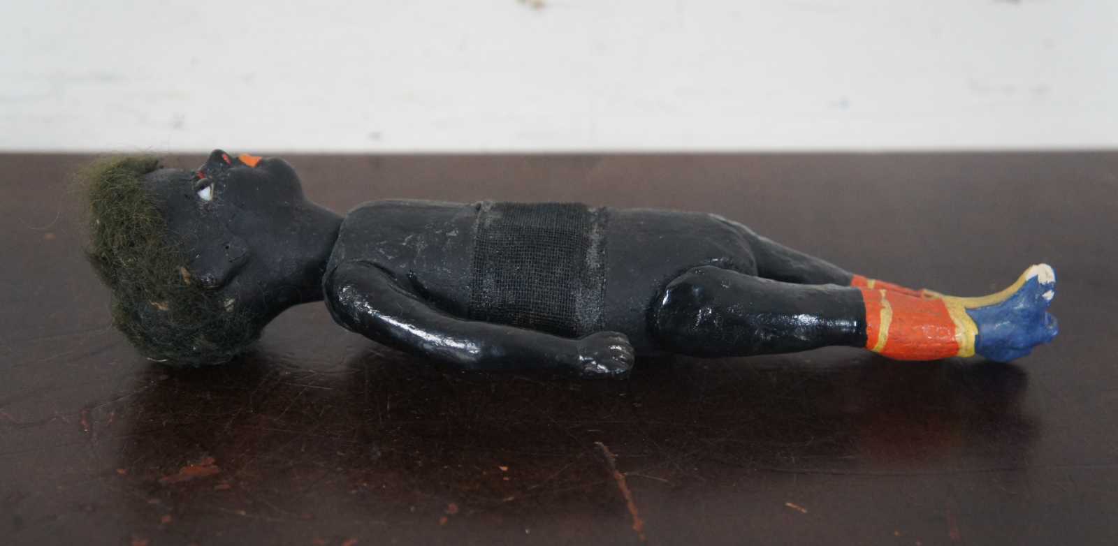 Antique 19th century black doll with full bisque body, jointed limbs and blue and red painted boots.
