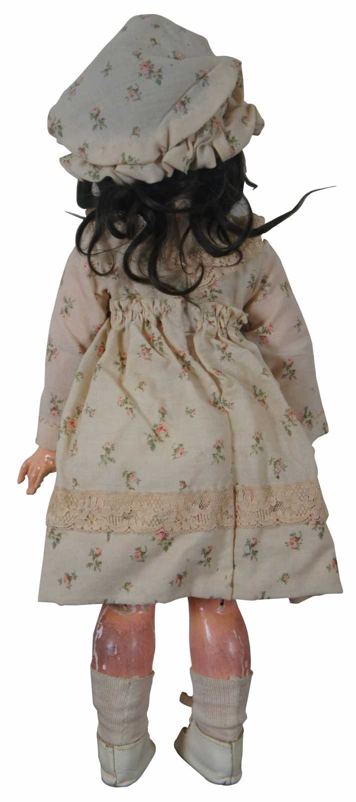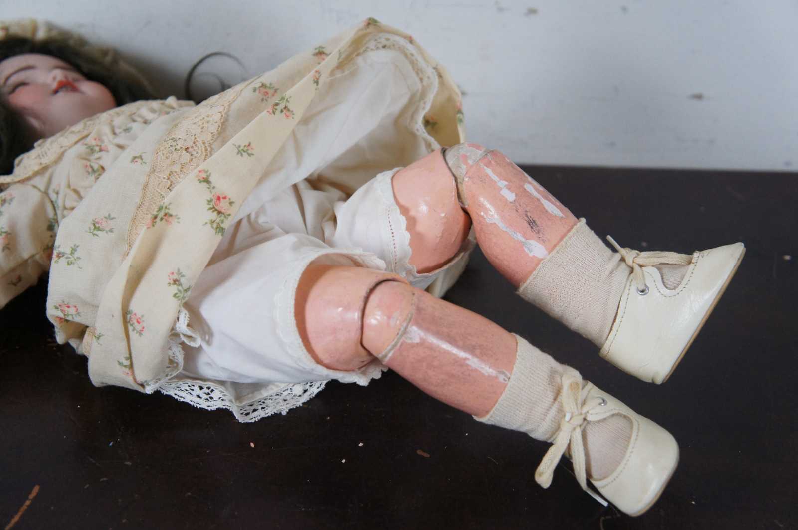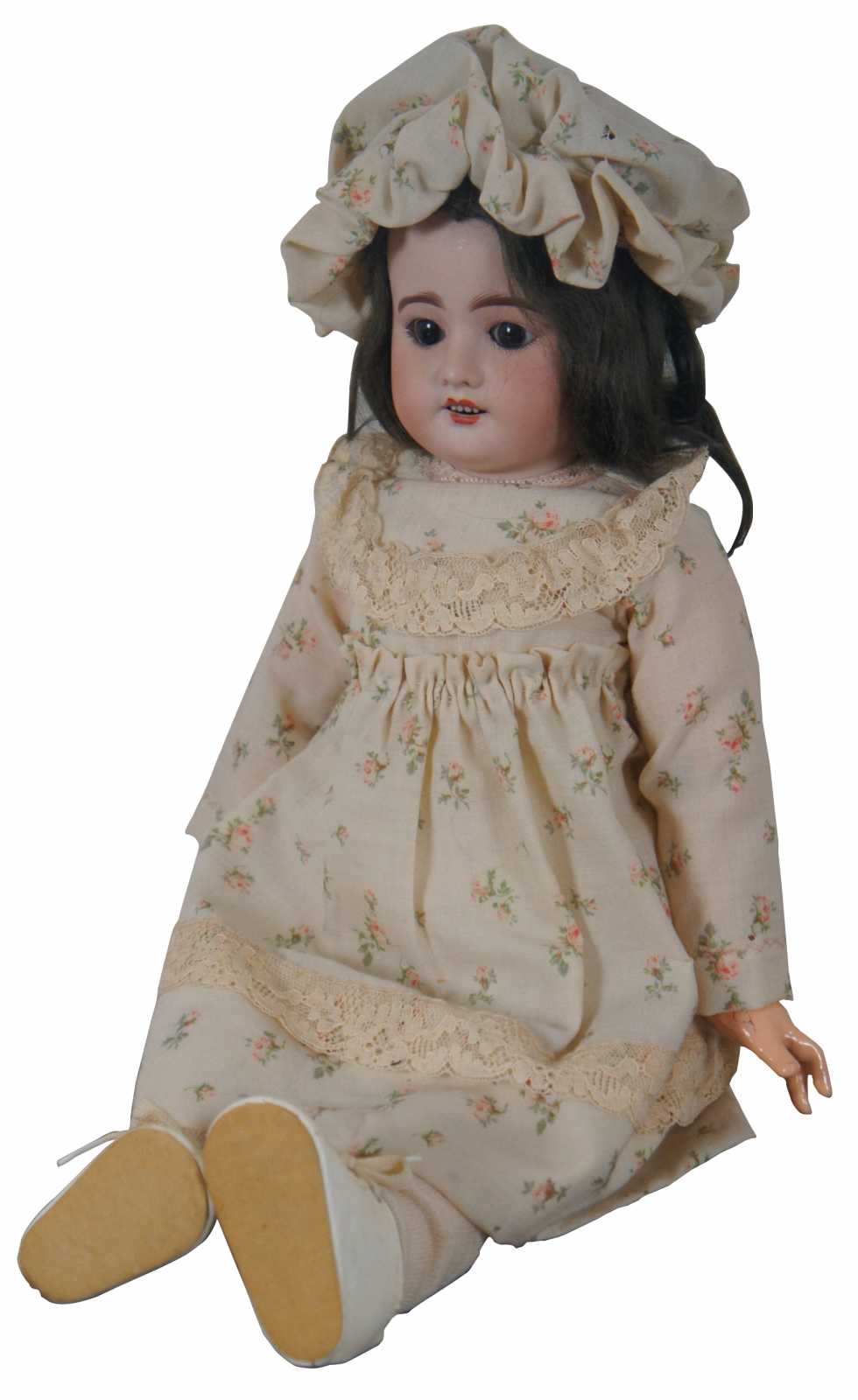 Antique 19th century SFBJ 60 Paris 2 French bisque doll with sleep eyes, brown hair, and articulated jointed limbs, dressed in floral dress and bonnet with leather shoes.