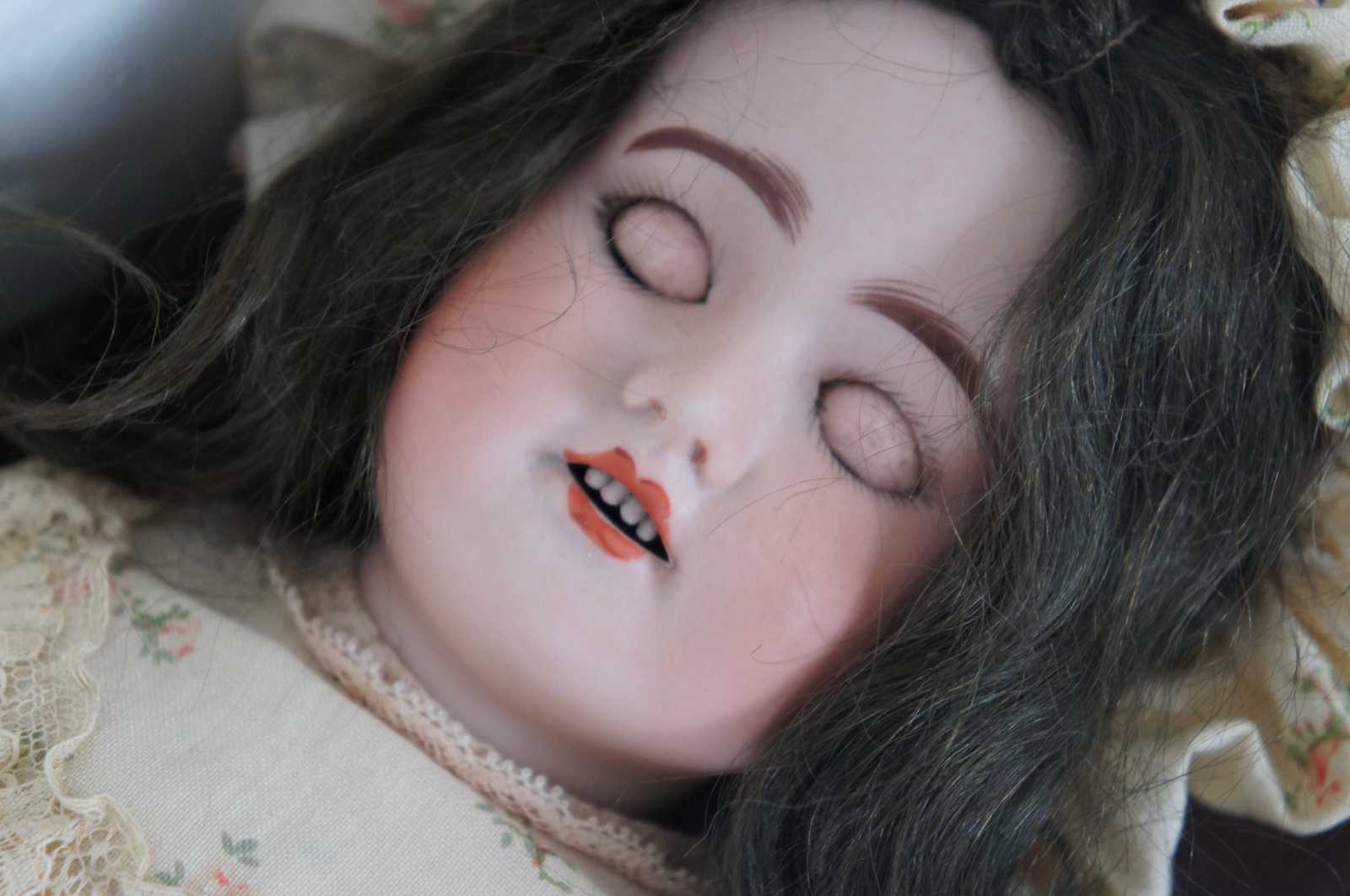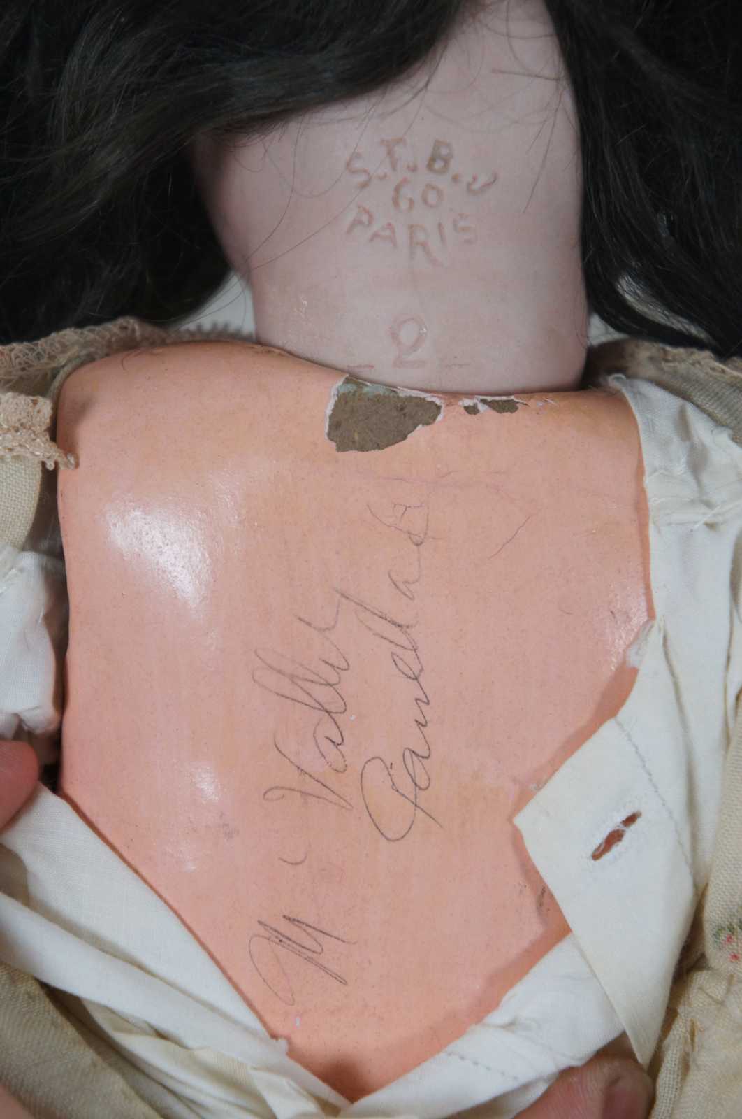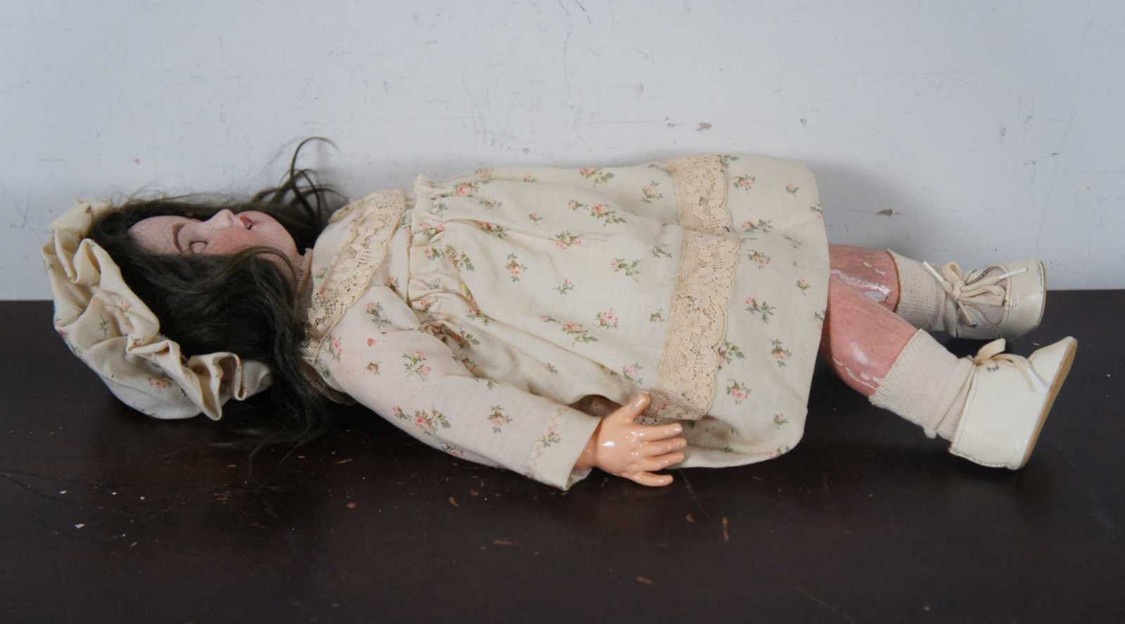 Antique 19th century SFBJ 60 Paris 2 French bisque doll with sleep eyes, brown hair, and articulated jointed limbs, dressed in floral dress and bonnet with leather shoes.