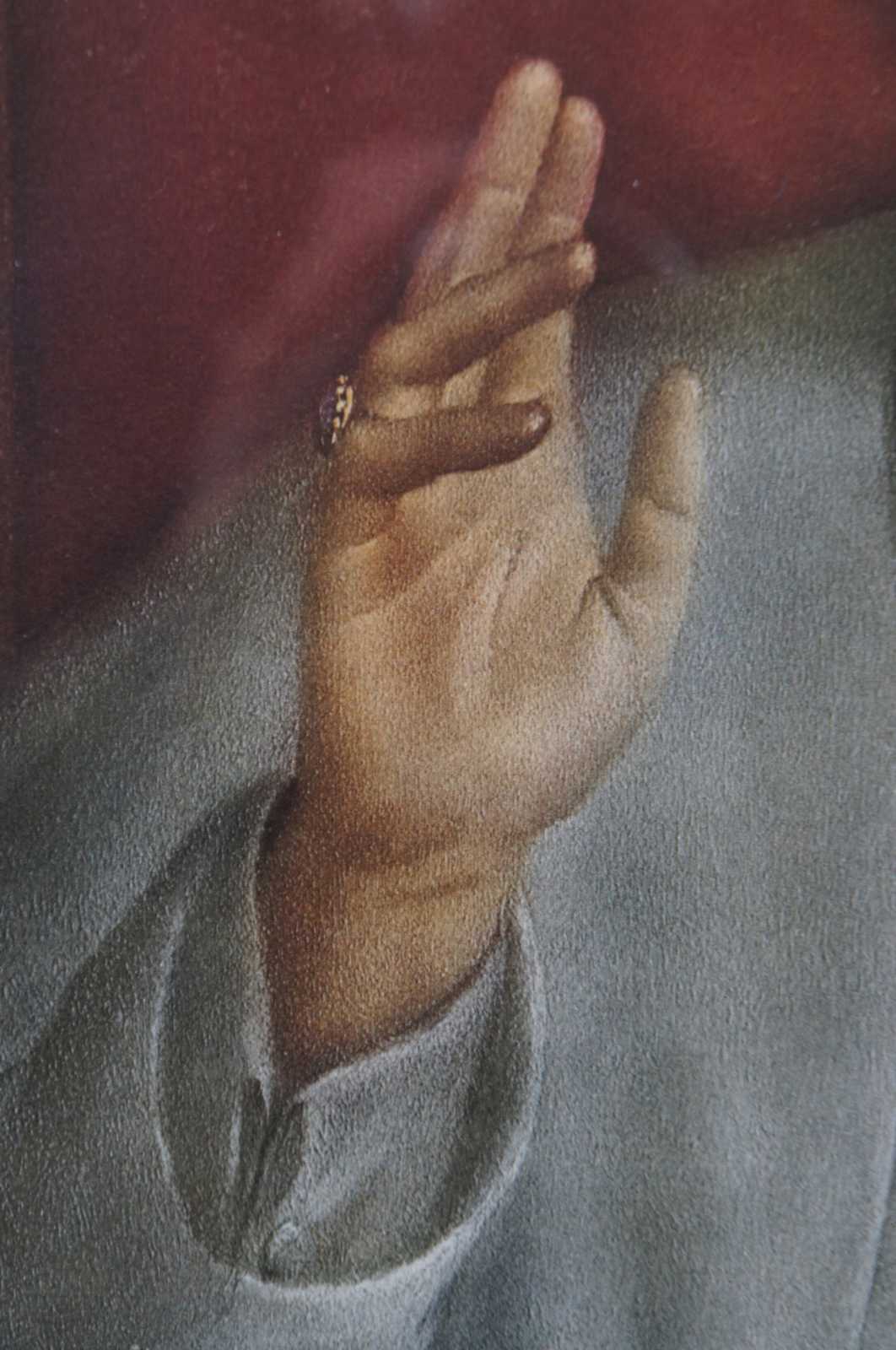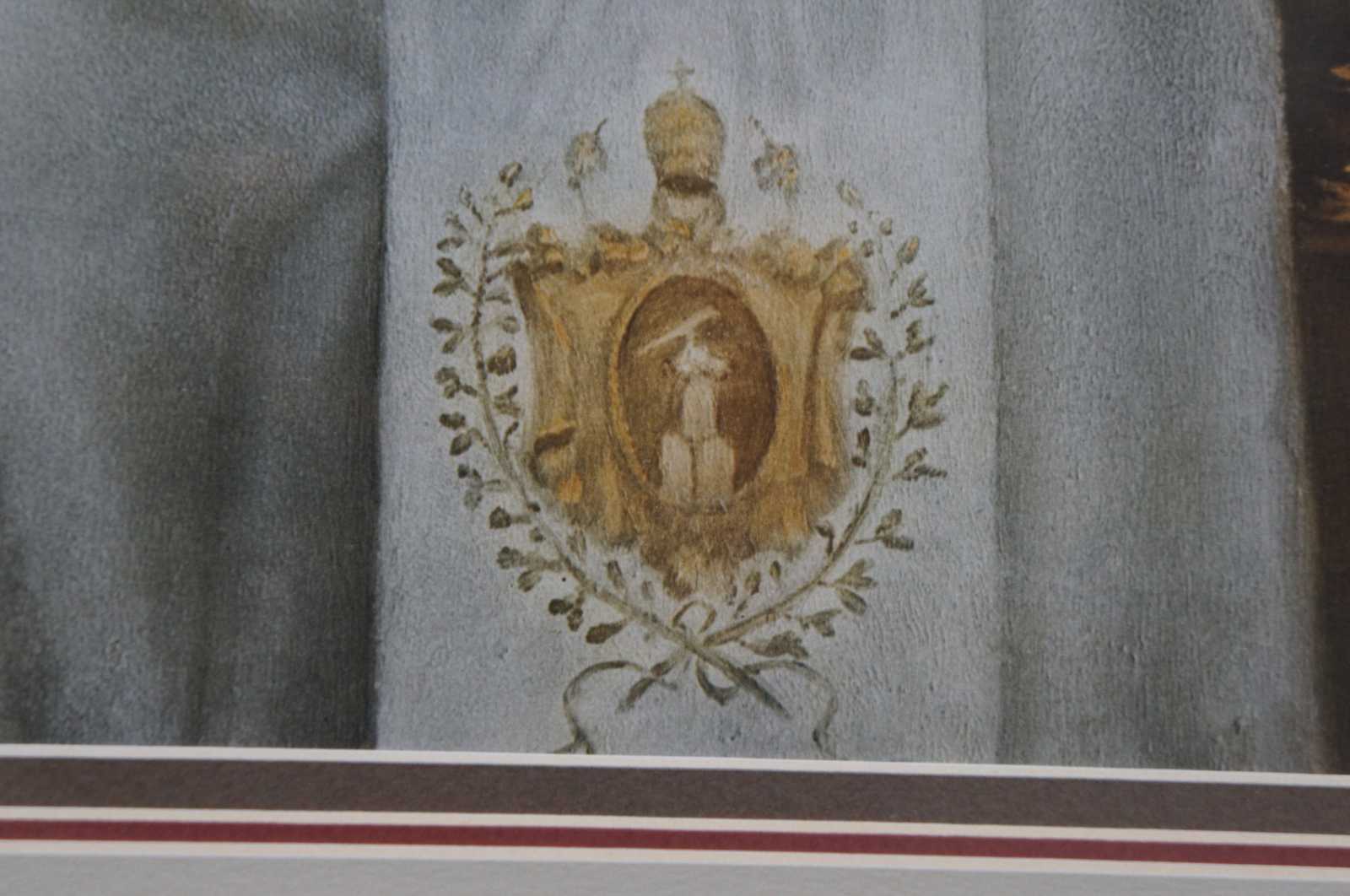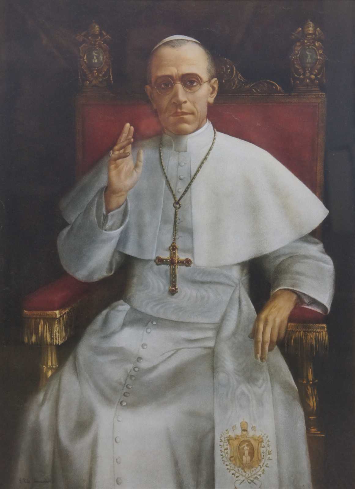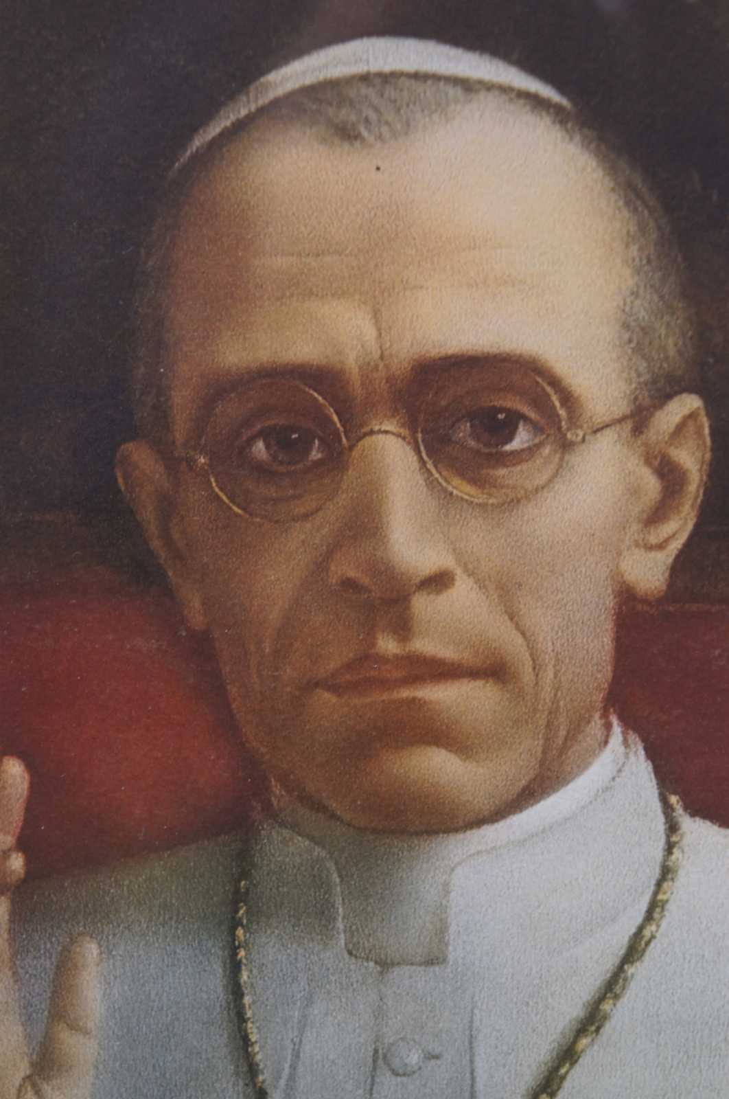 Lithograph print of Pope Pius XII seated in a red and gold throne chair with his hand raised in benediction. “Pope Pius XII, born Eugenio Maria Giuseppe Giovanni Pacelli, was head of the Catholic Church and sovereign of the Vatican City State from 2 March 1939 until his death in 1958. “