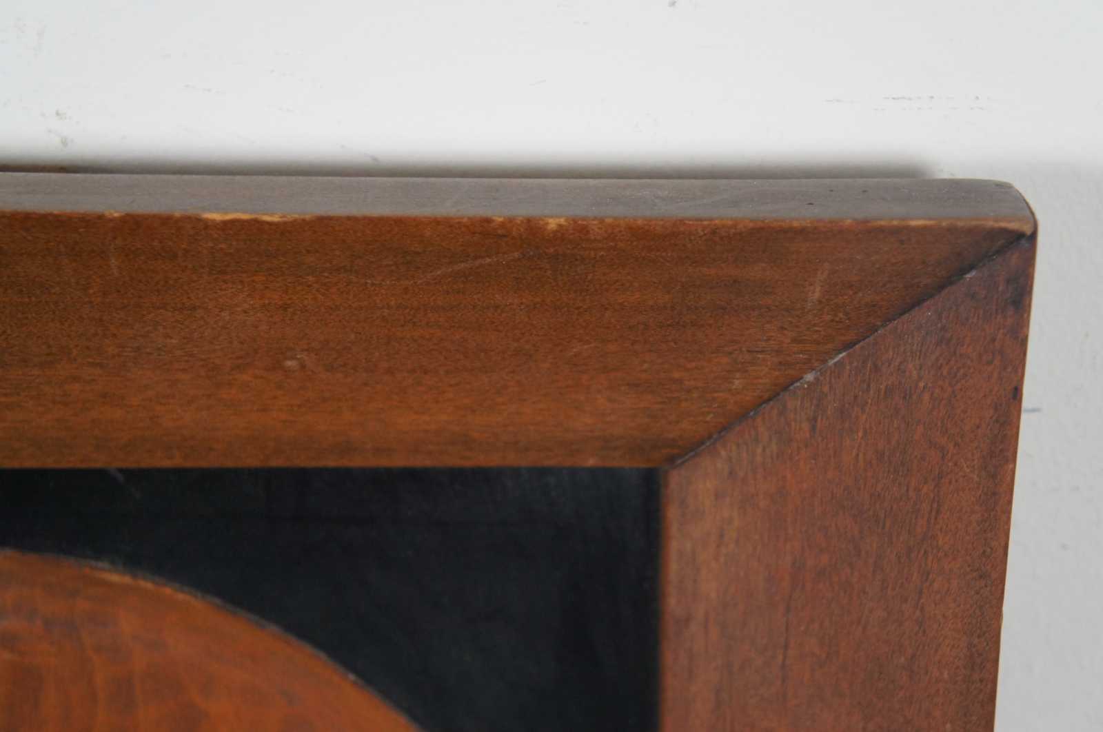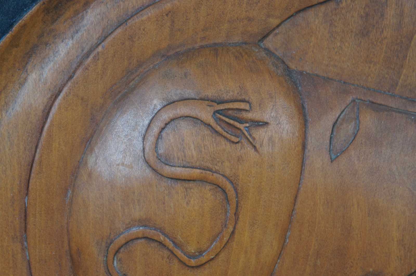 Antique 1931 hand carved wood medallion plaque showing the head of the Greek Goddess Minerva with her helmet decorated with a snake.