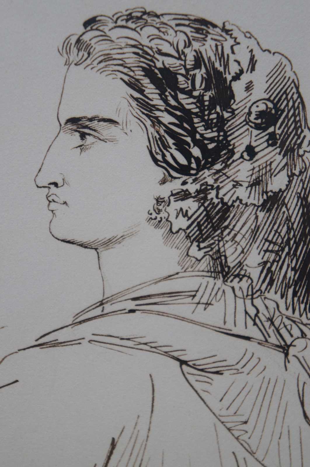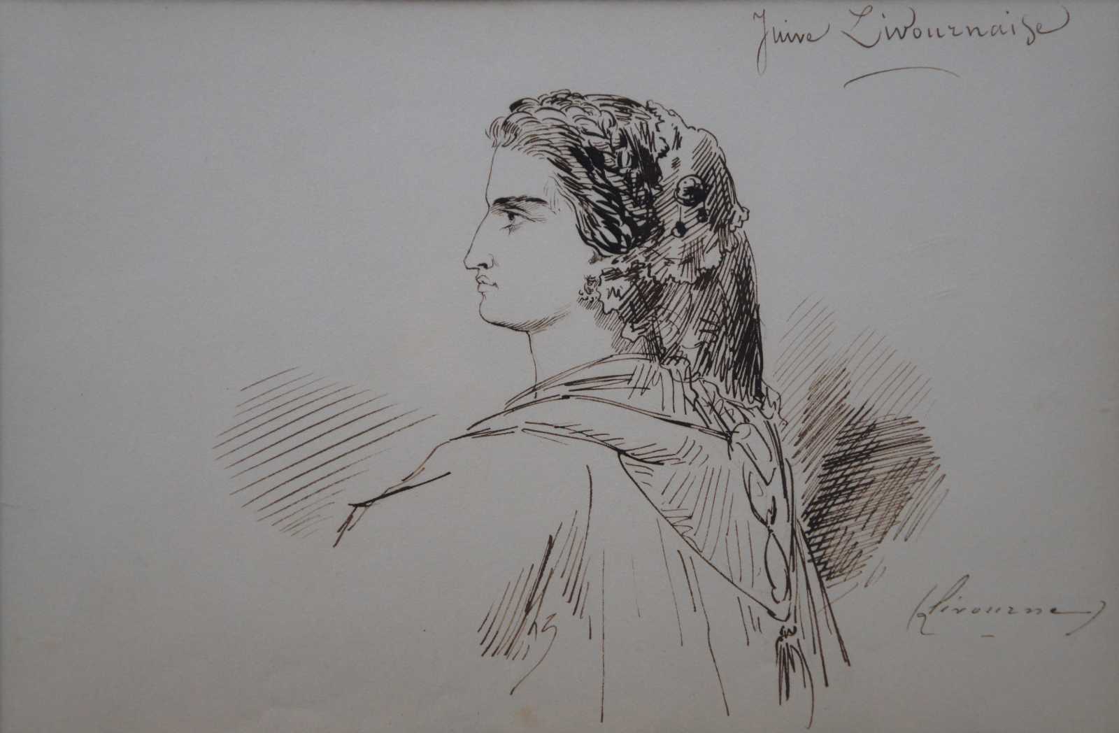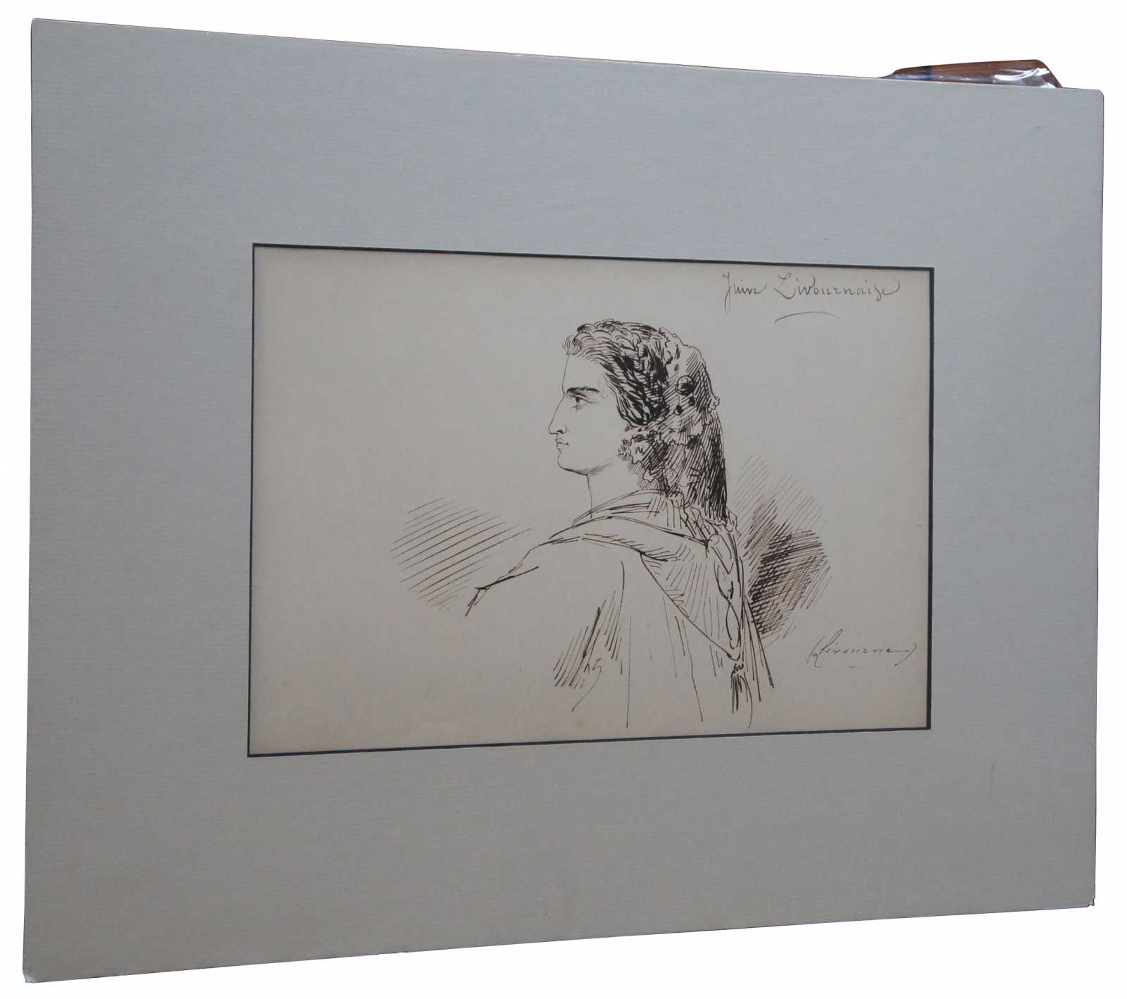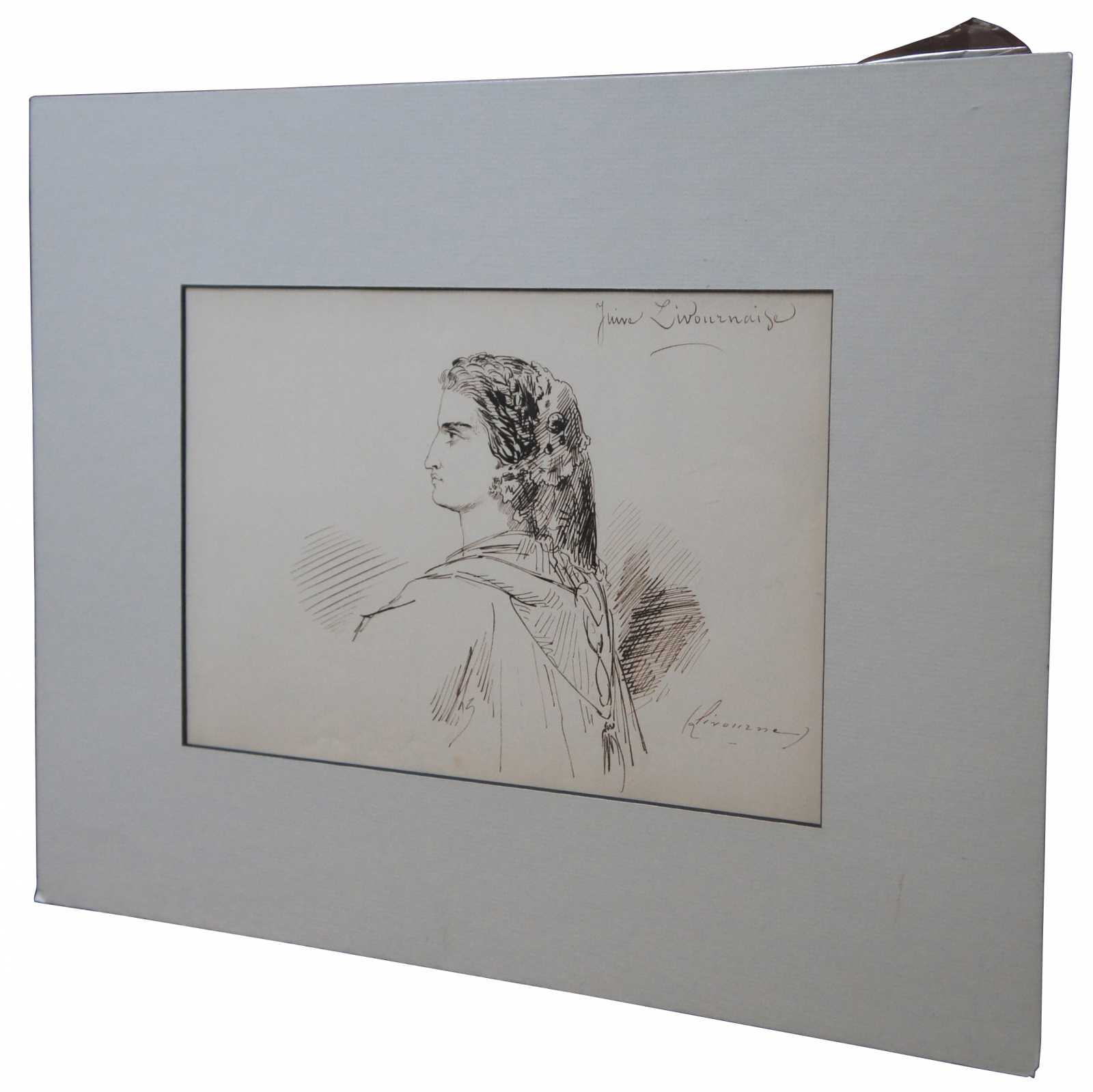 Antique 19th century ink drawing by Emile Dupont (French painter, 1822-1885) featuring a profile of a woman with strong aquiline nose, wearing a lacy veil on her hair and a shawl around her shoulders.