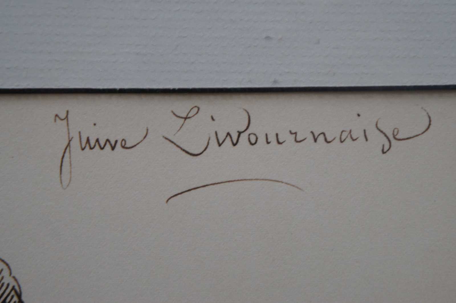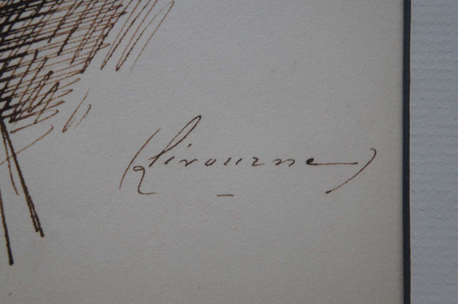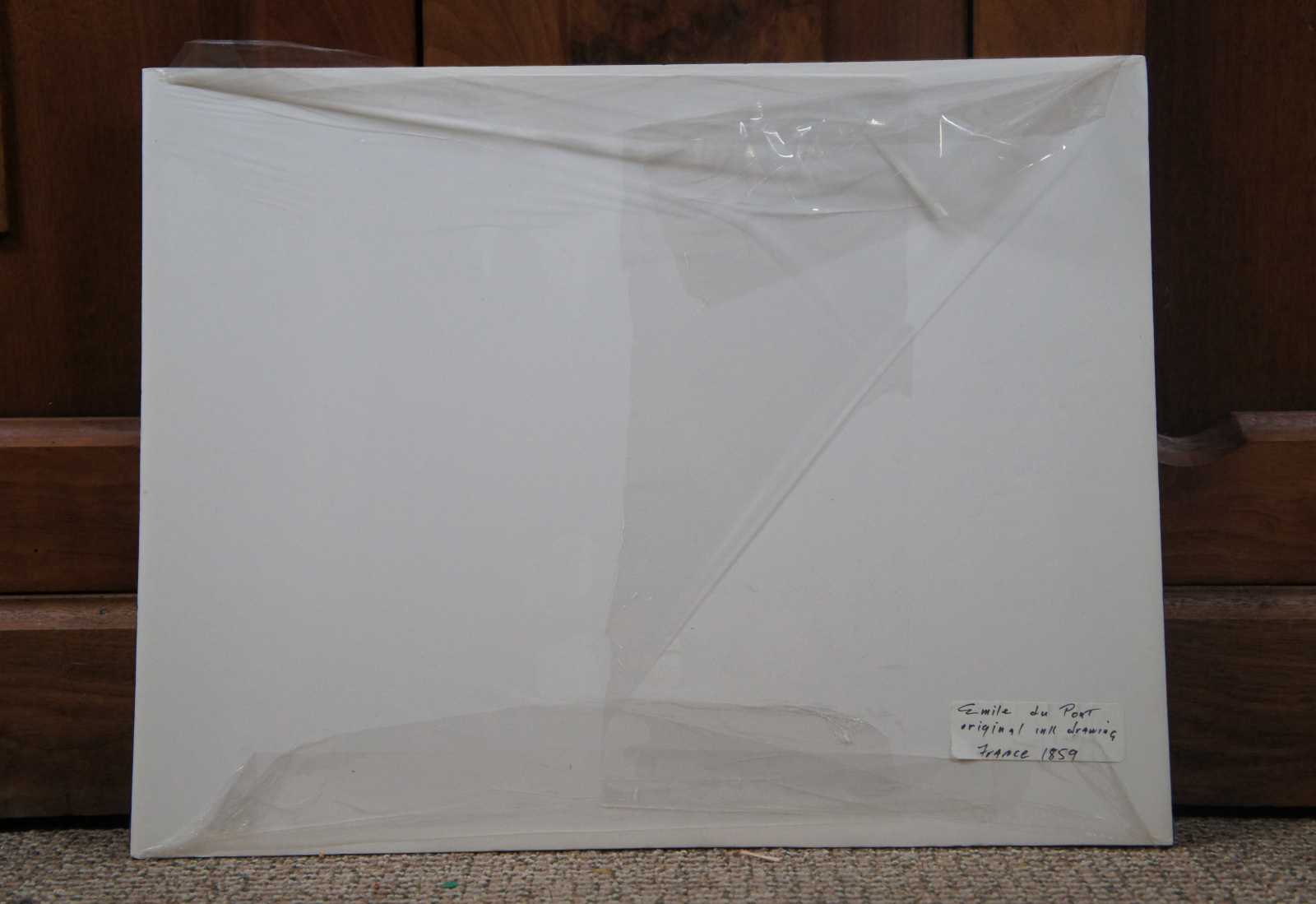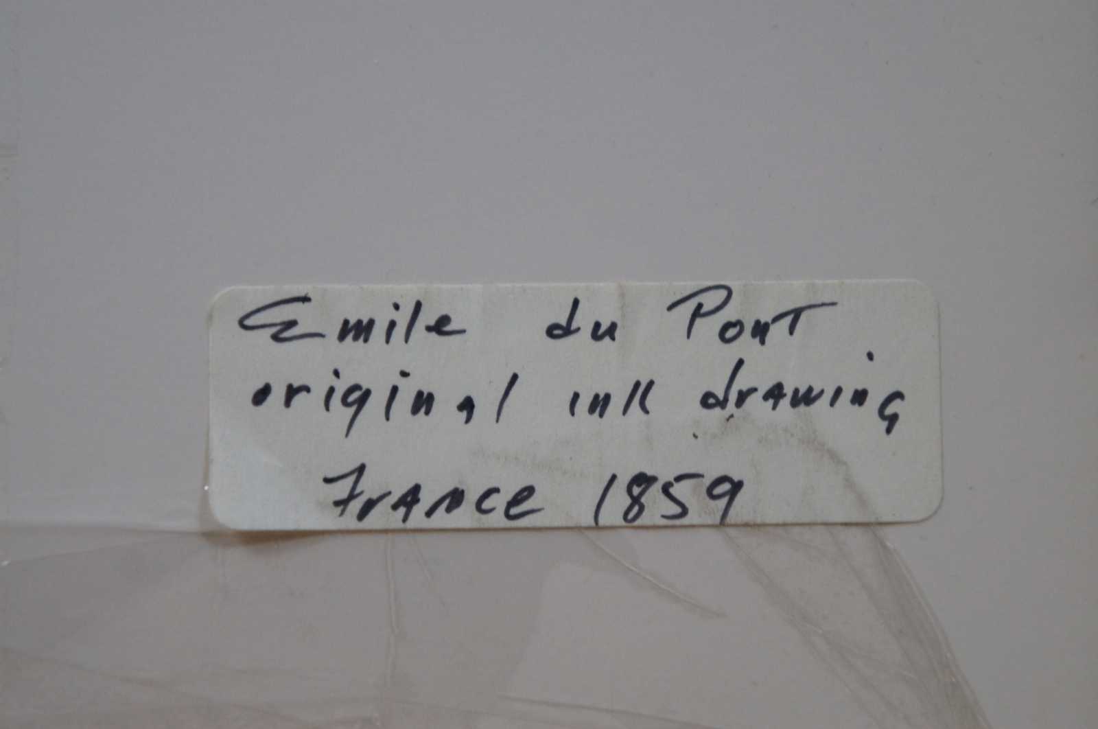 Antique 19th century ink drawing by Emile Dupont (French painter, 1822-1885) featuring a profile of a woman with strong aquiline nose, wearing a lacy veil on her hair and a shawl around her shoulders.
