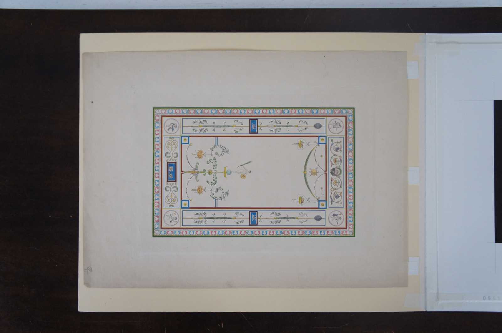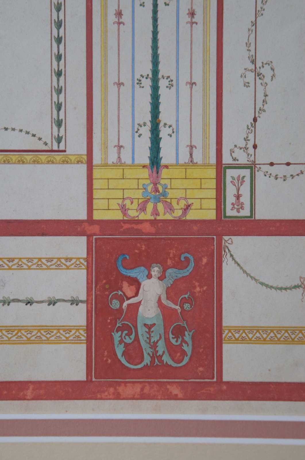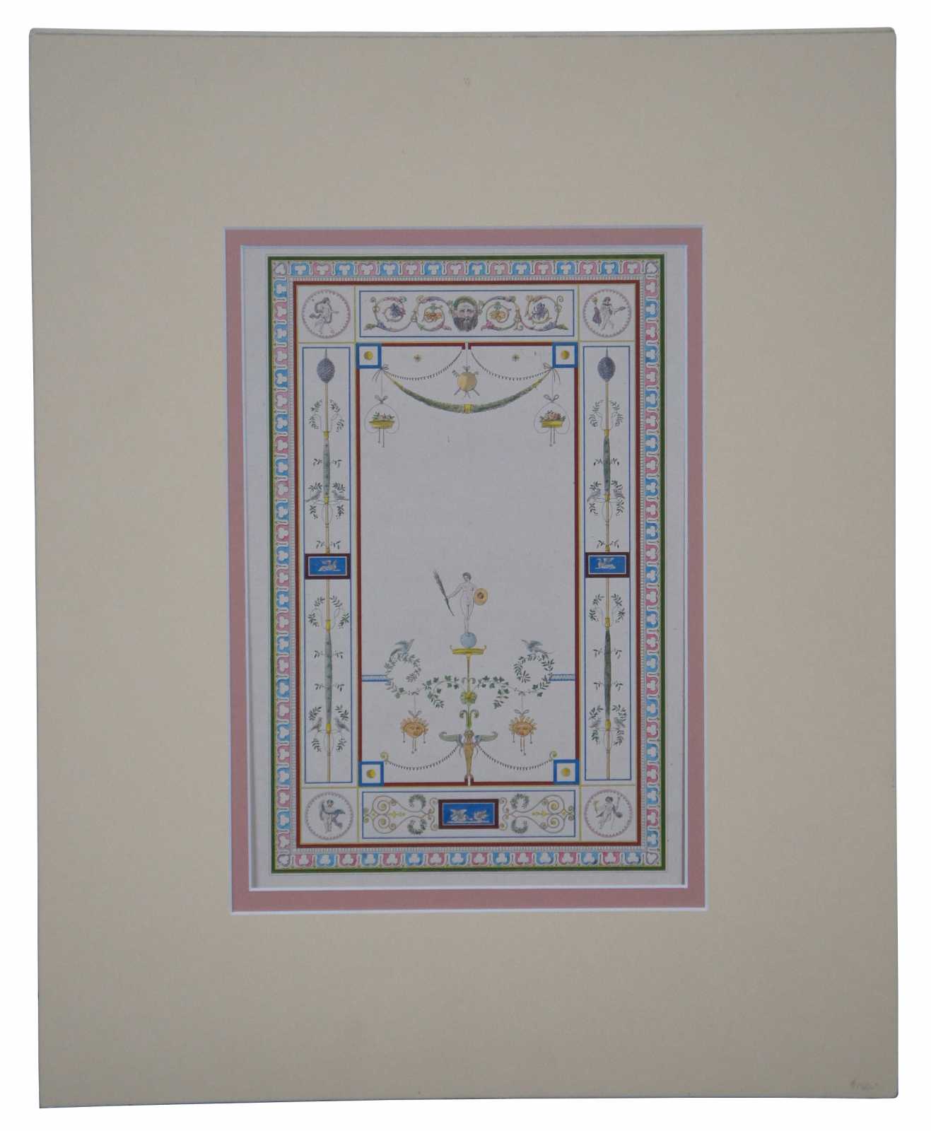 Pair of matted antique hand colored engravings from Maison du Poete Tragique a Pompei by Raoul Rochette & Jules Frédéric Bouchet. “Maison du Poete Tragique a Pompei aka The House of the Tragic Poet is a Roman house in Pompeii, Italy dating to the 2nd century BCE. The house is famous for its elaborate mosaic floors and frescoes depicting scenes from Greek mythology.” “Desire RAOUL ROCHETTE (1790-1854), French archaeologist, was born on the 9th of March 1790 at St Amand in the department of Cher, and received his education at Bourges. He was made professor of history in the College de Louis-leGrand at Paris (1813) and in the Sorbonne (1817). His critique de l'etablissement des colonies grecques (4 vols., 1815) is now out of date. He was superintendent of antiquities in the Bibliotheque at Paris (1819-48), and professor of archaeology at the Bibliotheque (from 1826), a result of which. may be seen in his Cours d'archeologie (1828). In 1829 appeared. his Monuments inedits, a work of great value at the time. Still valuable are his Peintures inddites (1836) and his Peintures de Pompdi (1844). He contributed to the Annali of the Roman Institute, the Journal des savants and the Acaddmie des inscriptions. At his death on the 3rd of July 1854 Raoul Rochette was perpetual secretary of the Academy of Fine Arts and a corresponding member of most of the learned societies in Europe.” “Jules-Frédéric Bouchet was an architect and engraver who began his career as a