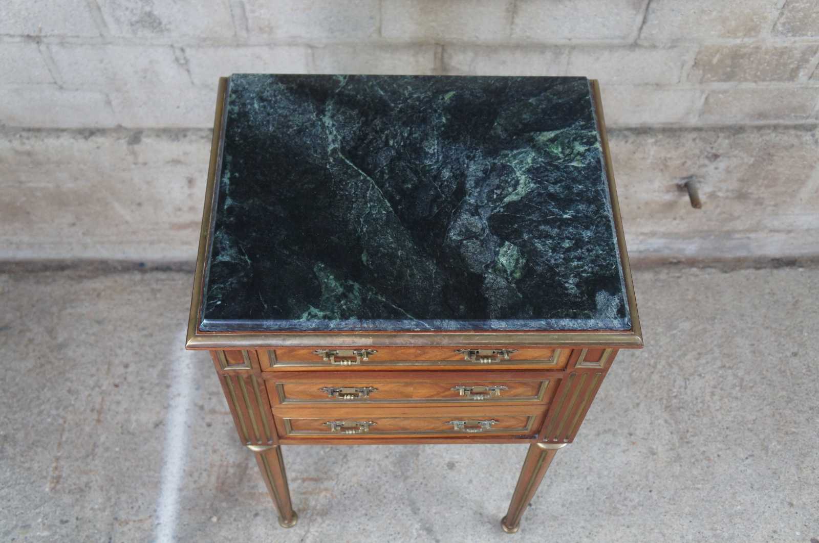 Antique 19th century Louis XV French humidor or side table. Made of walnut with matchbook parquetry veneer featuring brass inlaid accents and hardware, green marble top and tapered fluted legs. Interior humior compartment is lined with white marble and has a neat upper clasp mechanism for opening and closing the door.