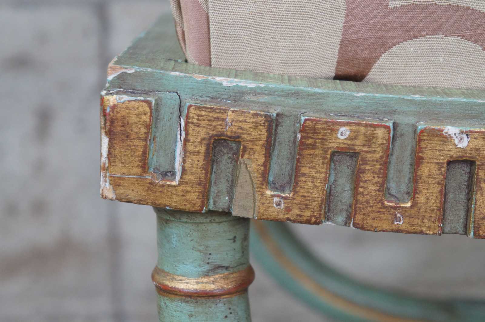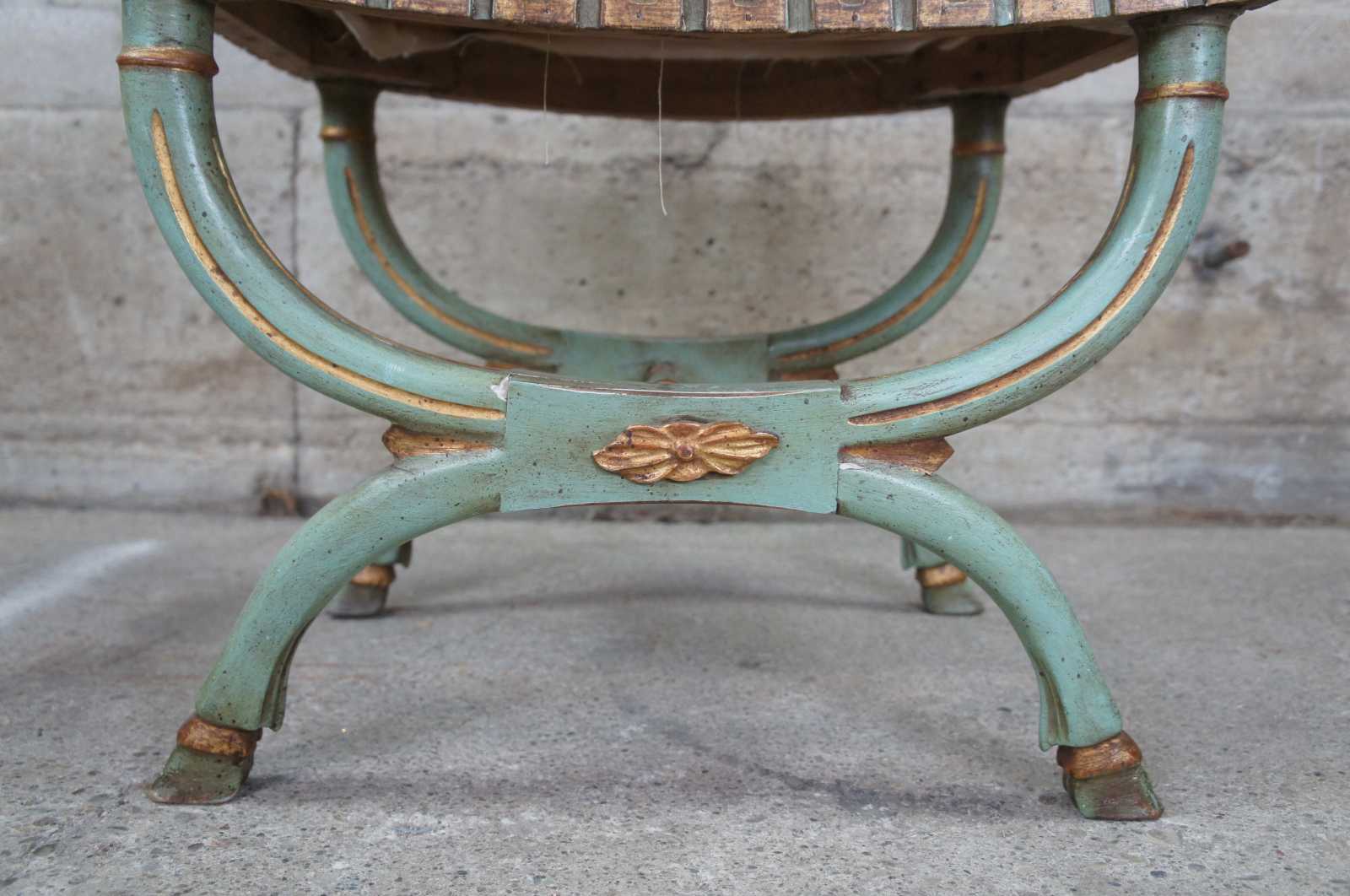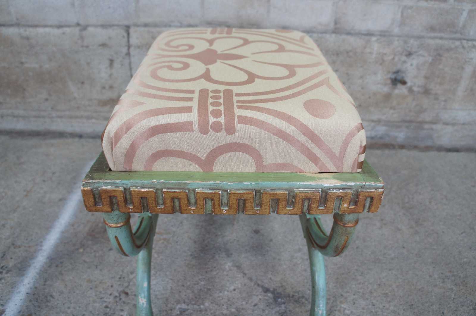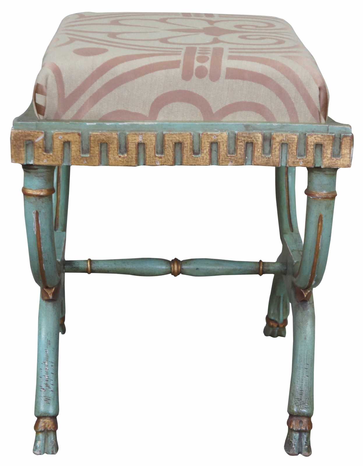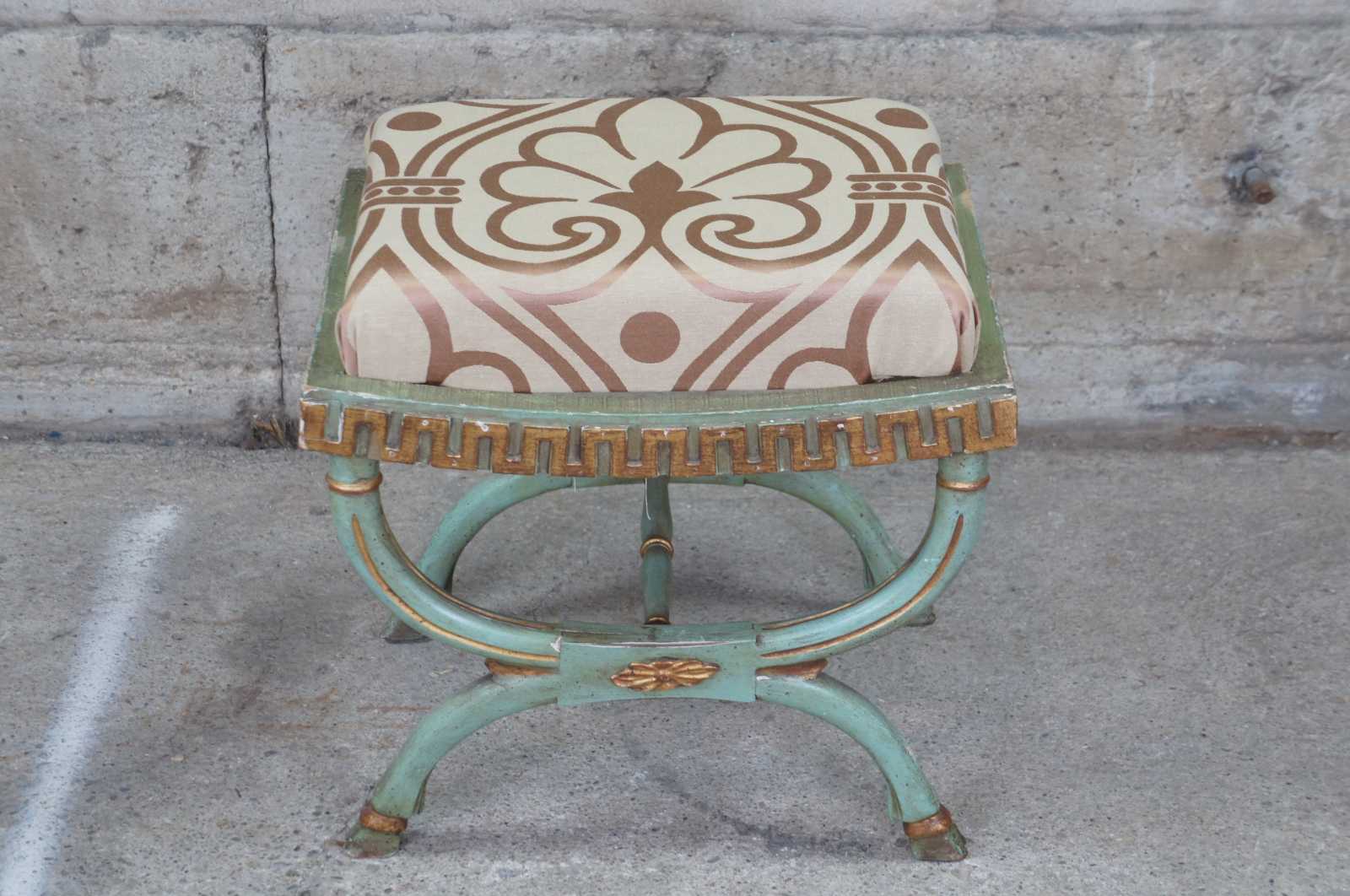 Early 20th century antique French Empire style foot stool or bench. A Bohemian green featuring the classical French X form with gold fluting and hoof feet. Upholstered with a fleur de lis fabric.
