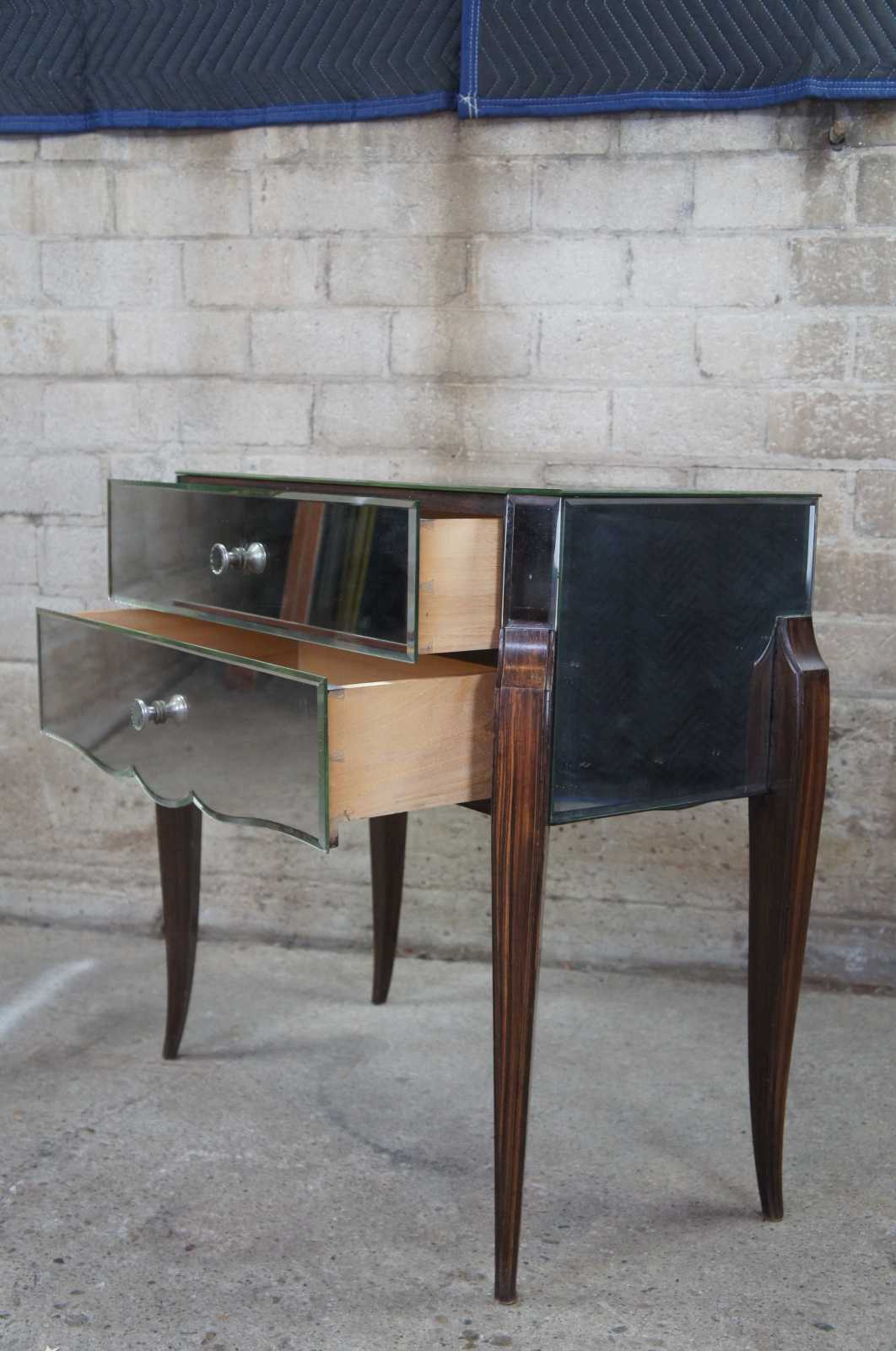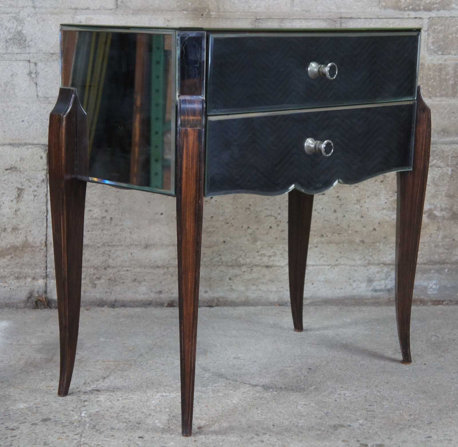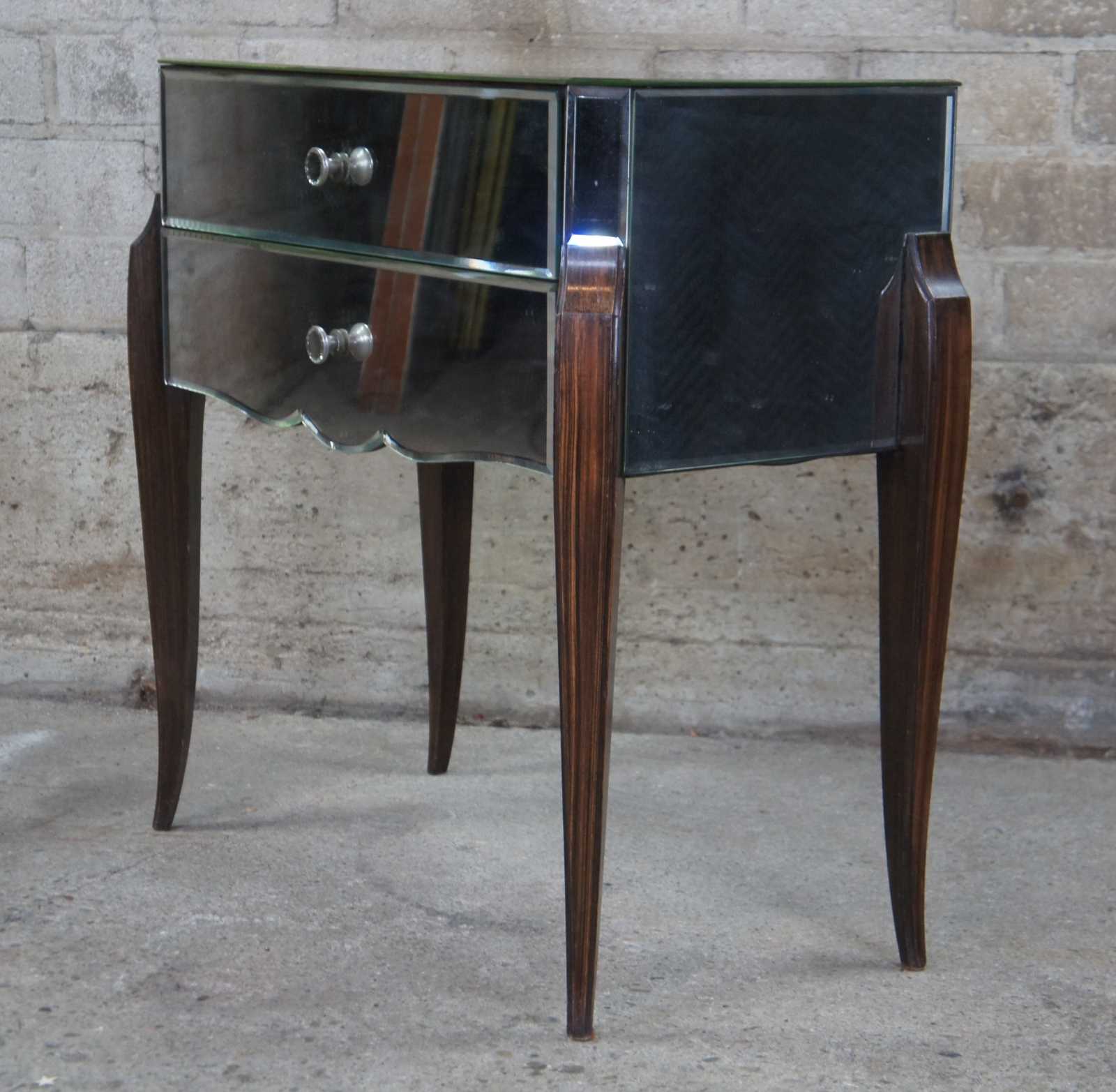 Circa 1960s French mirrored entry chest or side table. Made from Macassar Ebony with beuatifuly cut and bevelled glass panels. Features 2 drawers with old world dovetailing.