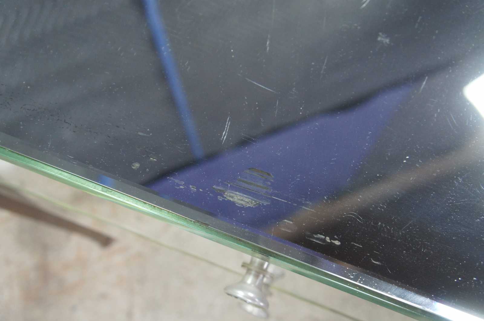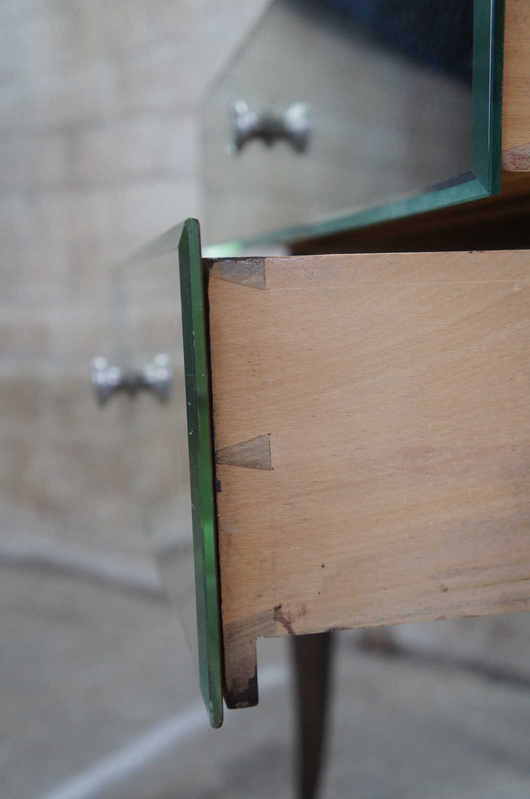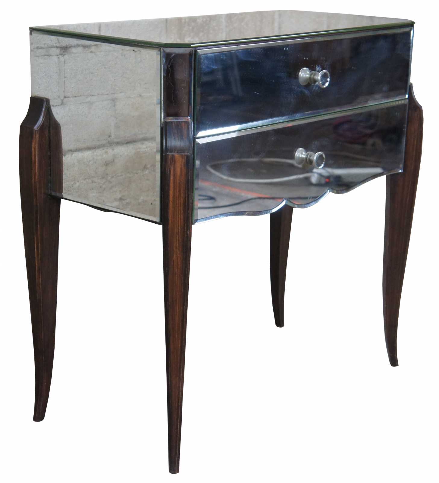 Circa 1960s French mirrored entry chest or side table. Made from Macassar Ebony with beuatifuly cut and bevelled glass panels. Features 2 drawers with old world dovetailing.