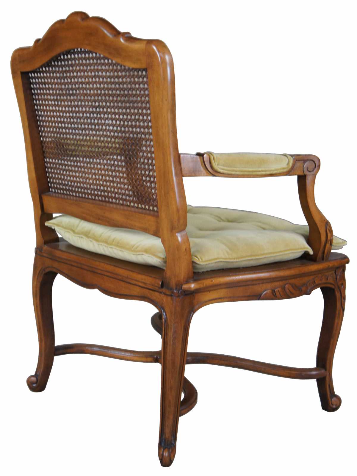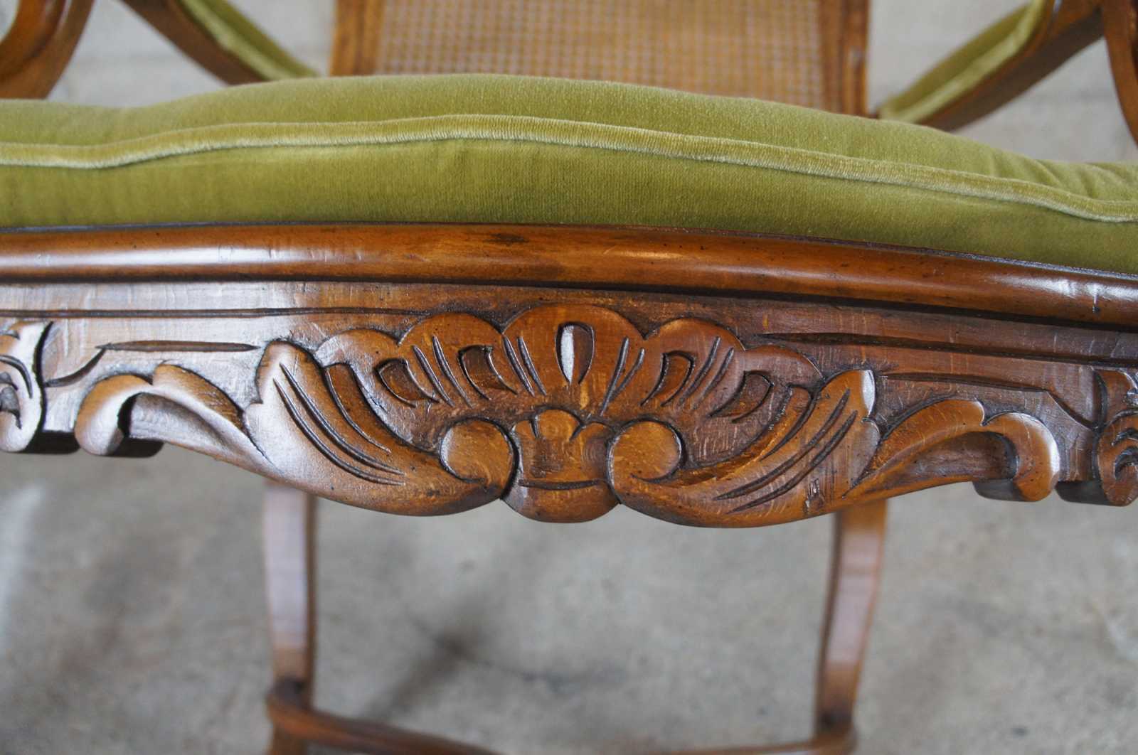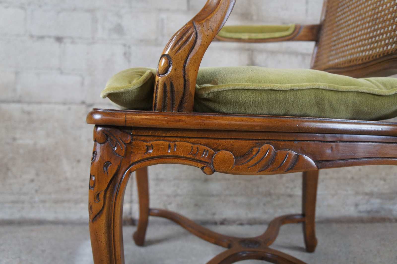 Circa 1970s Hammary Arm Chair. French Louis XV/ Provincial styling with a carved foliate and cane back over uphosltered green arms and tufted seat. The body of the chair features beautiful scalloping over cabriole legs connected by an X stretcher.