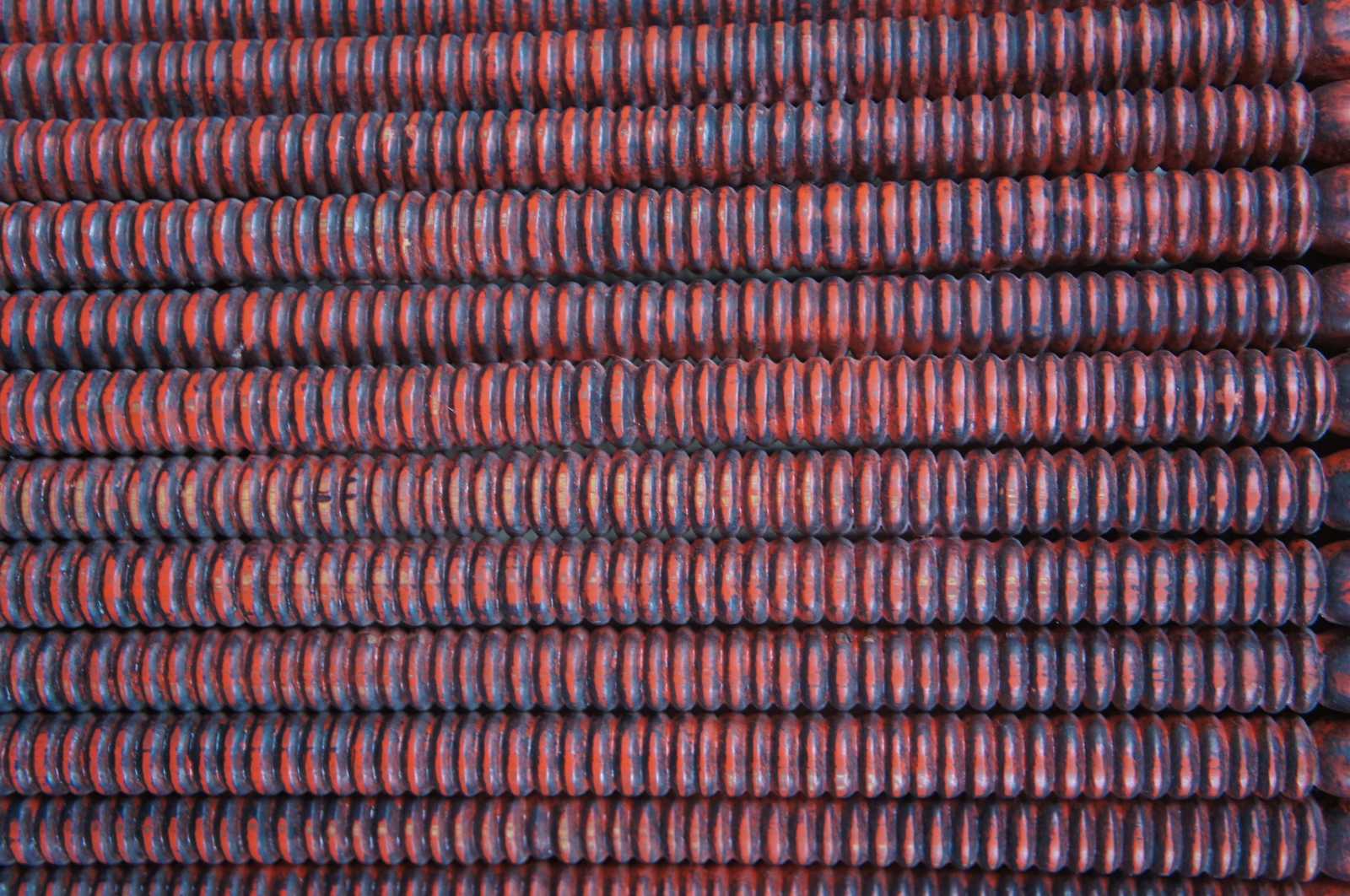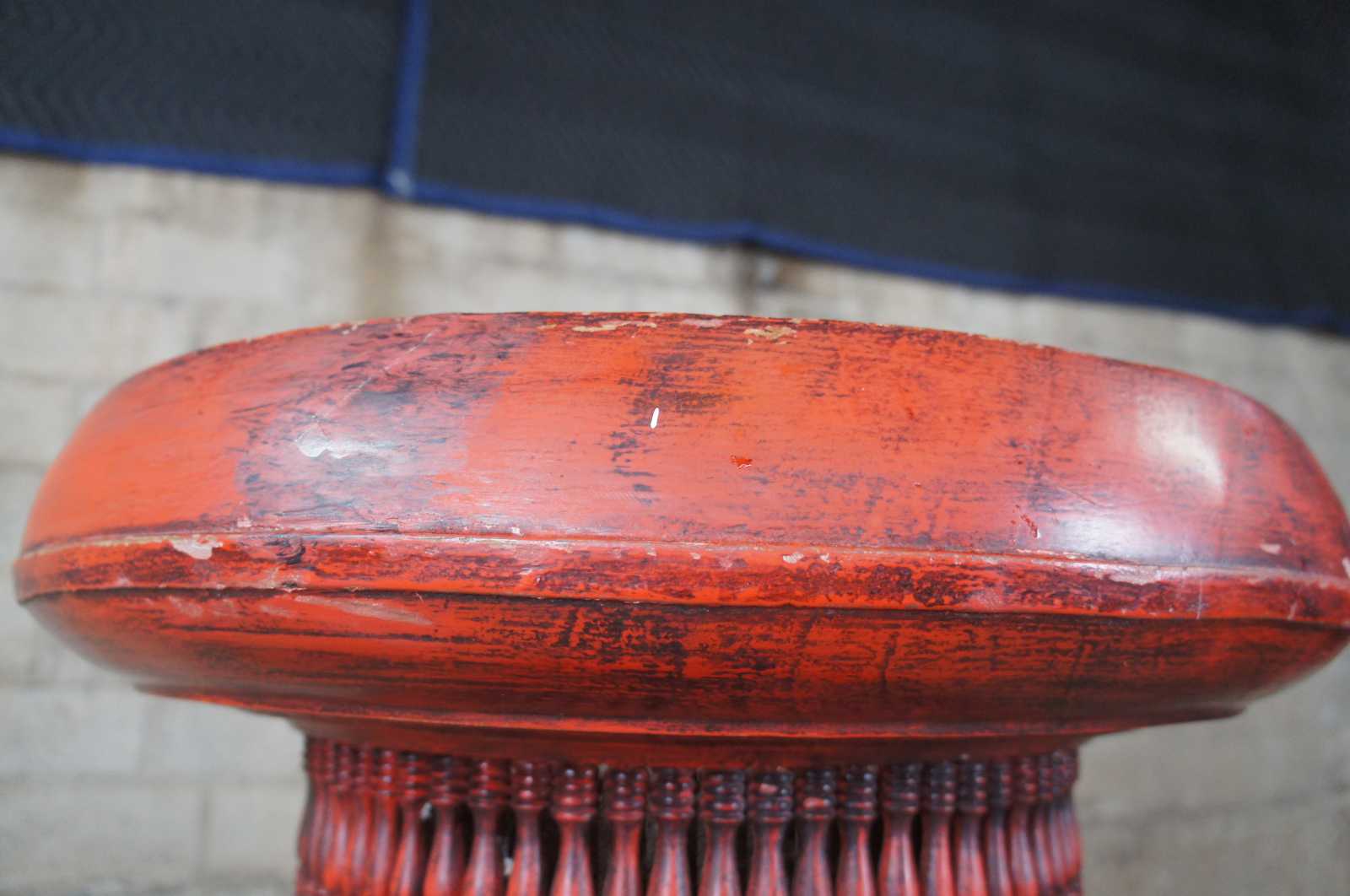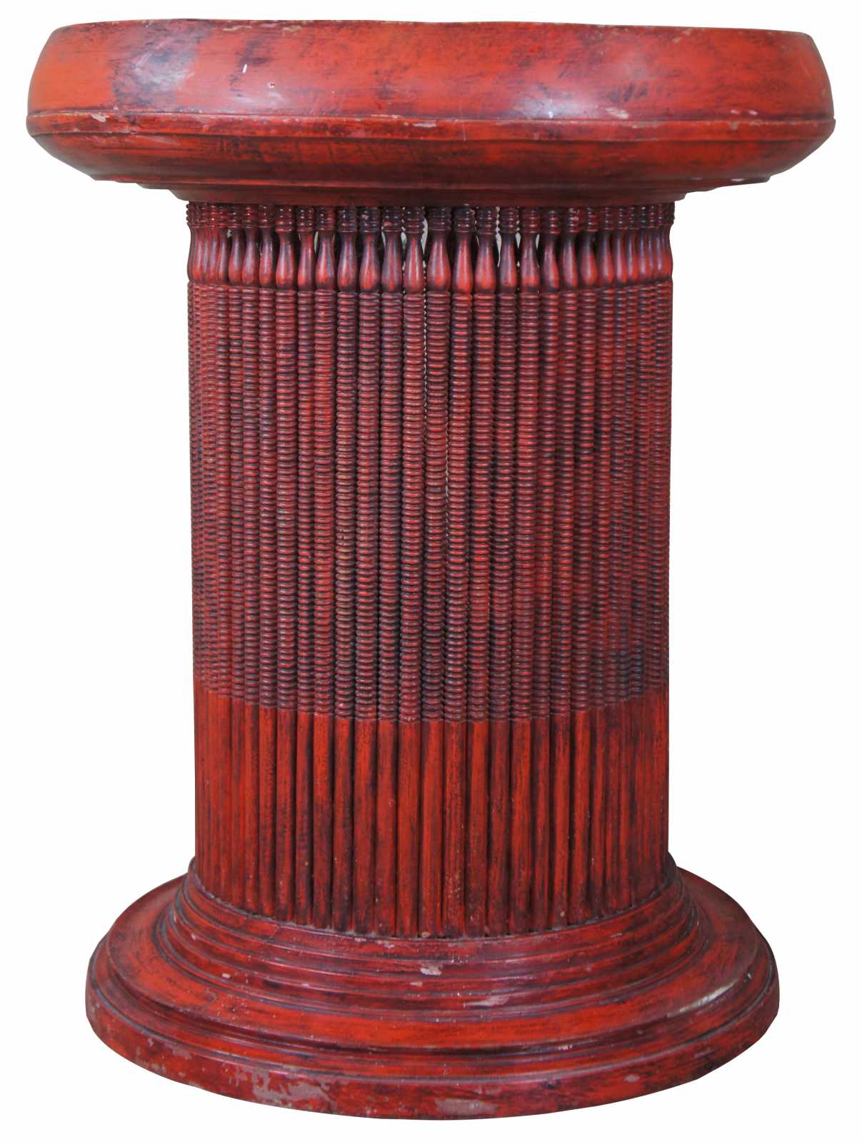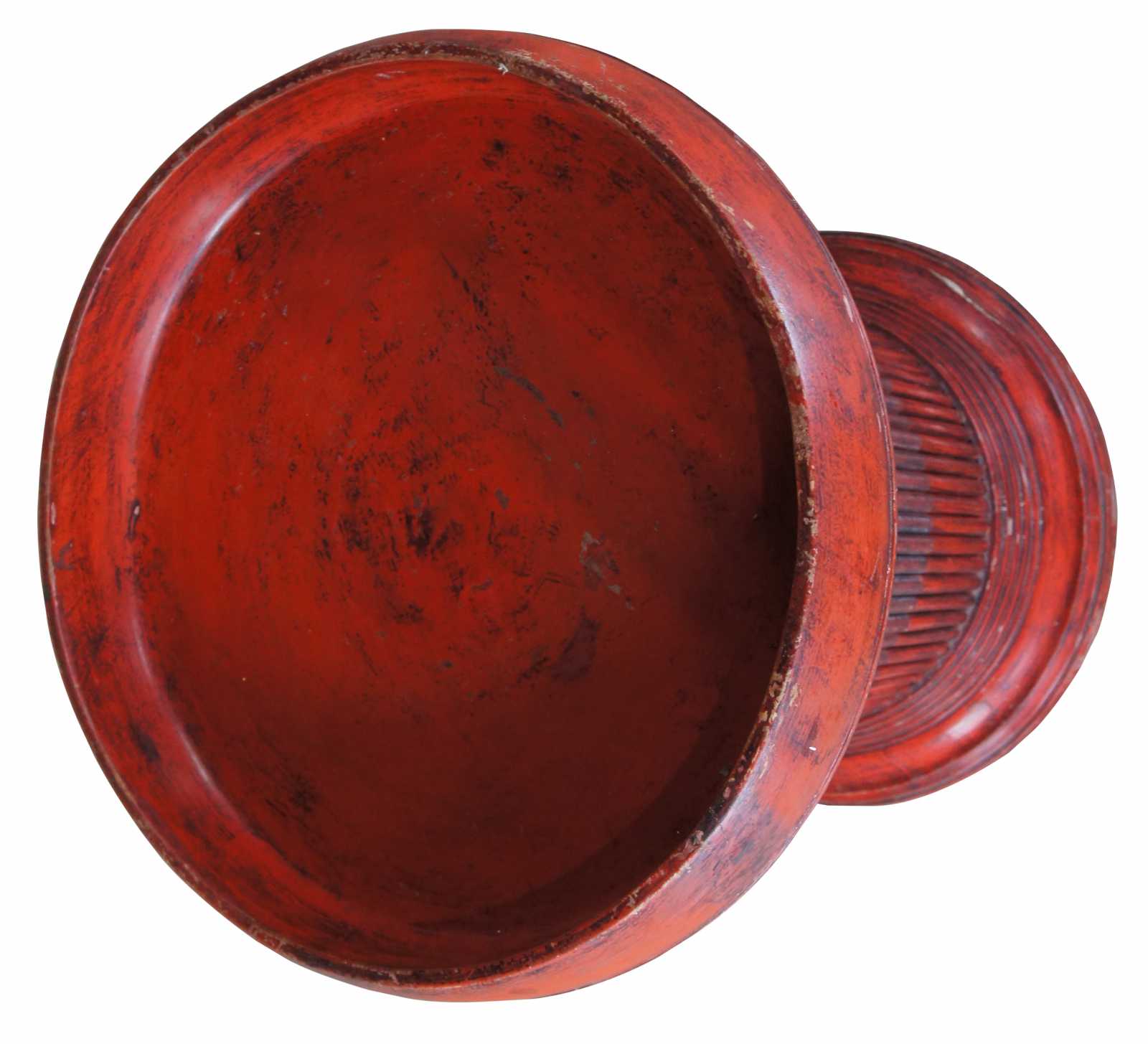 A very unique primitive red painted folk art bowl or tray top table or base. Features a round bowl shaped top compartment supported by turned ribbed columns arranged in a fluted circle over a pedestal base.