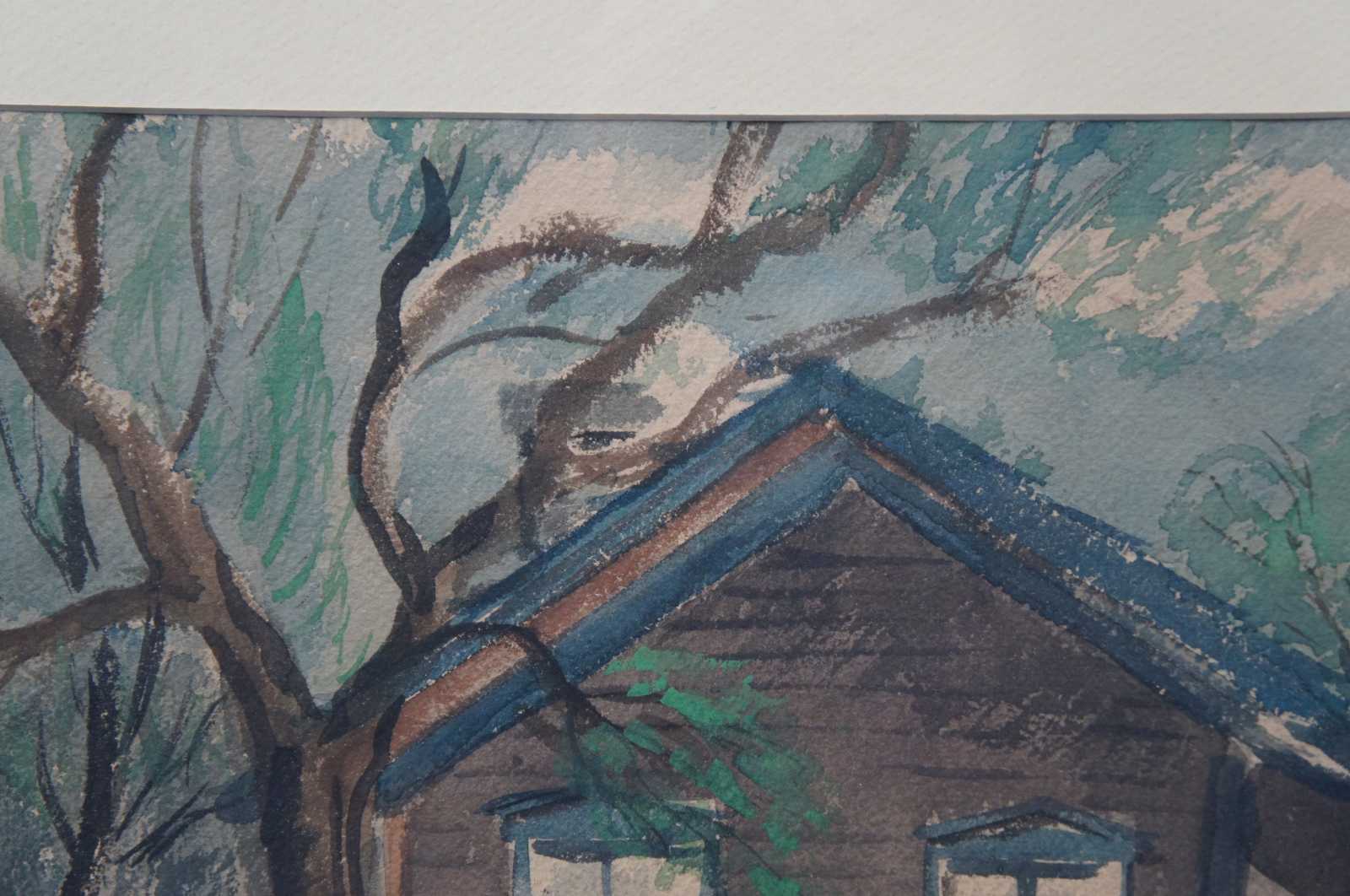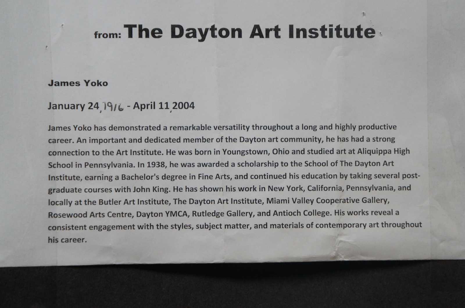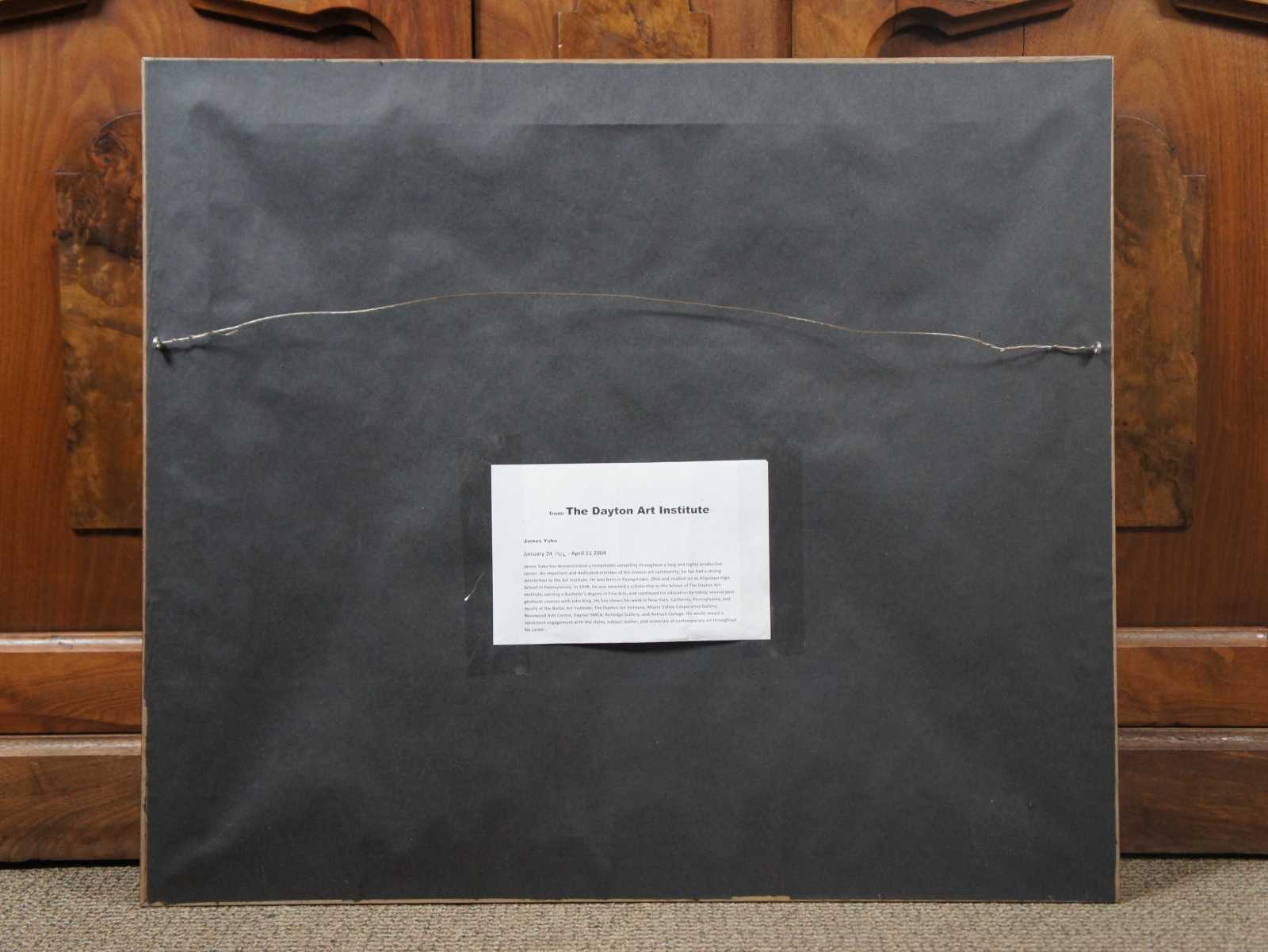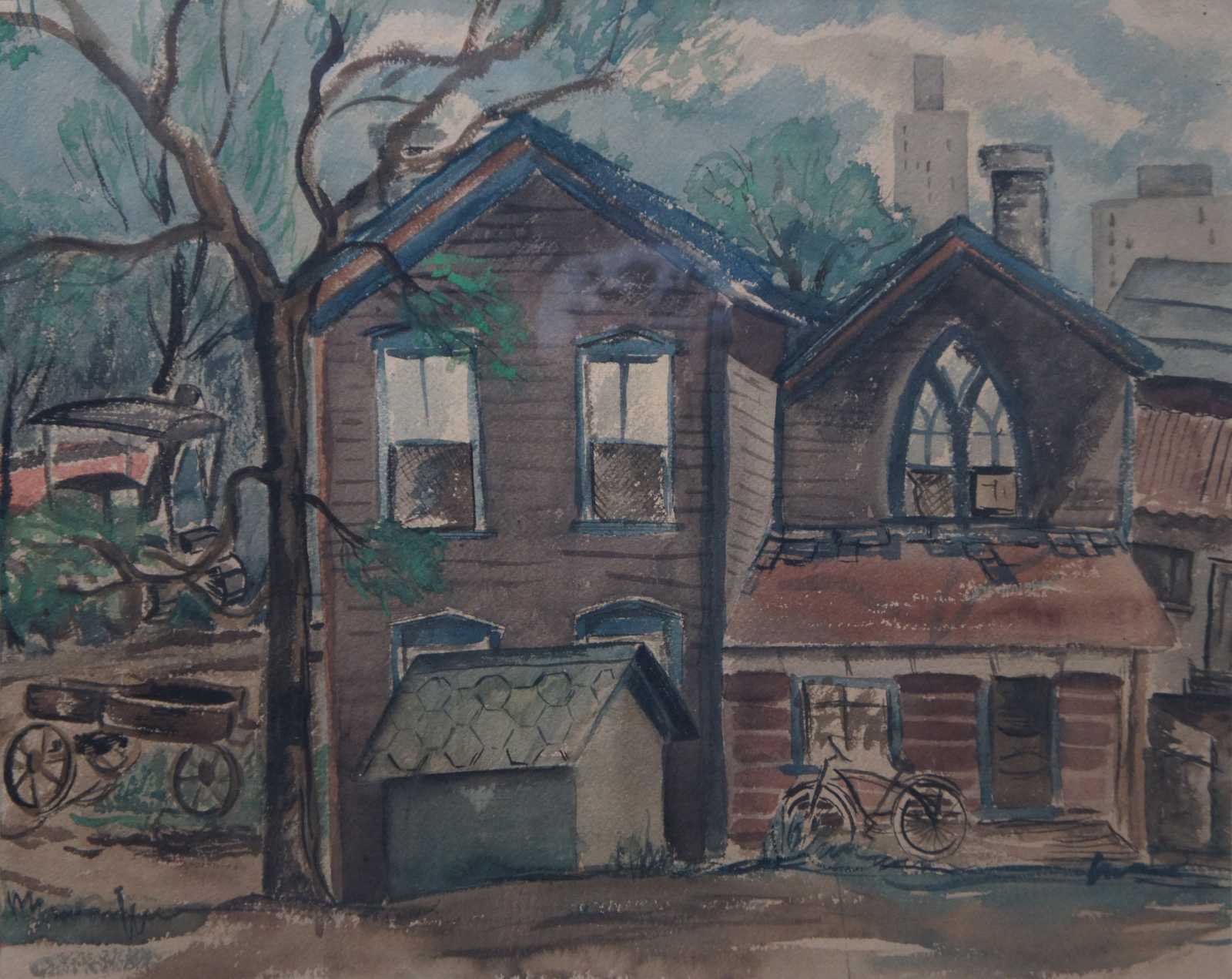 Framed original watercolor painting by James Yoko, showing a simple clapboard house with a bicycle on the porch and two wagons or carts in the side yard with taller city buildings in the background. “James Yoko (January 24, 1916 – April 11, 2004) has demonstrated a remarkable versatility throughout a long and highly productive career. An important and dedicated member of the Dayton art community, he has had a strong connection to the dayton Art Institute. He was born in Youngstown, Ohio and studied art at Aliquippa High School in Pennsylvania. In 1938, he was awarded a scholarship to the School of the Dayton art Institute, earning a Bachelor’s degree in Fine Arts, and continued his education by taking several post-graduate courses with John King. He has shown his work in New York, California, Pennsylvania, and locally at the Butler Art Institute, the Dayton Art Institute, Miami Valley Cooperative Gallery, Rosewood Arts Center, Dayton YMCA, Rutledge Gallery, and Antioch College. His works reveal a consistent engagement with the styles, subject matter and materials of contemporary art throughout his career.”