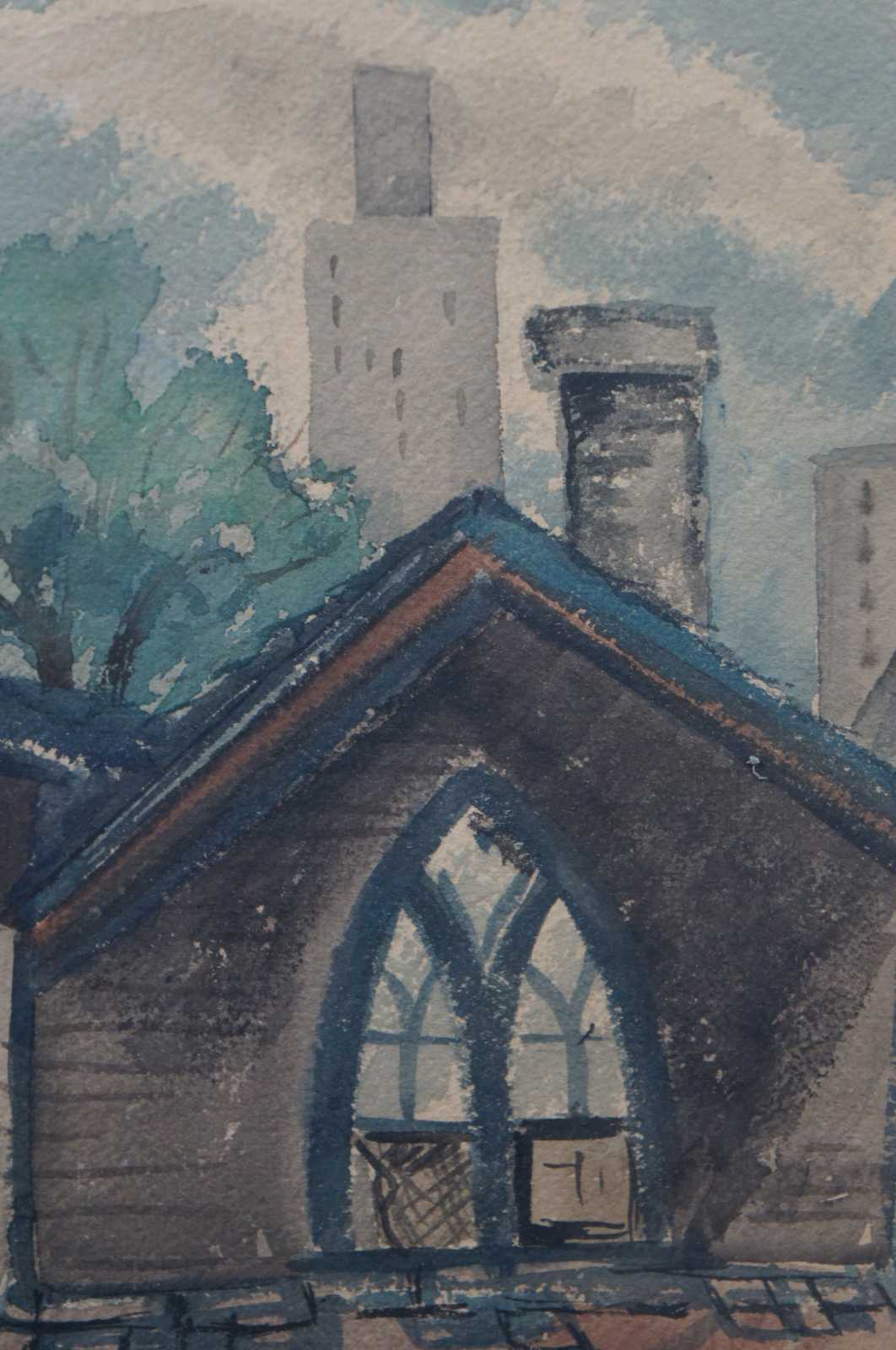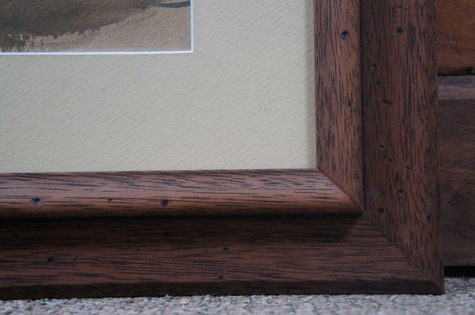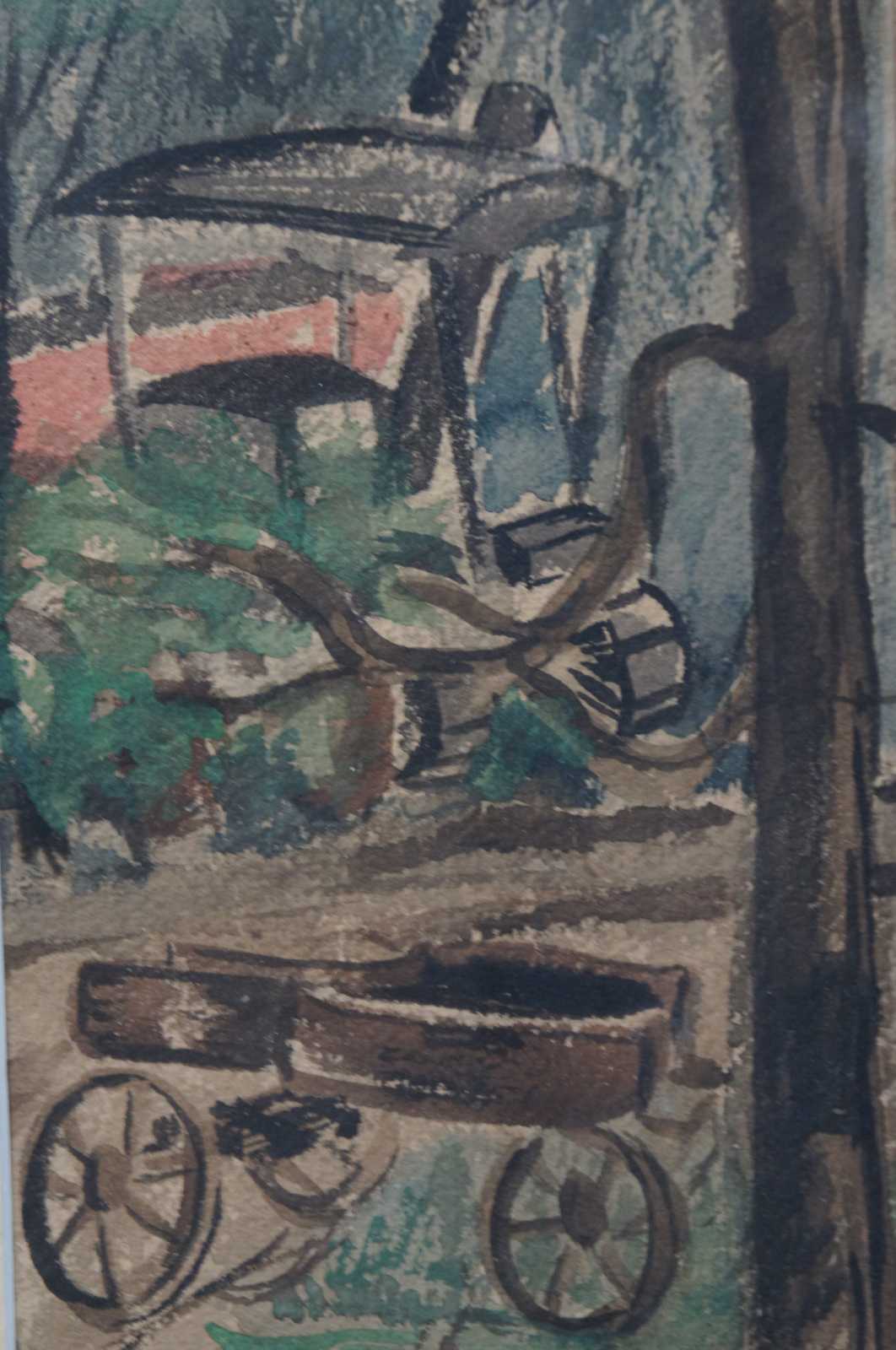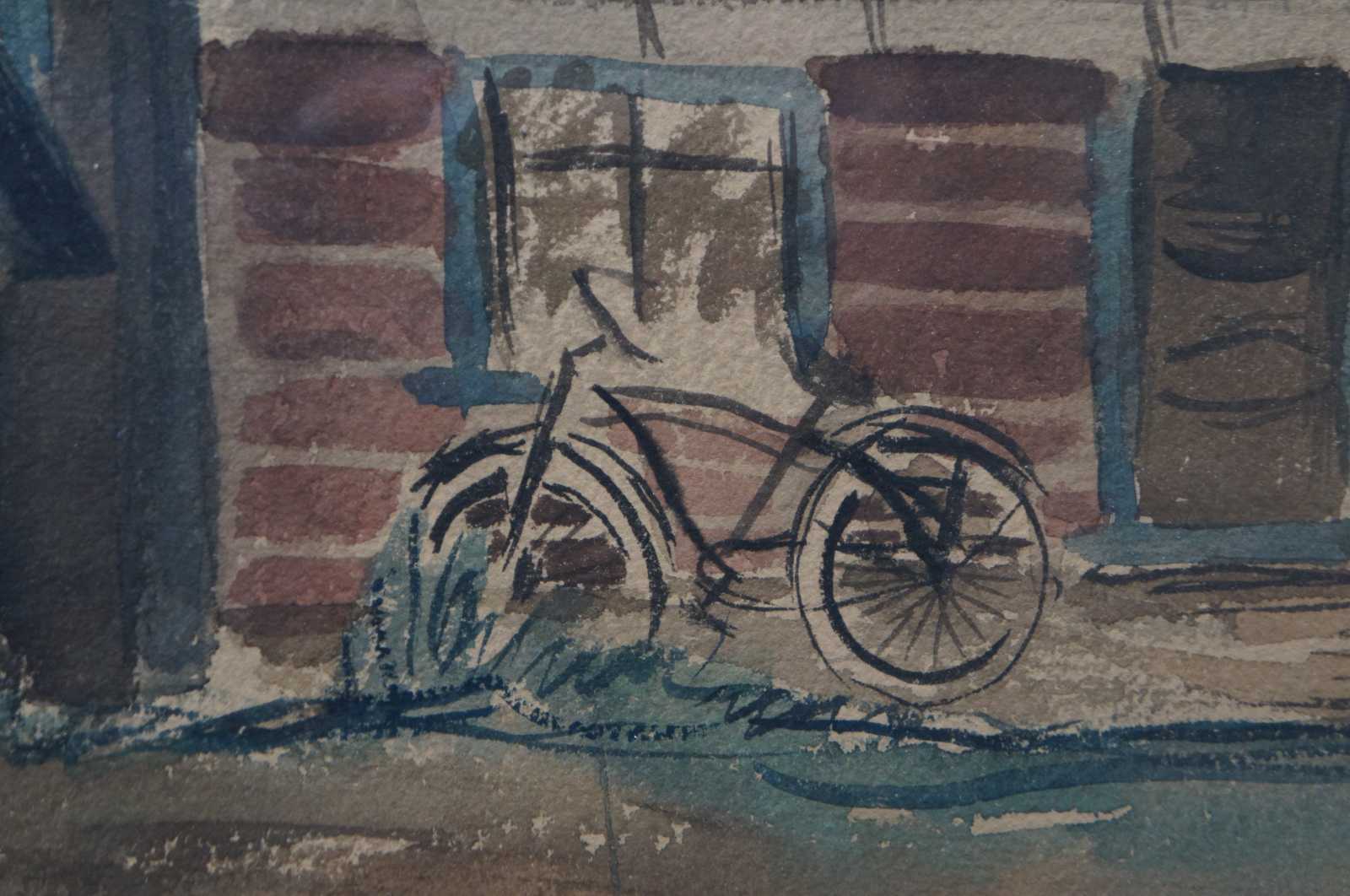 Framed original watercolor painting by James Yoko, showing a simple clapboard house with a bicycle on the porch and two wagons or carts in the side yard with taller city buildings in the background. “James Yoko (January 24, 1916 – April 11, 2004) has demonstrated a remarkable versatility throughout a long and highly productive career. An important and dedicated member of the Dayton art community, he has had a strong connection to the dayton Art Institute. He was born in Youngstown, Ohio and studied art at Aliquippa High School in Pennsylvania. In 1938, he was awarded a scholarship to the School of the Dayton art Institute, earning a Bachelor’s degree in Fine Arts, and continued his education by taking several post-graduate courses with John King. He has shown his work in New York, California, Pennsylvania, and locally at the Butler Art Institute, the Dayton Art Institute, Miami Valley Cooperative Gallery, Rosewood Arts Center, Dayton YMCA, Rutledge Gallery, and Antioch College. His works reveal a consistent engagement with the styles, subject matter and materials of contemporary art throughout his career.”