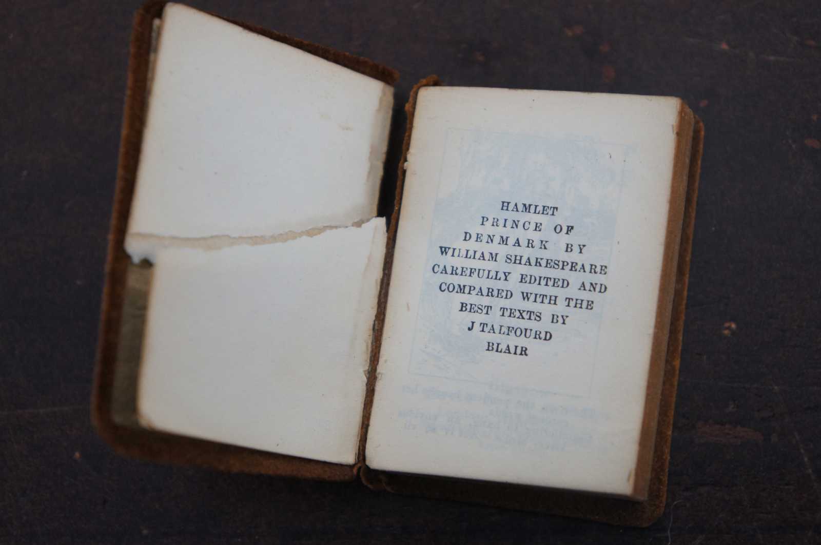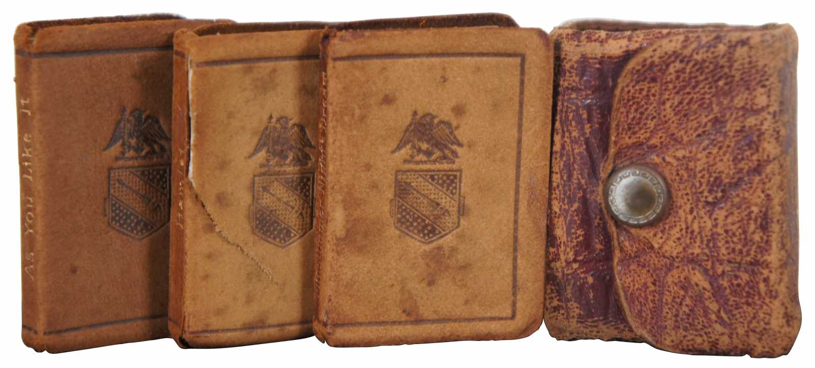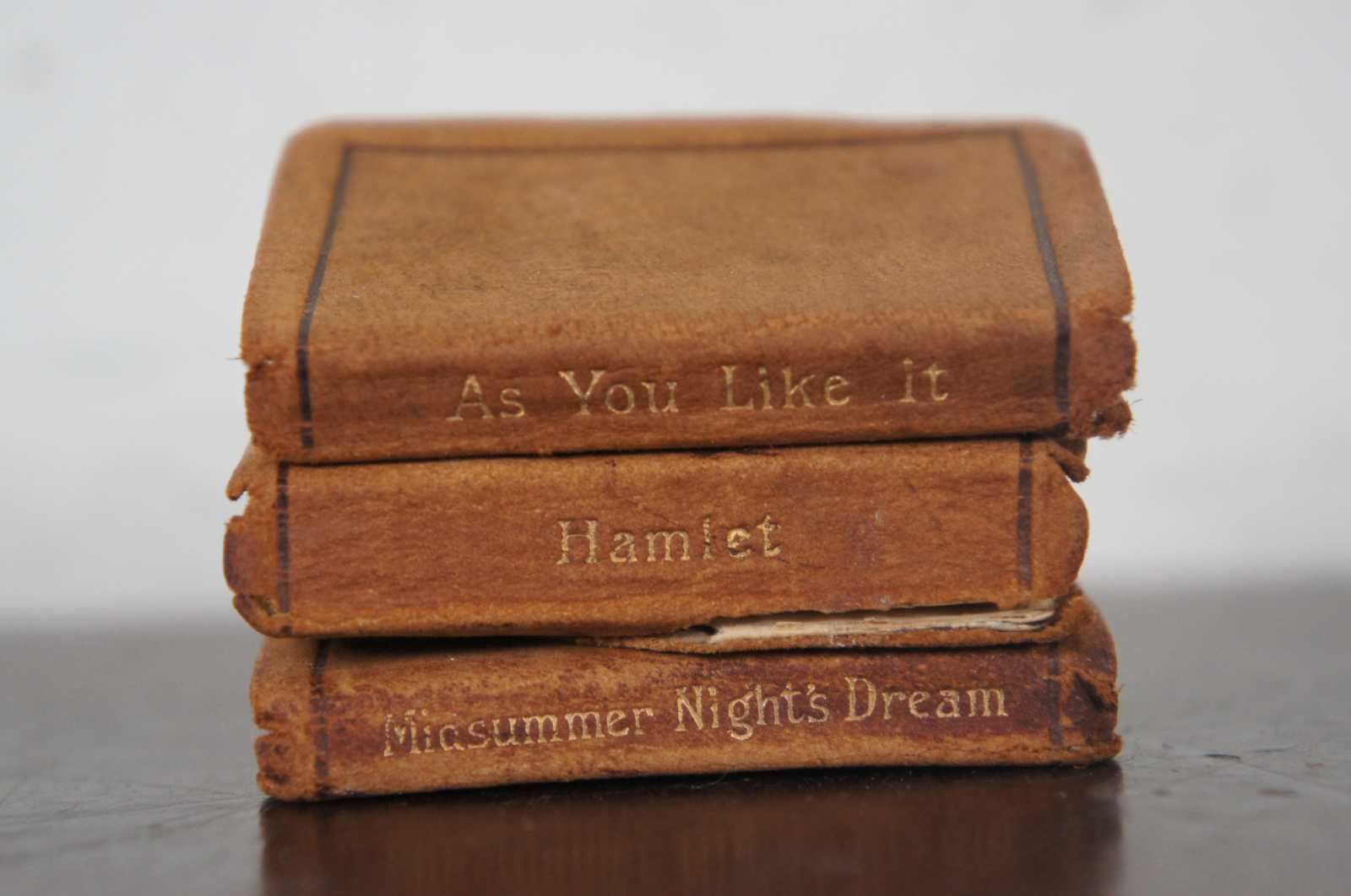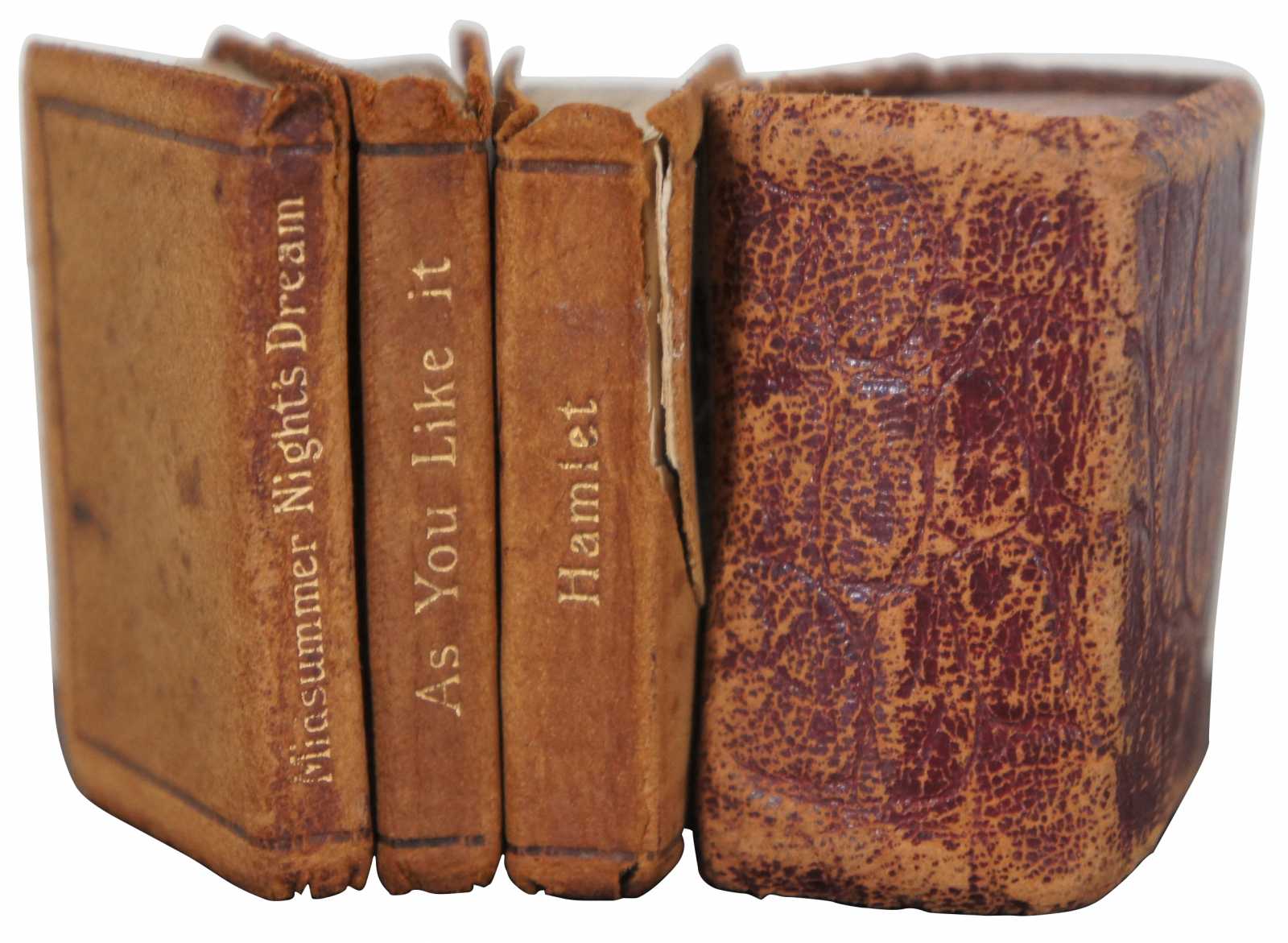 Set of four antique miniature leather bound books: The Little Webster Dictionary – 18,000 words, produced by the Tiny Book & Novelty Co; Shakespeare’s Hamlet, As You Like It, and A Midsummer Night’s Dream edited by J. Talfourd Blair.