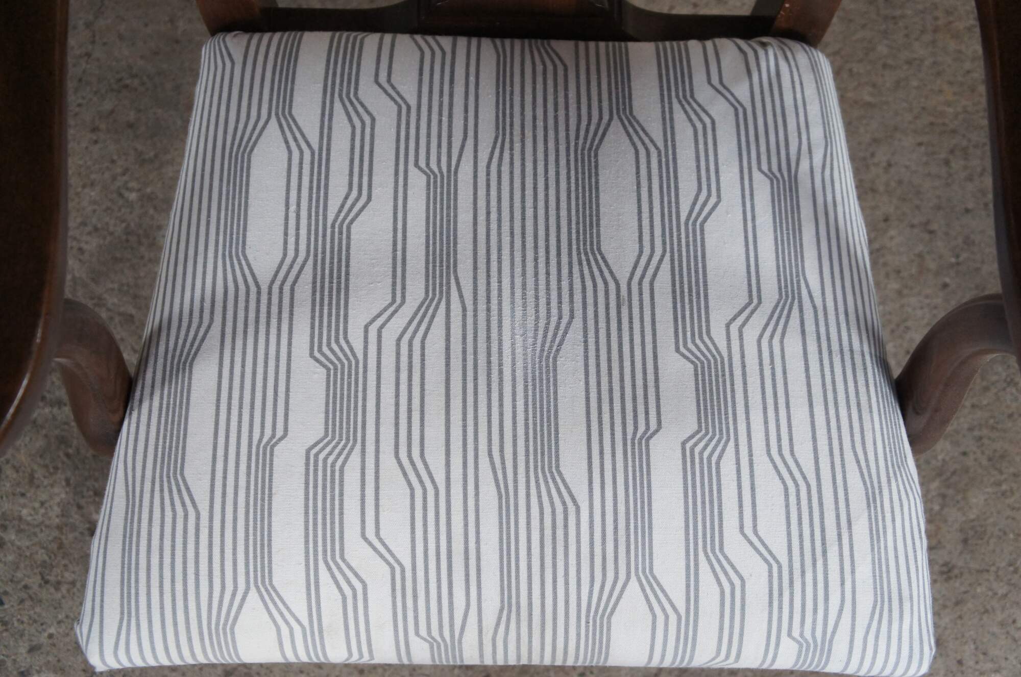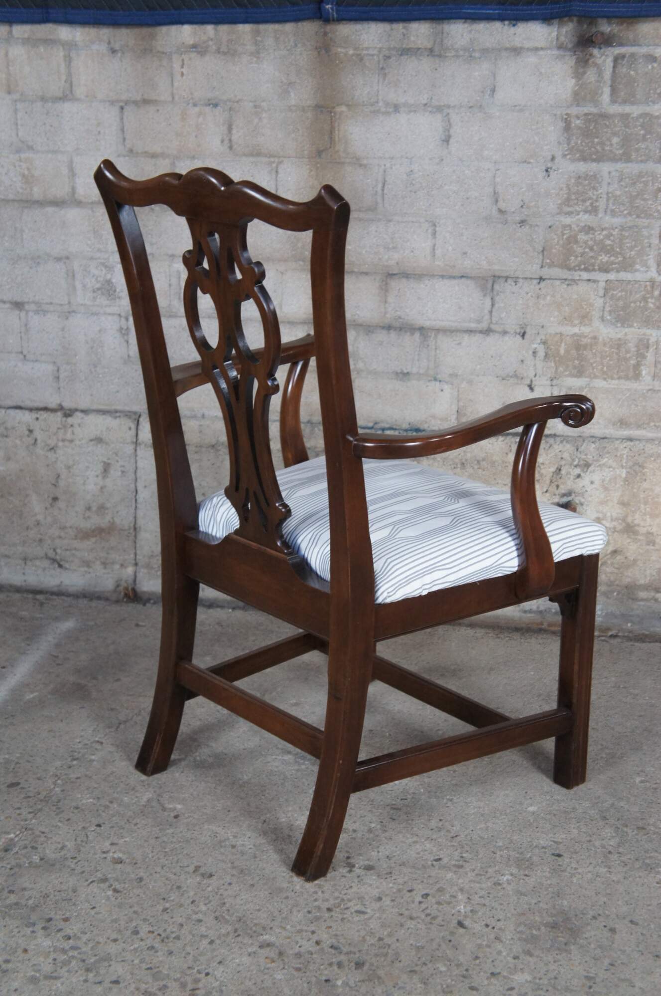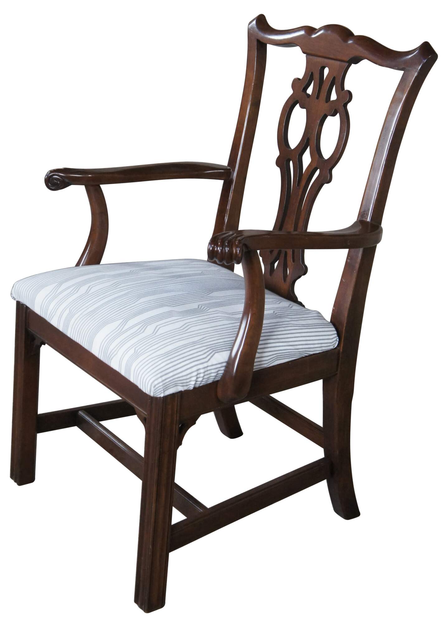 Ethan Allen Splat Back Chippendale Chair, 11-6060A. Part of the Georgian Court Collection. Made from cherry with a serpentine crest rail over pierced splat back and countoured arms. The chair is supported by straight legs with fluted accents. Seat is upholstered in a striped fabric. Circa 1980s