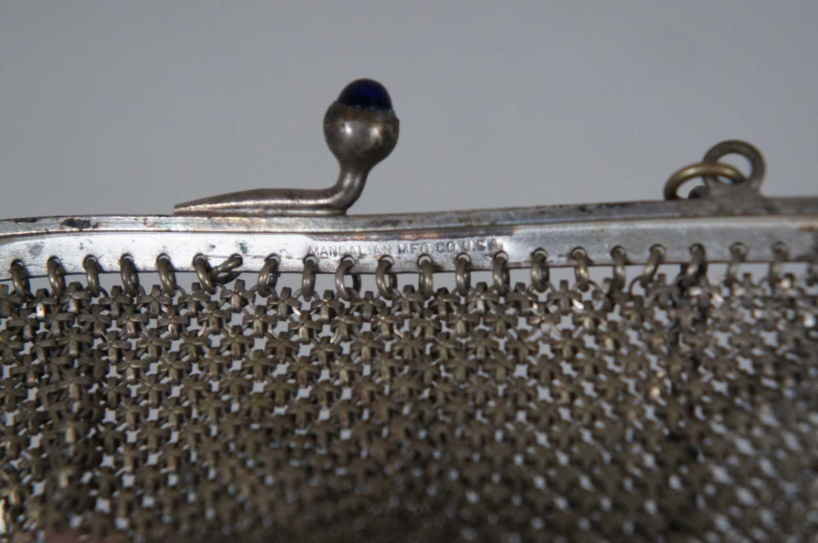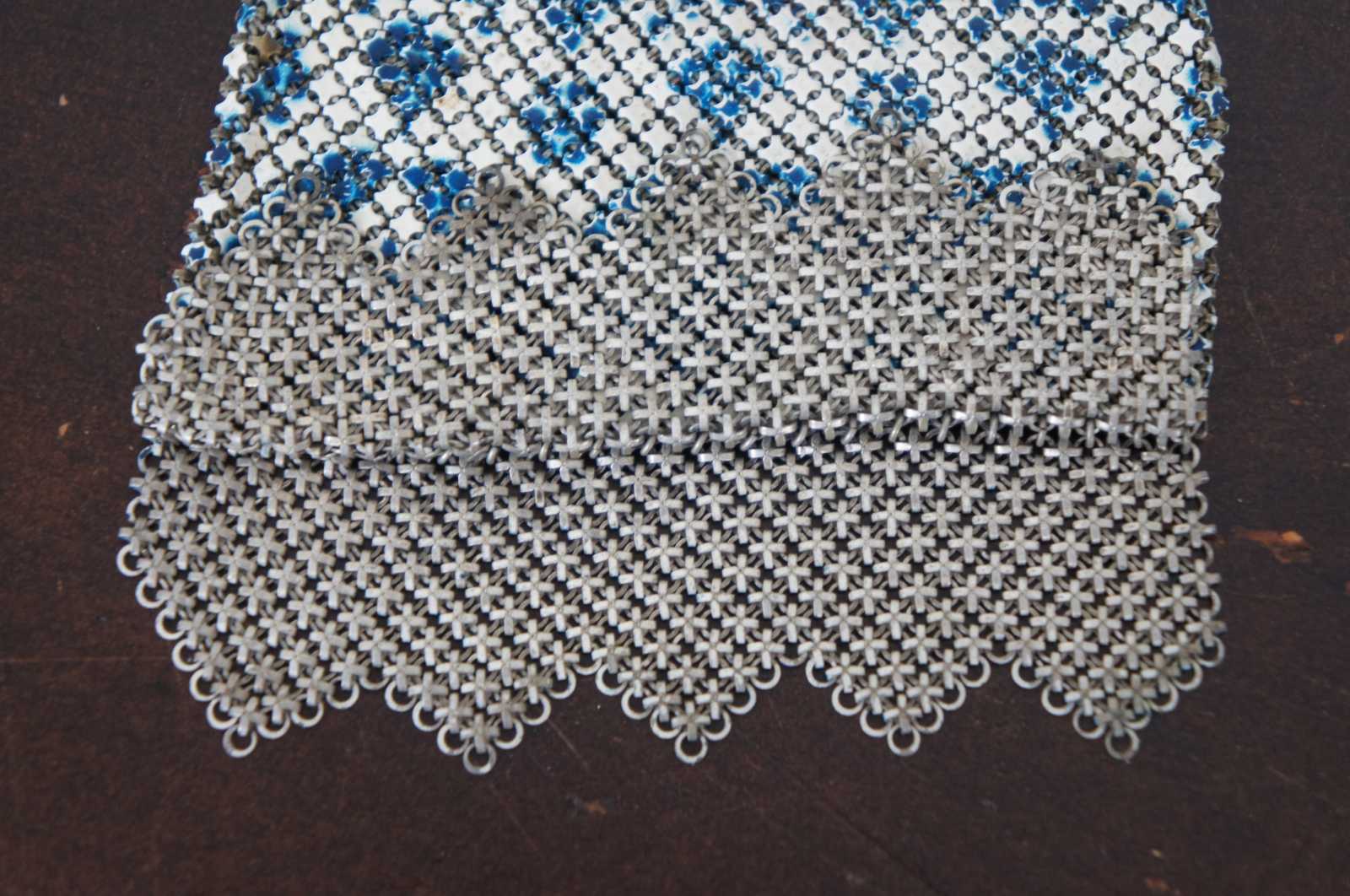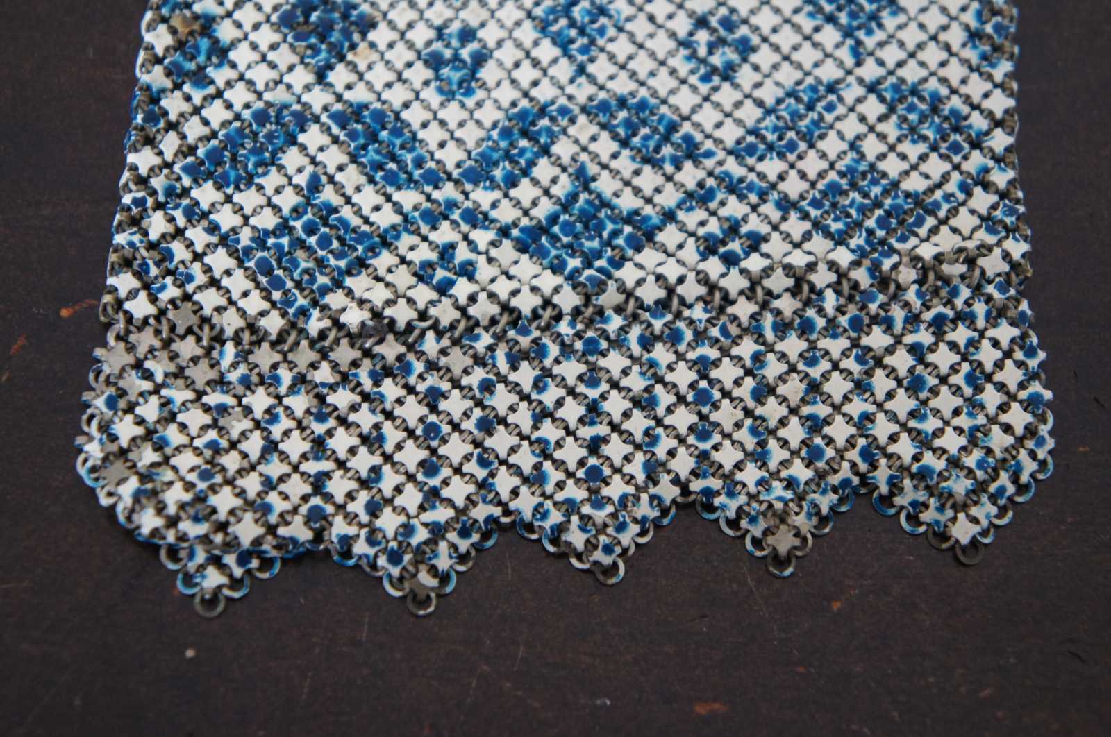 Antique blue and white art deco enameled mesh purse by Mandalian Manufacturing company, with floral patterned clam shell clasp topped with blue glass accents.