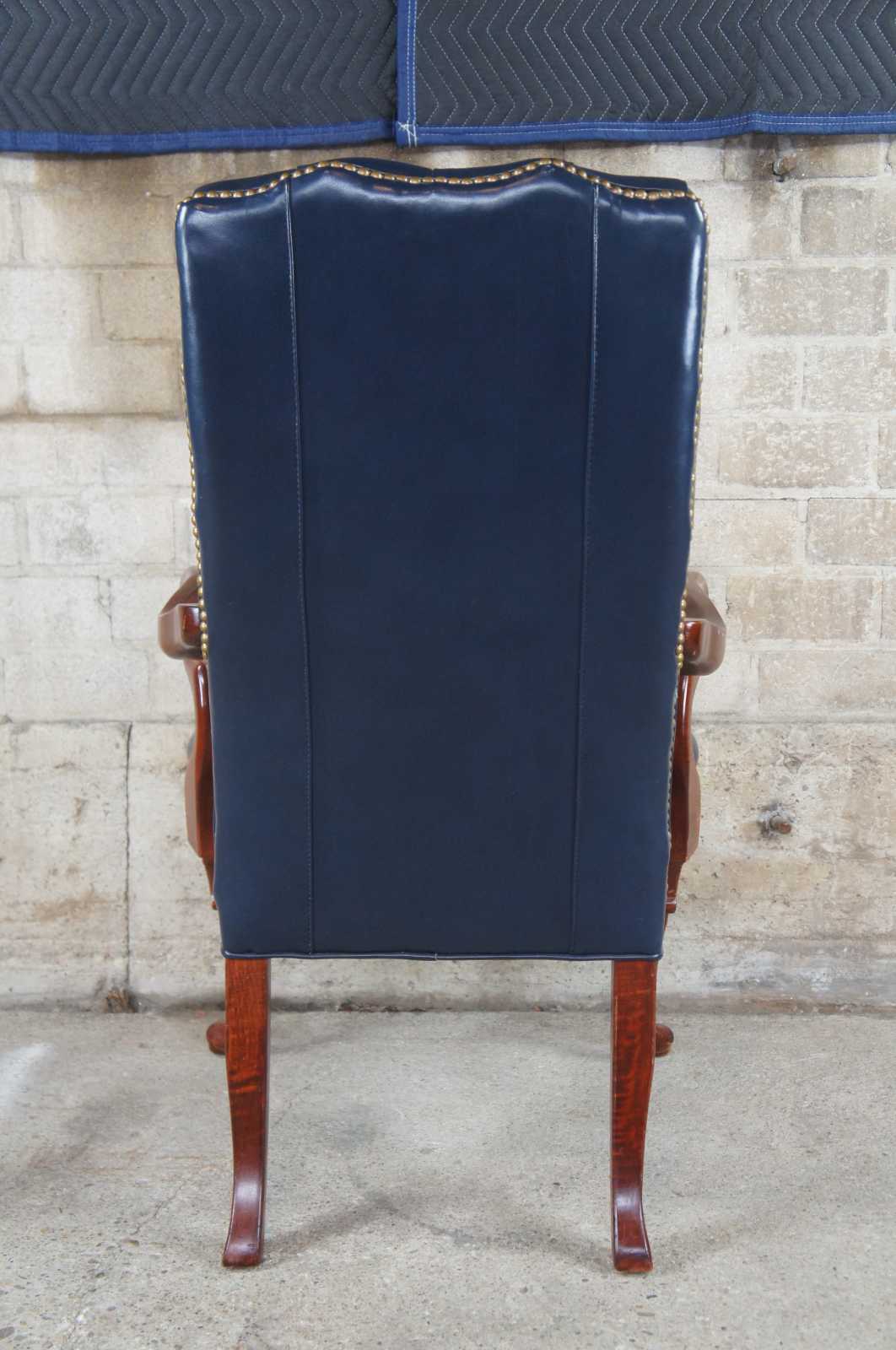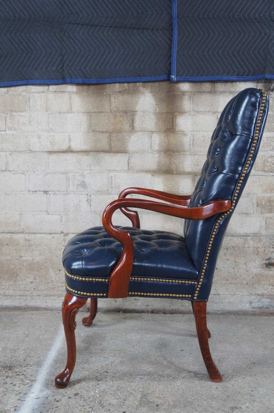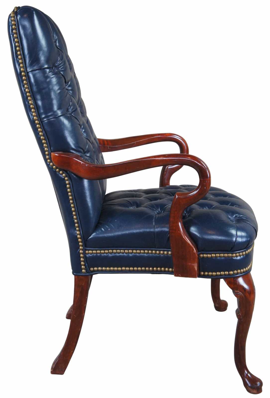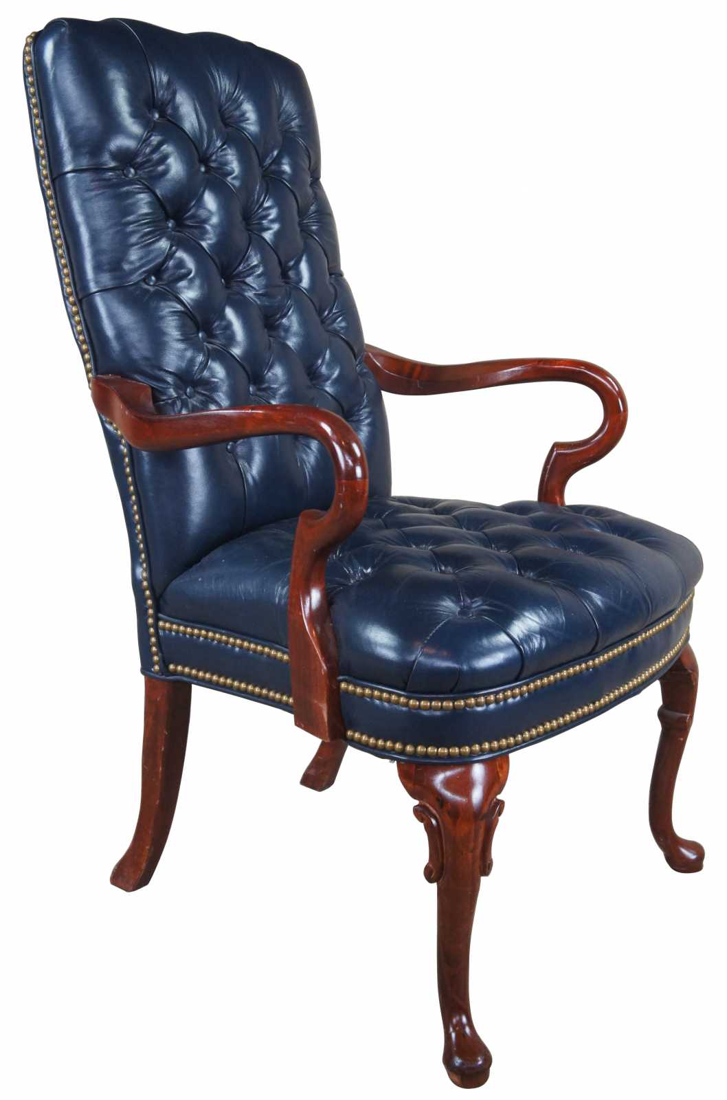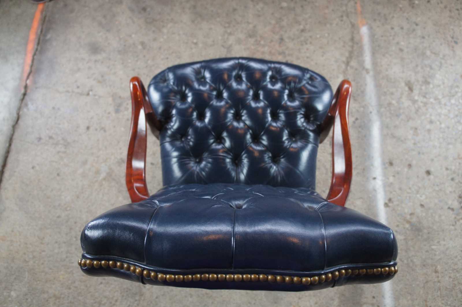 Vintage Queen Anne office or desk chair featuring tufted blue leather with gooseneck arms and nailhead trim.