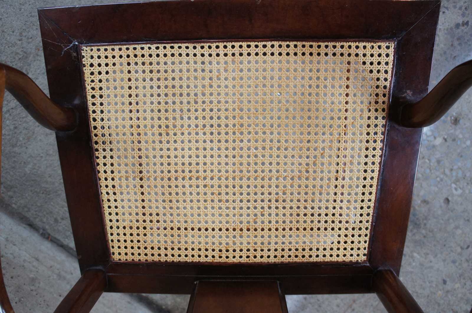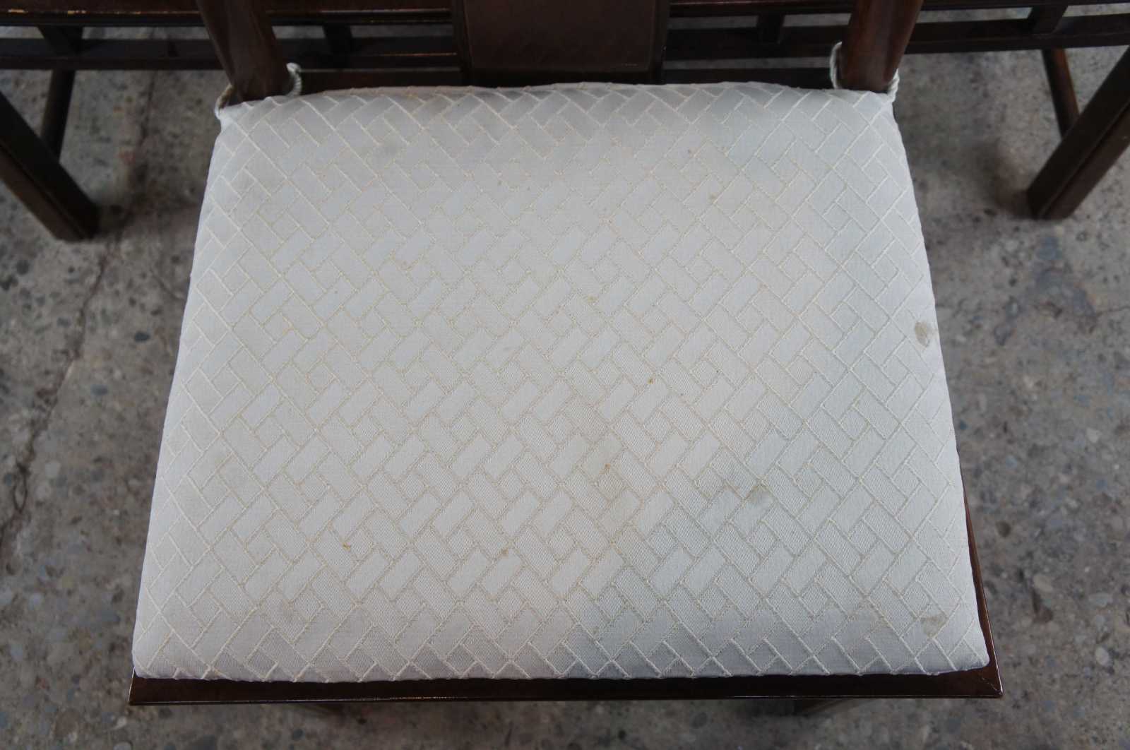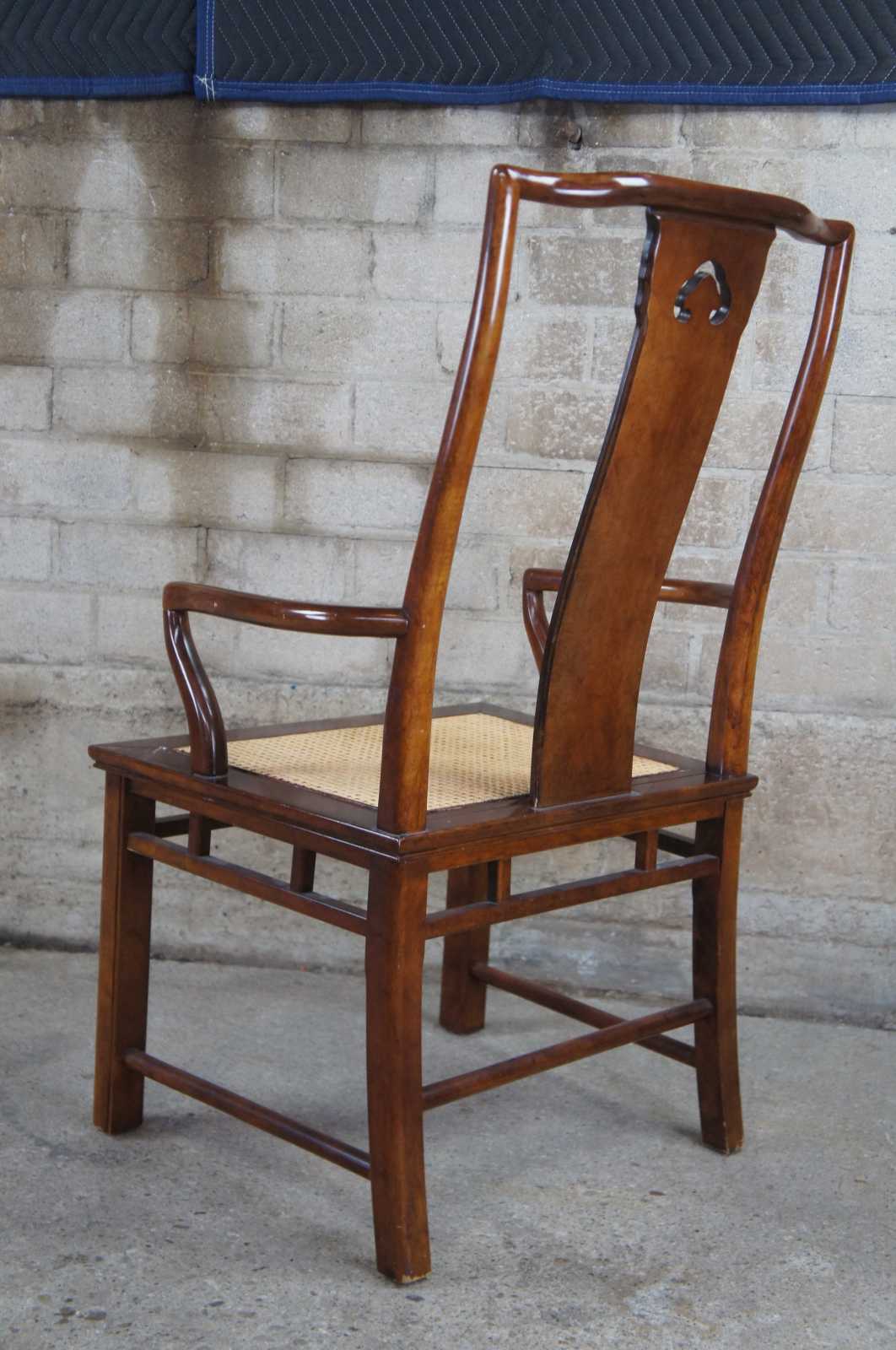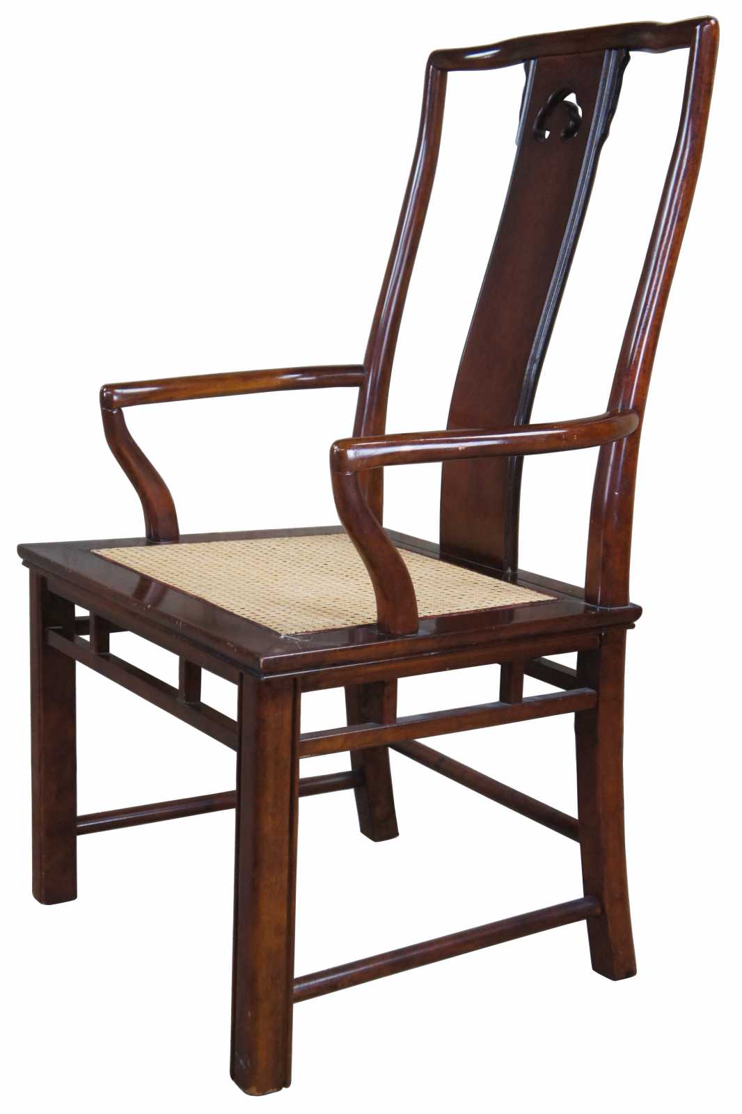 Six vintage 1980s Mandarin dining chairs by White Furniture. Made of mahogany and burl, with Ming style form. Featuring burled and pierced back splat and woven rattan/caned seat.