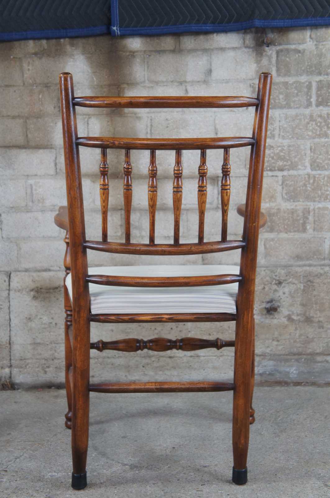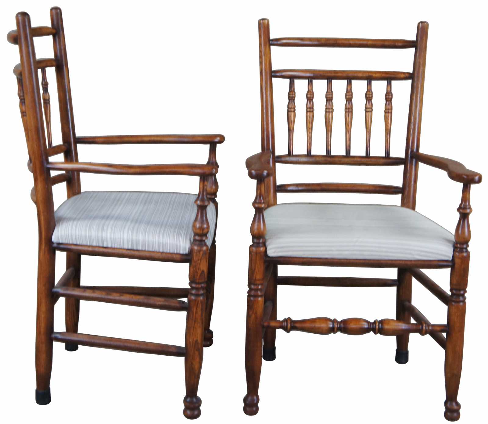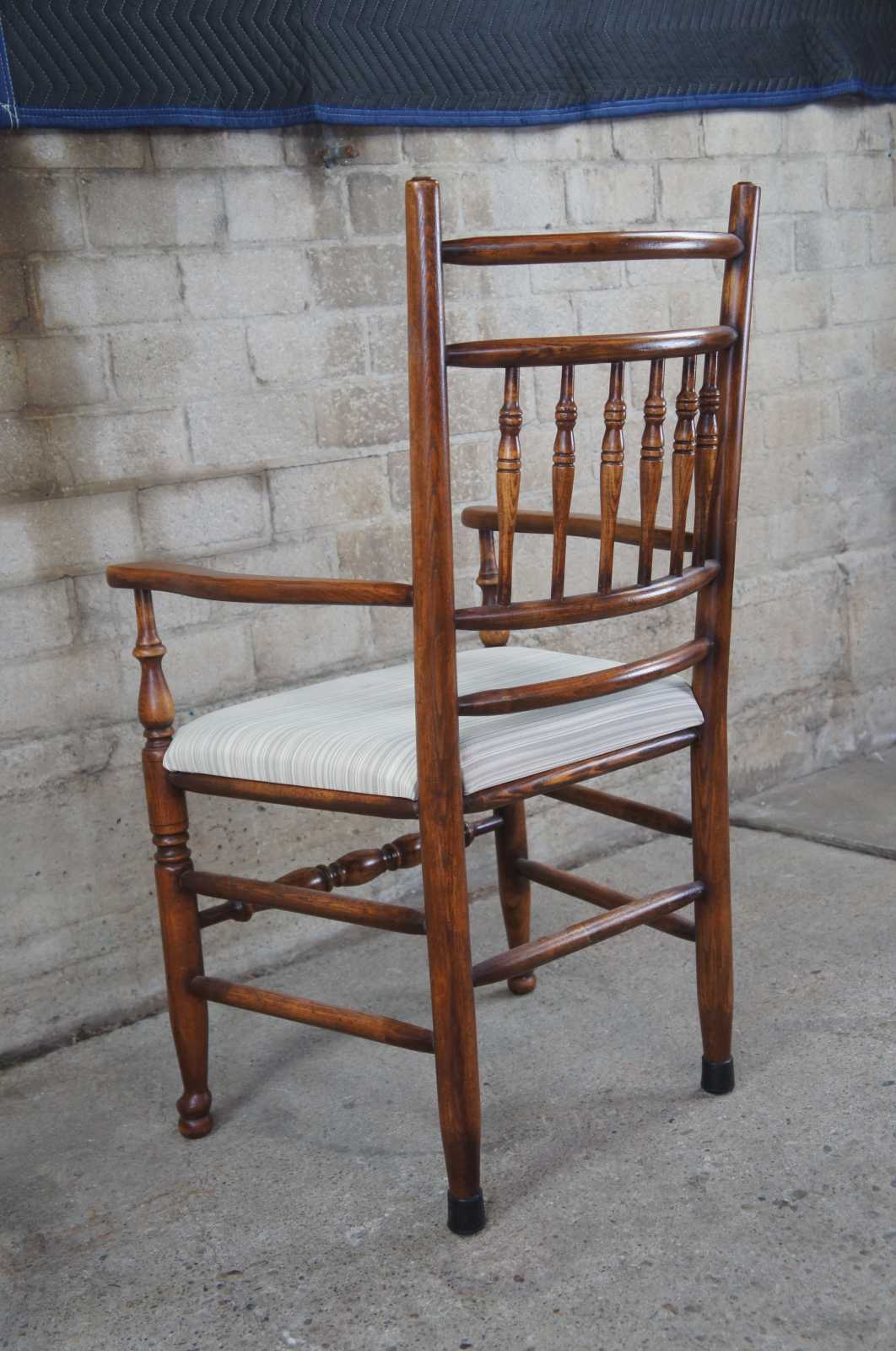 Set of four circa 1980s English Country or lancashire style arm chairs. Made of oak featuring a spindle back and turned supports.
