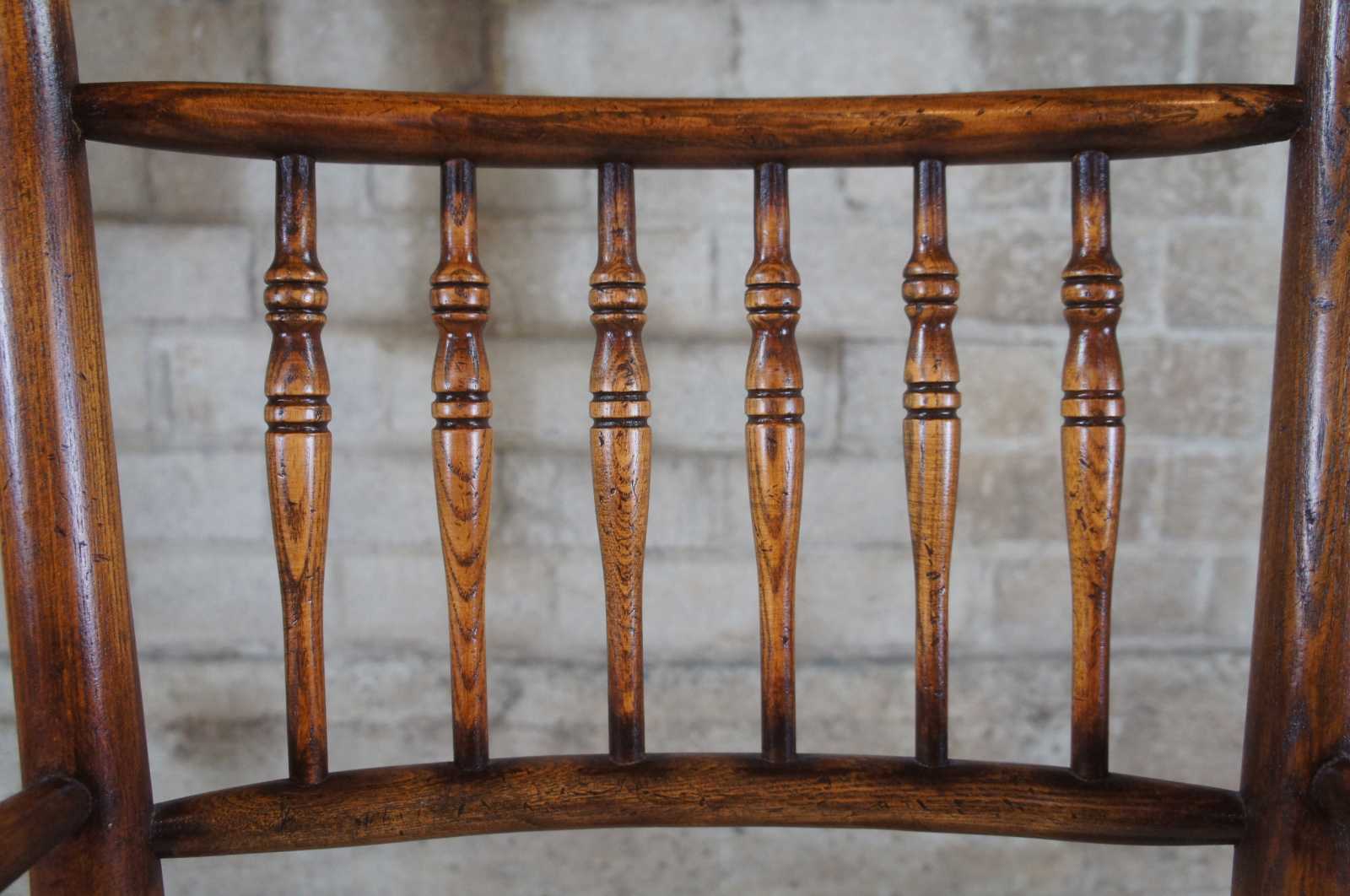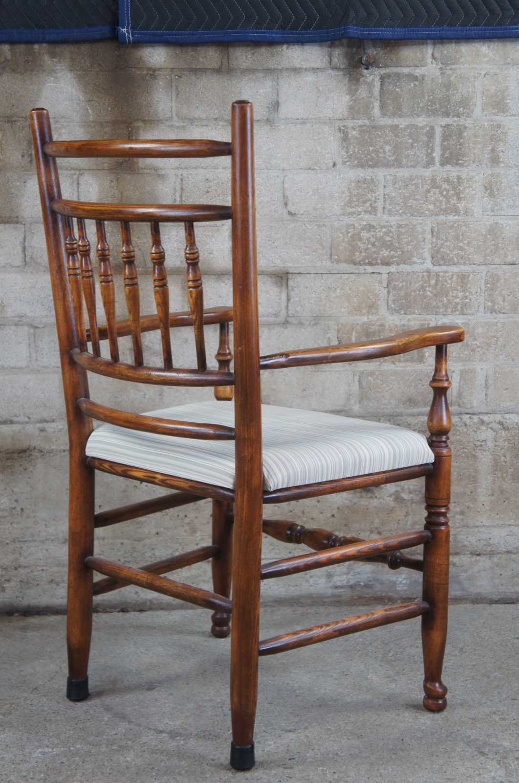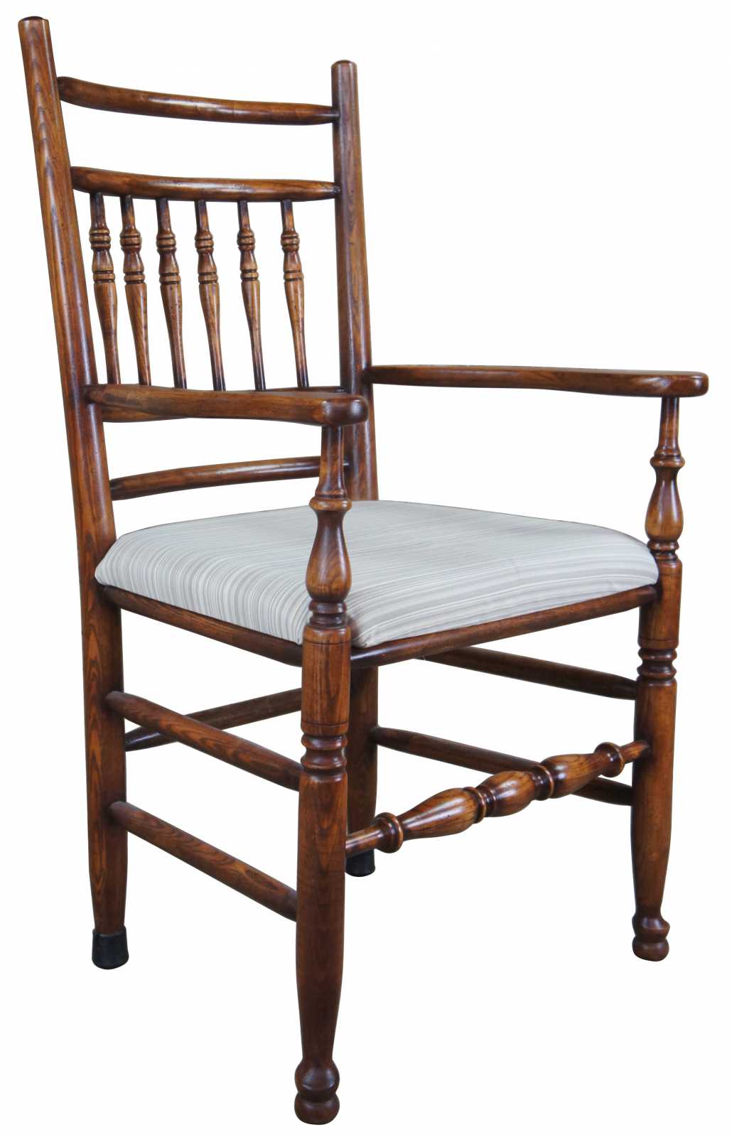 Set of four circa 1980s English Country or lancashire style arm chairs. Made of oak featuring a spindle back and turned supports.