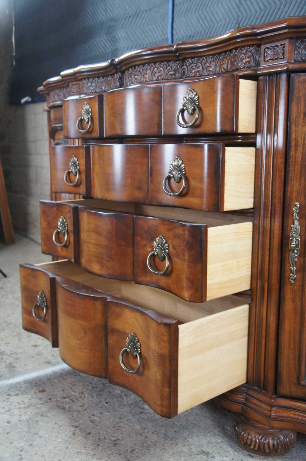 A large late 20th century sideboard by Bernhardt Furniture. Made from mahogany with a rectangular form featuring a serpentine breakfront, French Louis XV style carvings and bun feet. Includes 4 drawers flanked by outer cabinets.