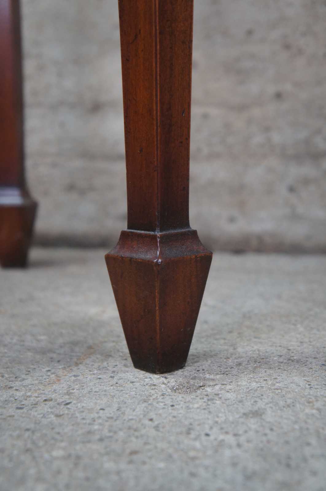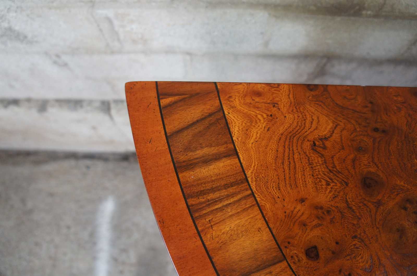 1990s half round Sheraton style console table. Made from olive ash burl and mahogany with satinwood inlay. Supported by square tapered legs leading to spade feet.
