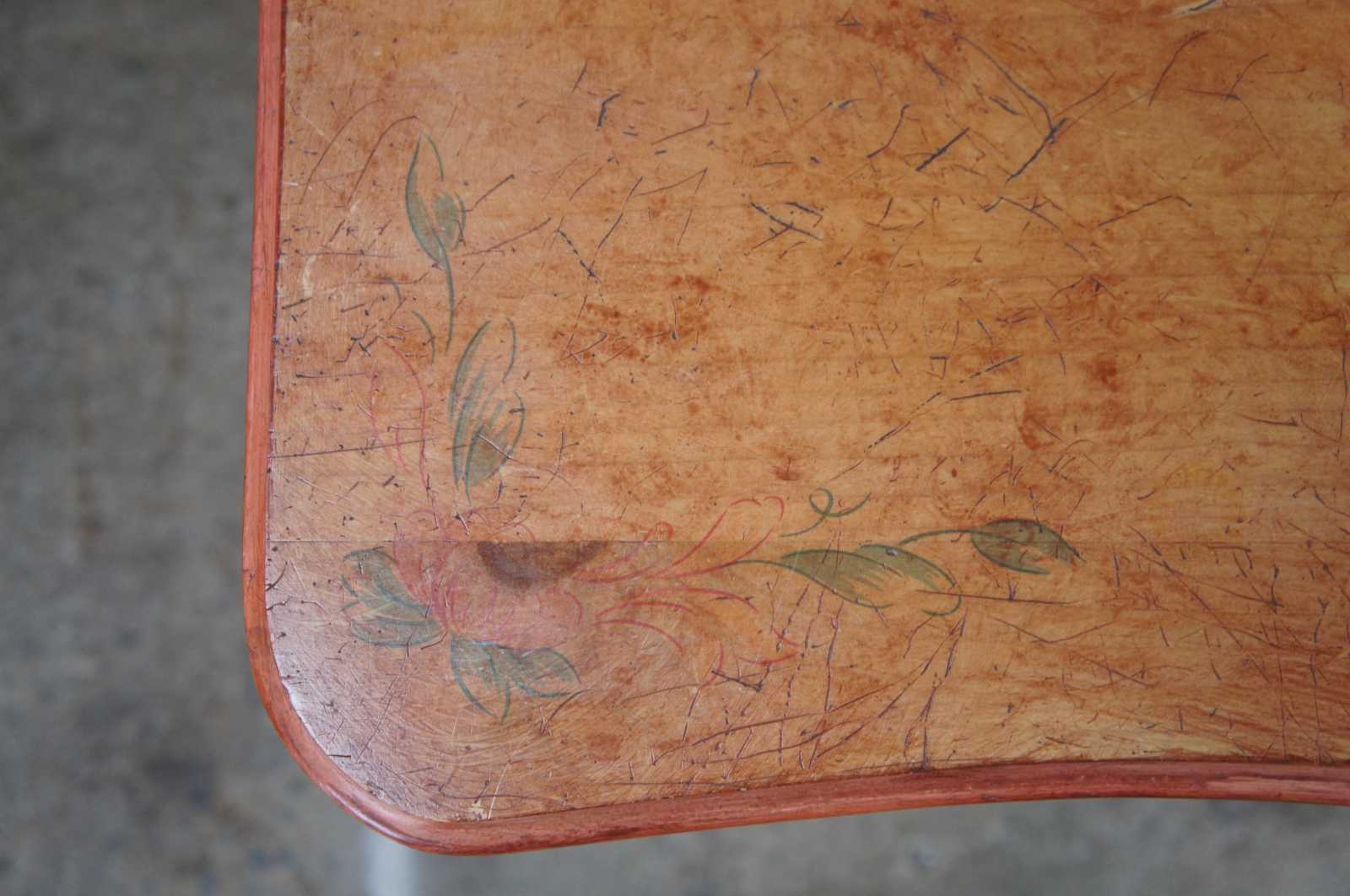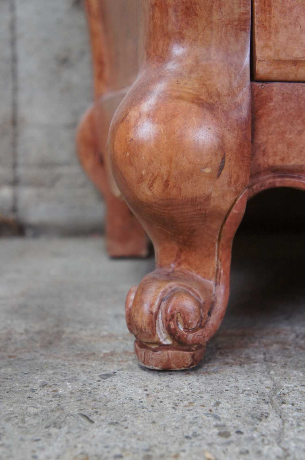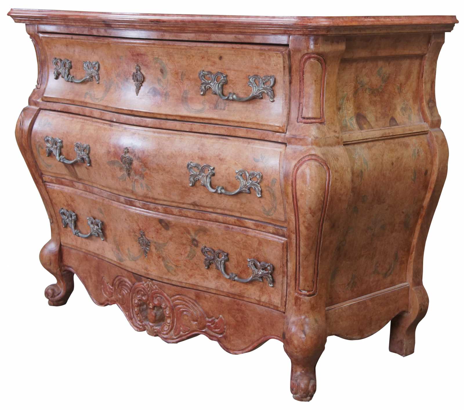 Circa 1970s Pulaski commode. Made from pine with a serpentine front a shapely bombe form. Features dovetailed drawers, floral painted accents and scrolled feet.
