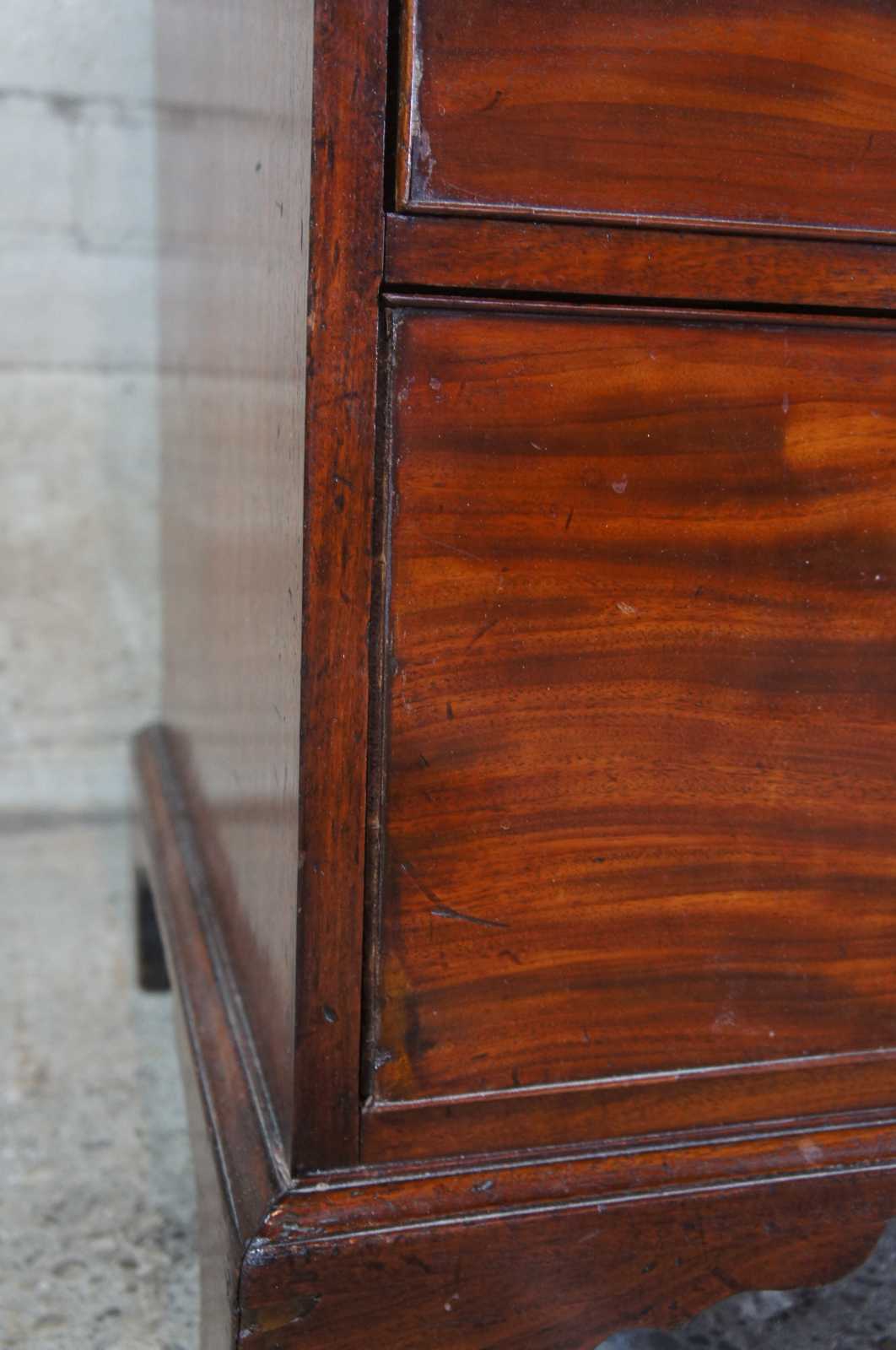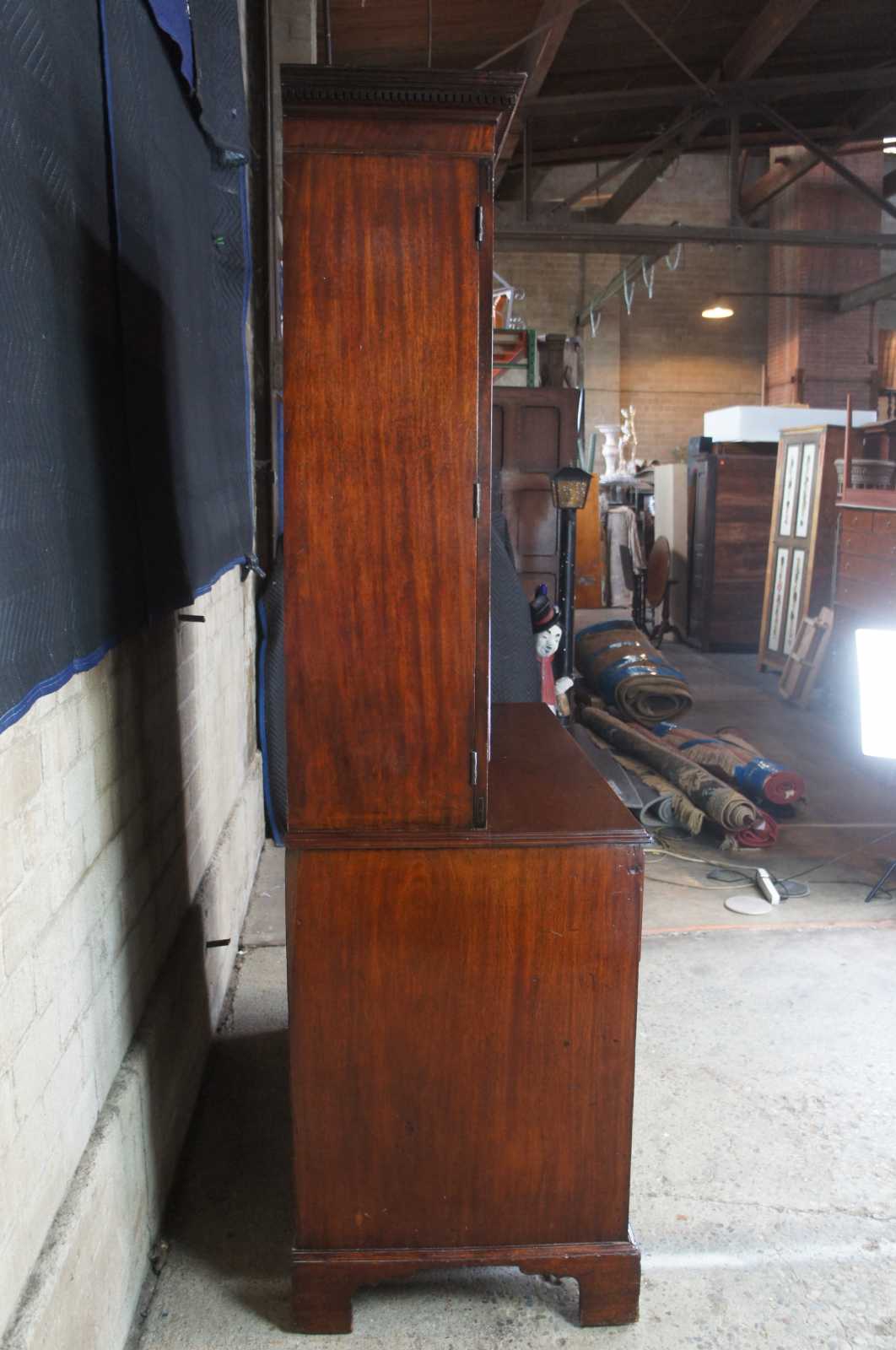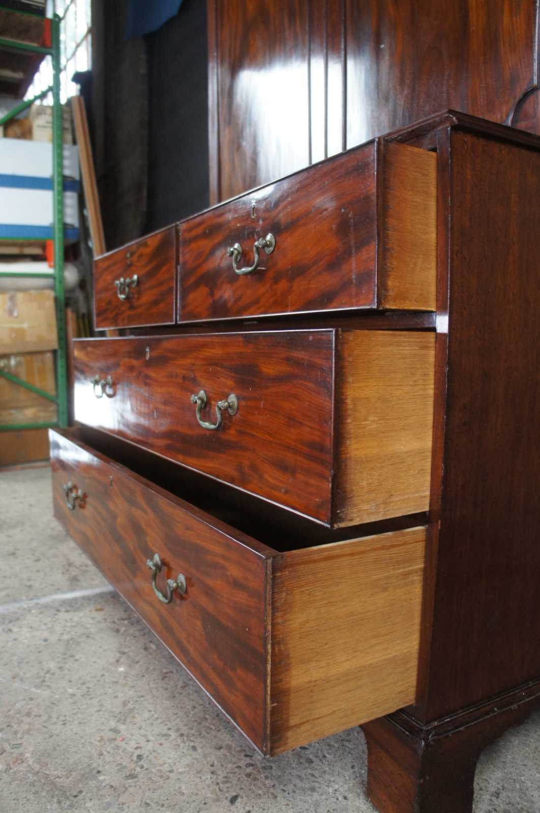 18th century George III English mahogany linen press. Rectangular form with two over three hand dovetailed drawers and stepback closet/wardrobe. Features a carved crown with ogee edge, bracket feet and brass bail hardware.