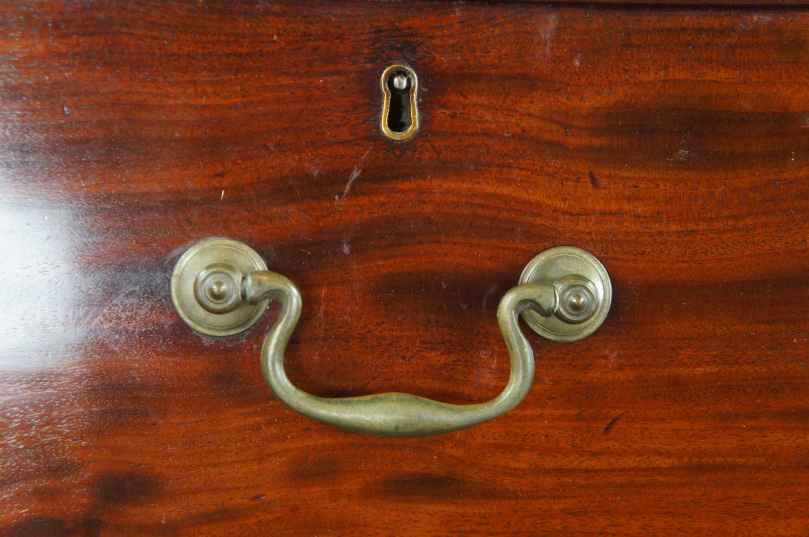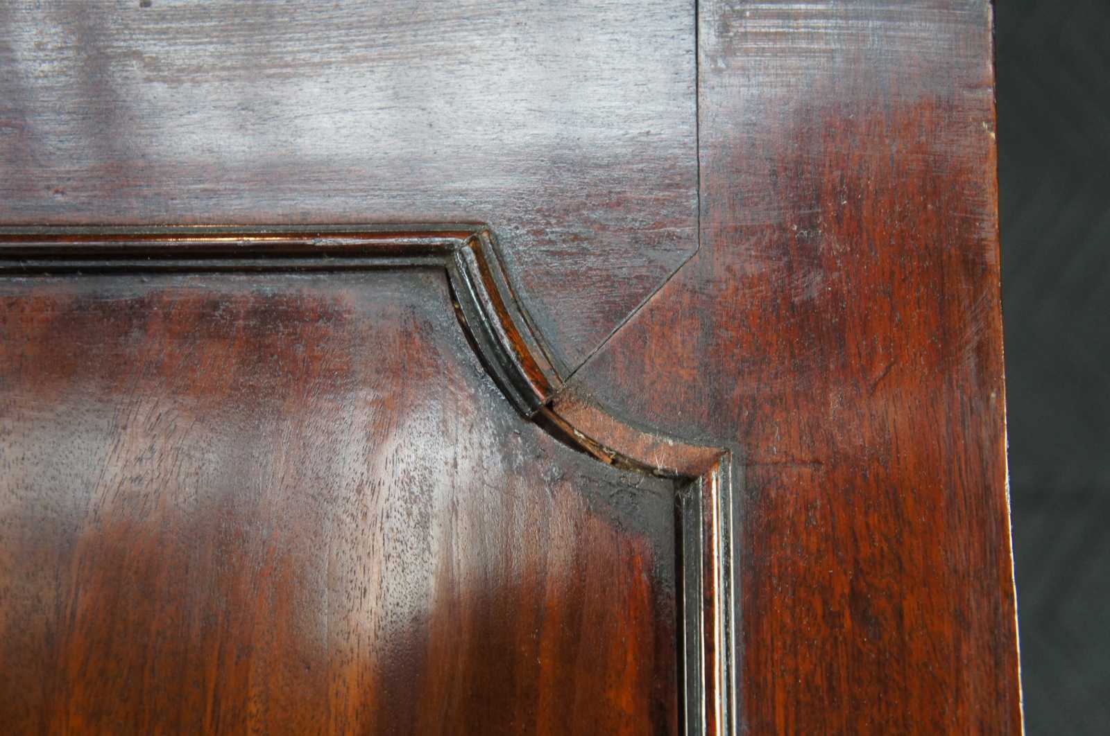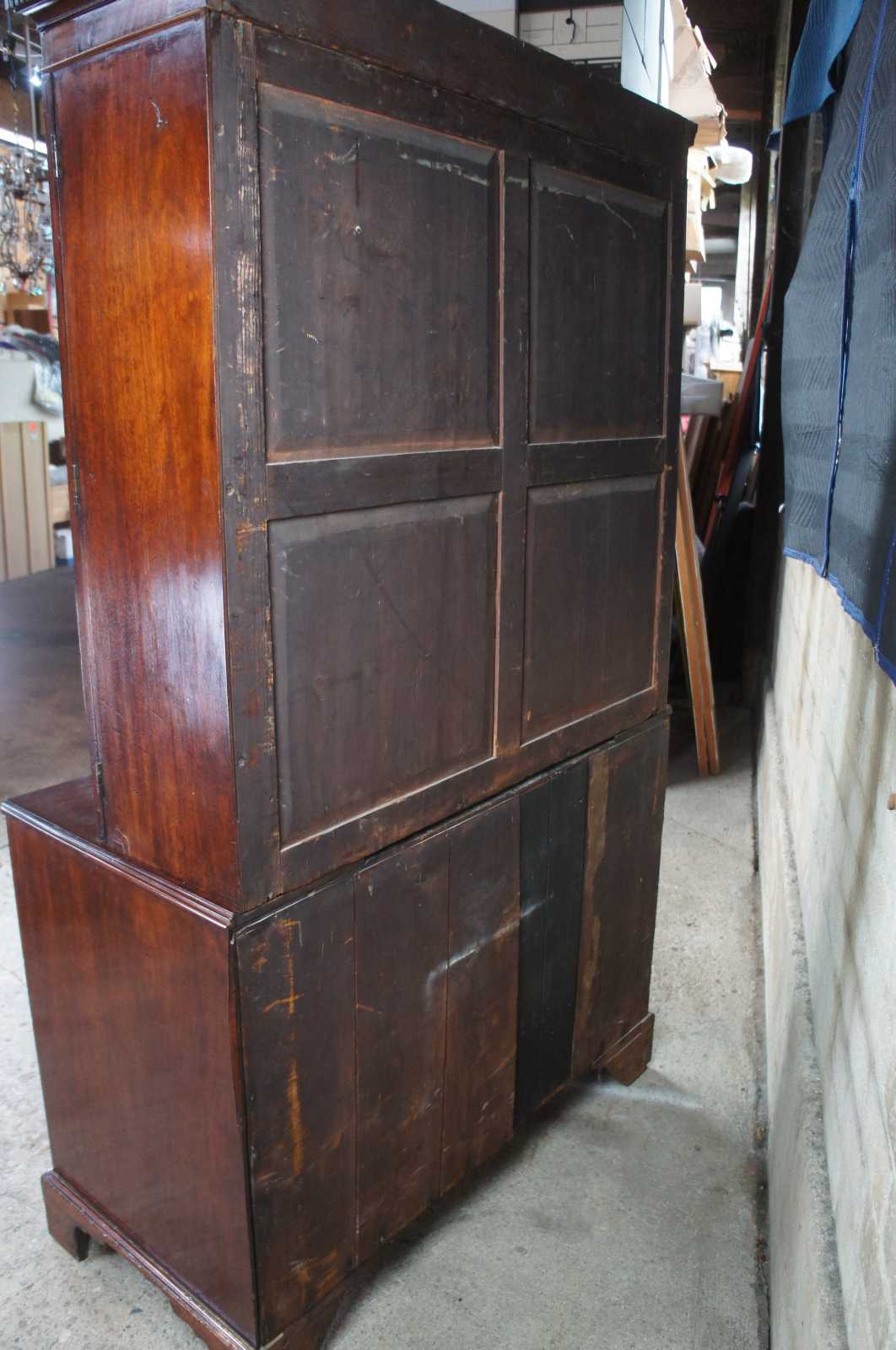 18th century George III English mahogany linen press. Rectangular form with two over three hand dovetailed drawers and stepback closet/wardrobe. Features a carved crown with ogee edge, bracket feet and brass bail hardware.