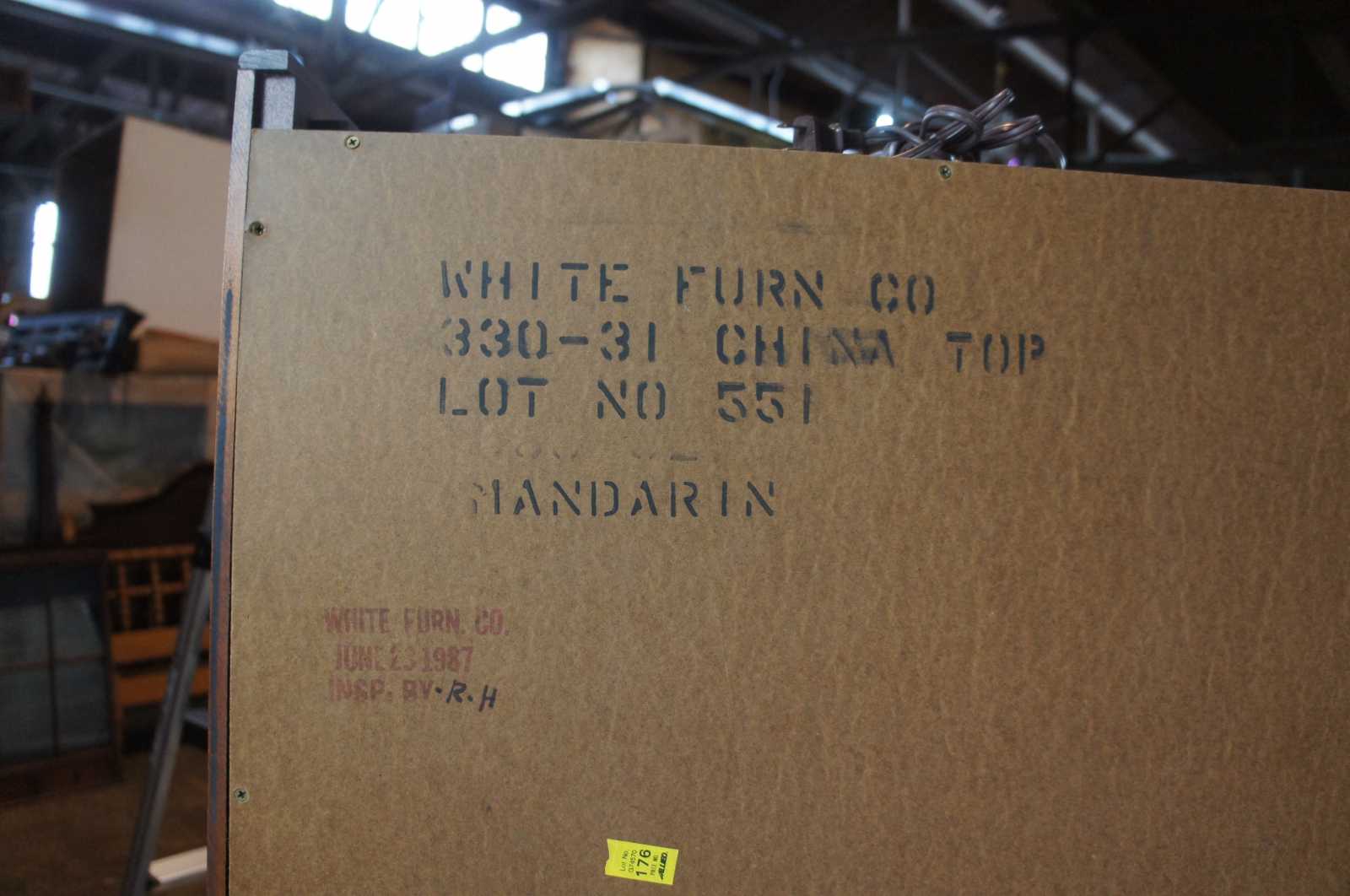 1987 White Furniture Ming Dynasty styled Mandarin China Cabinet, 330-31 Rectangular form with mahogany and burlwood paneling. Features an illumanted stepback top and brass hardware Illumination controlled by touching the of the brass hardware.