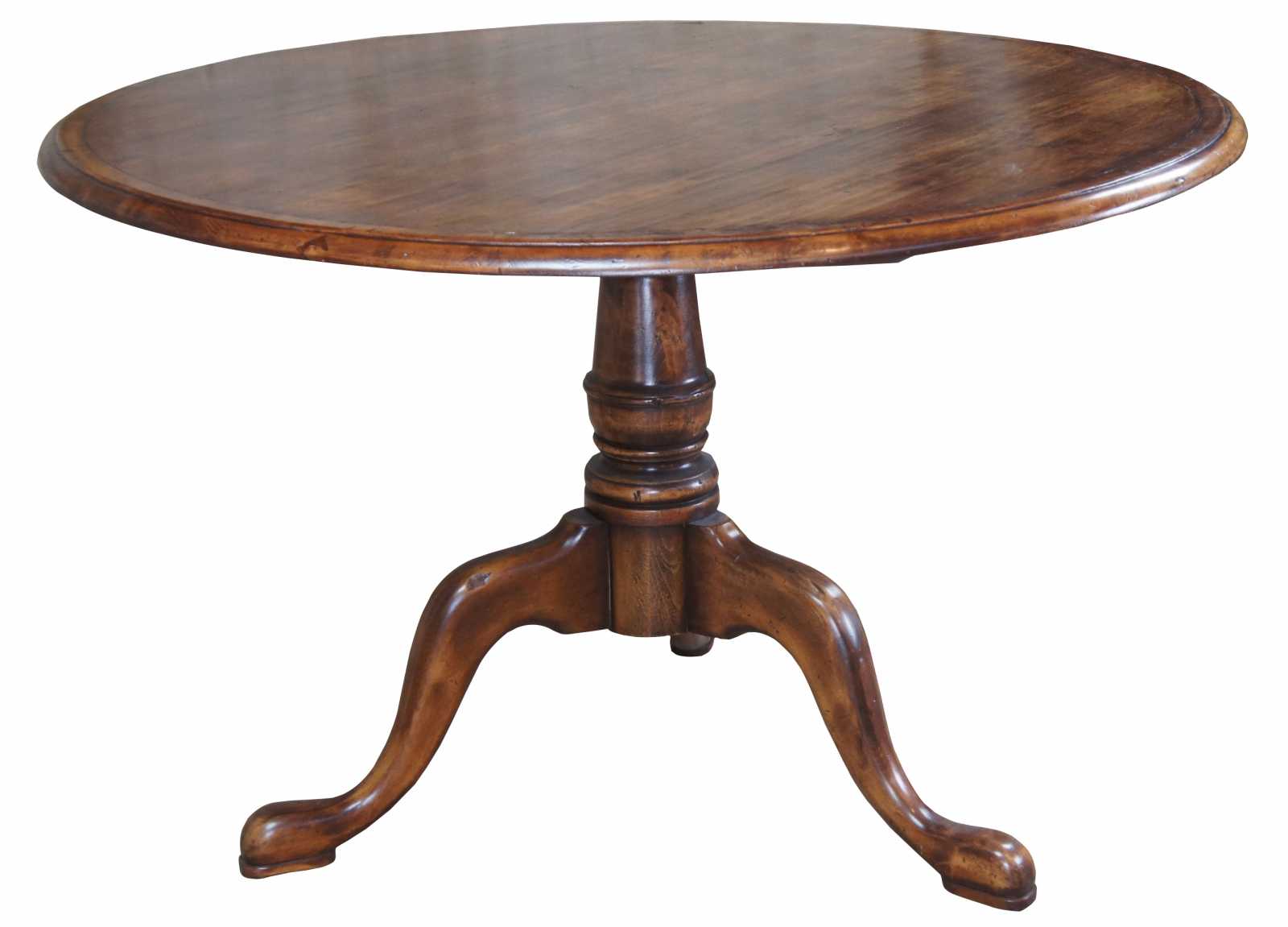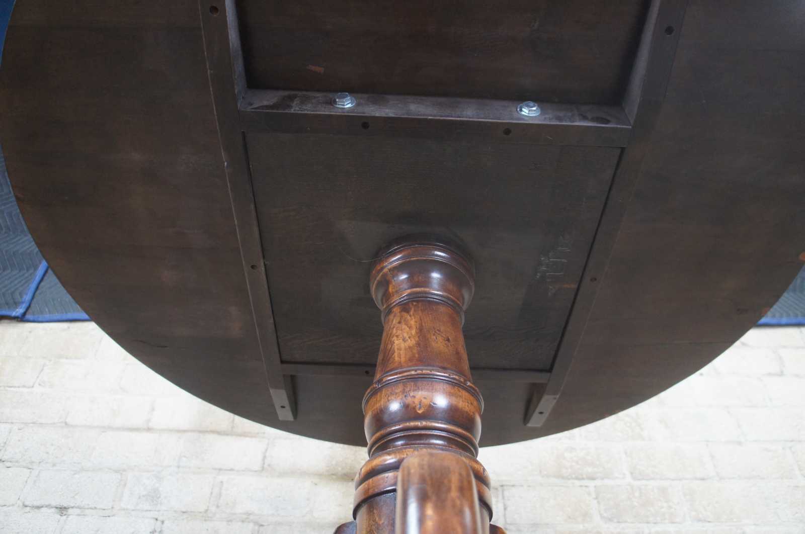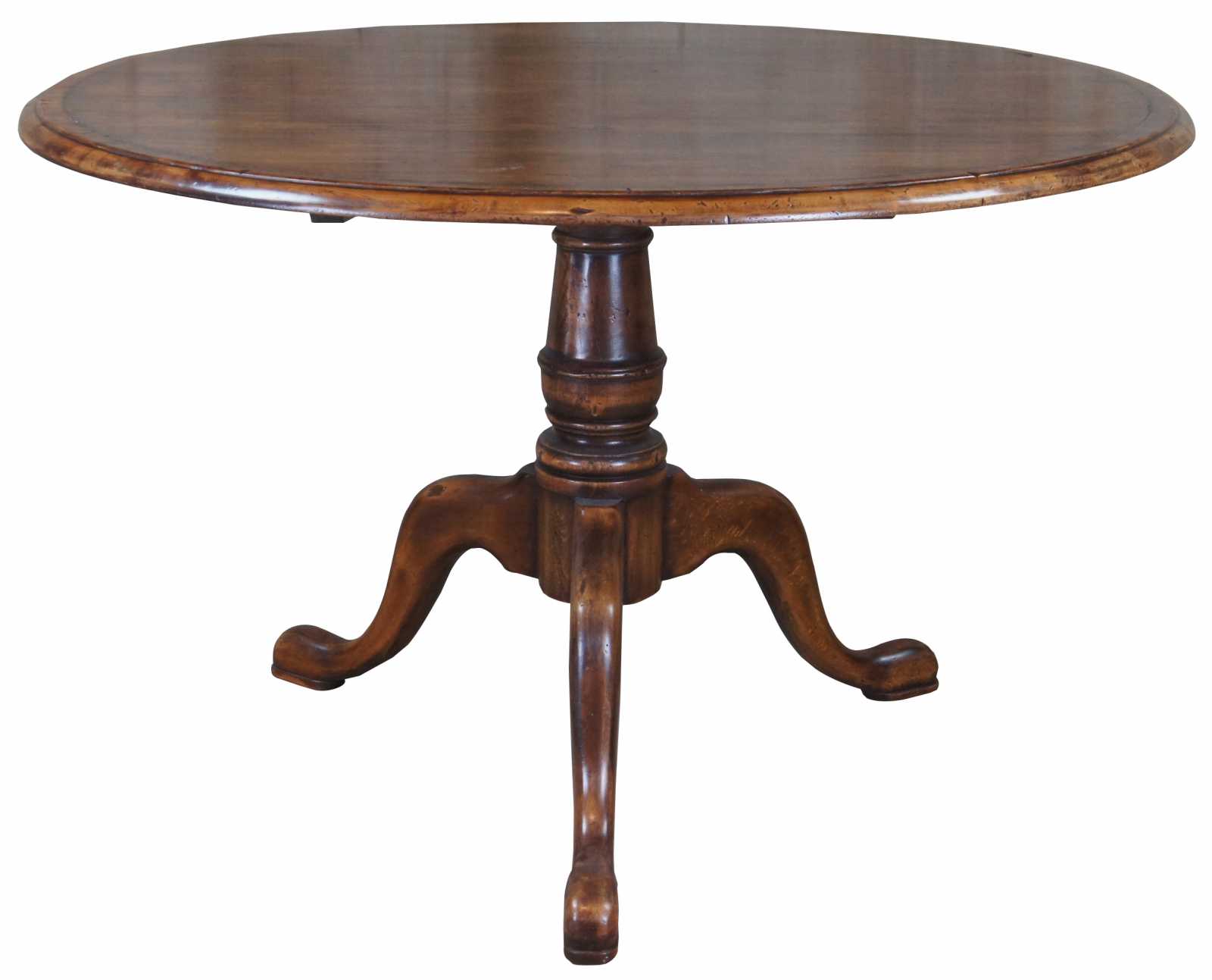 Late 20th century mahogany dining table. A round form top with ogee edge and baluster base with three legs leading to pad feet.