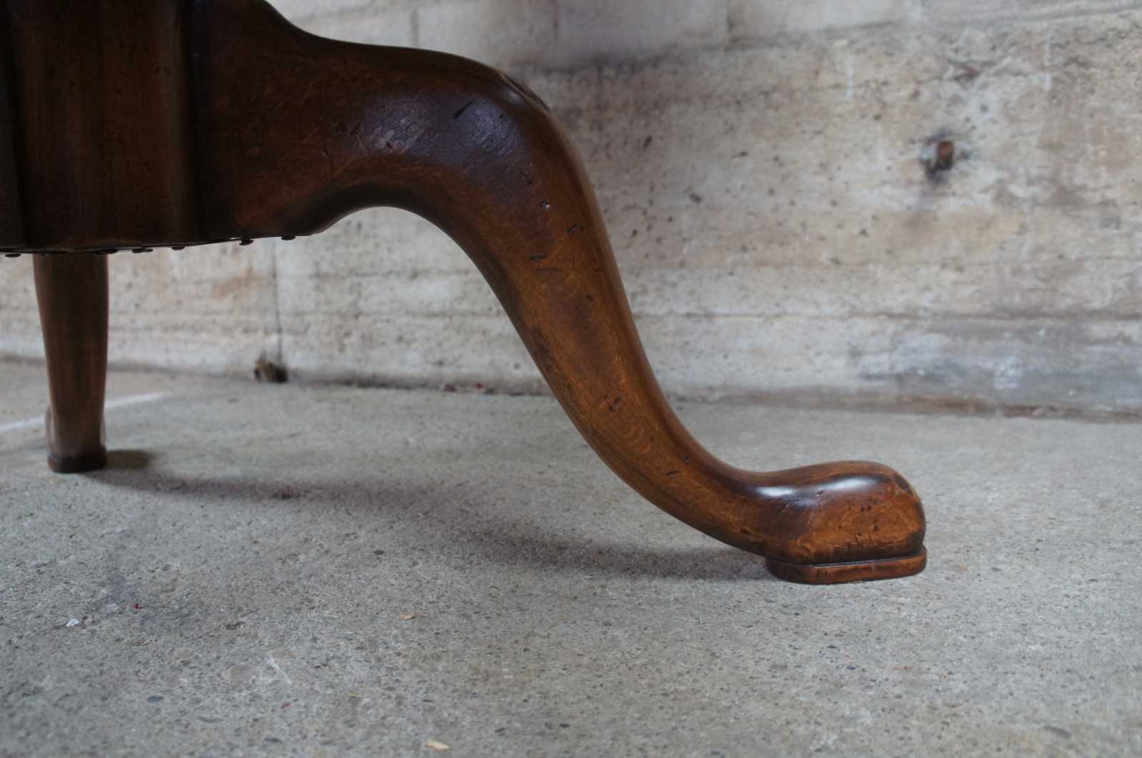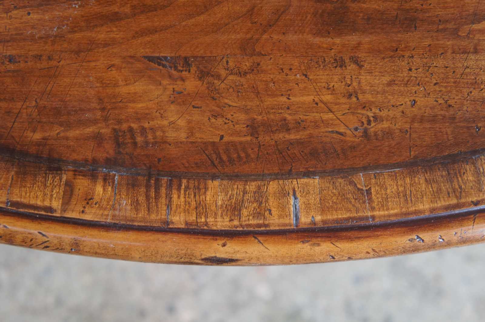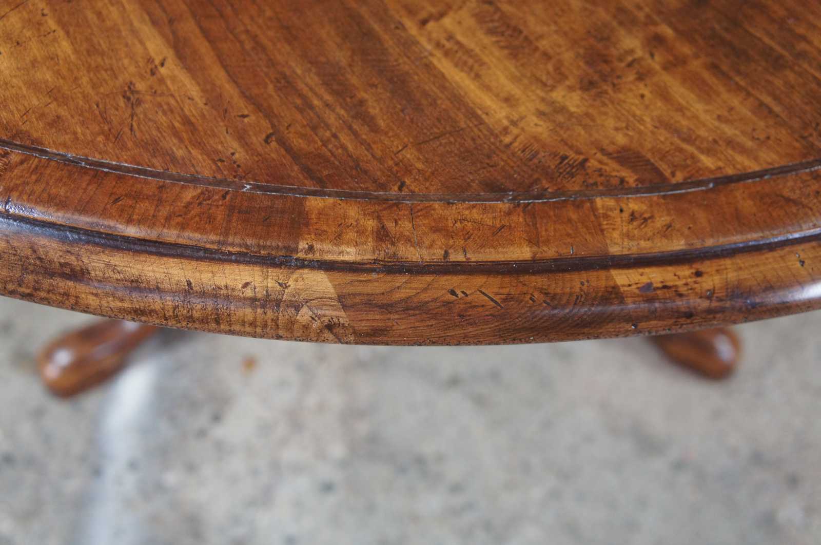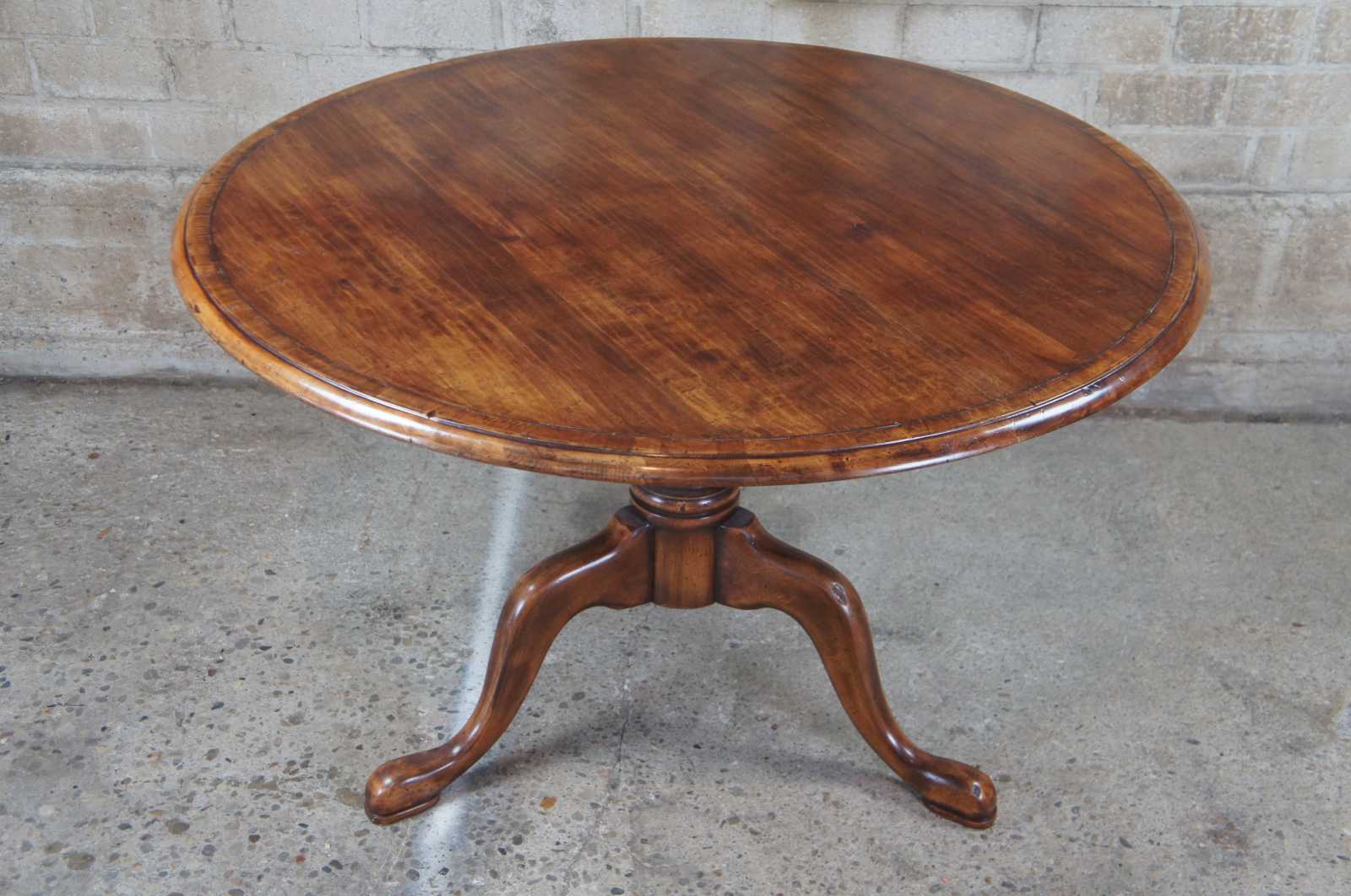 Late 20th century mahogany dining table. A round form top with ogee edge and baluster base with three legs leading to pad feet.