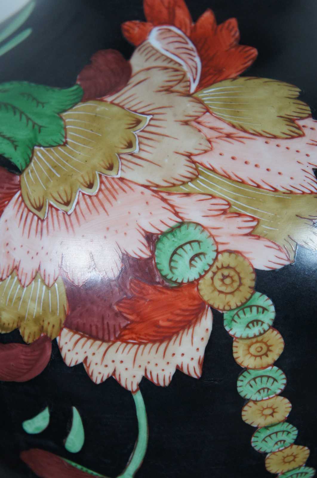 Frederick Cooper of Chicago chinoiserie porcelain ginger jar shaped table lamp with gold, red, and green flowers on a black ground. 5389.