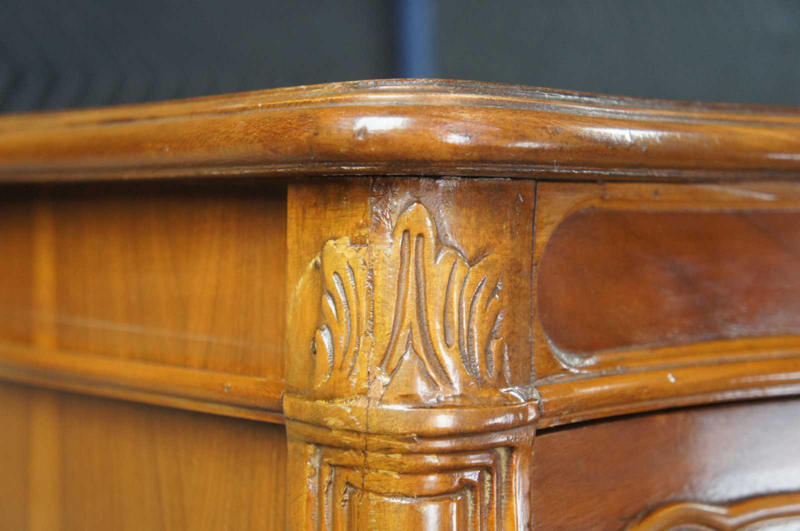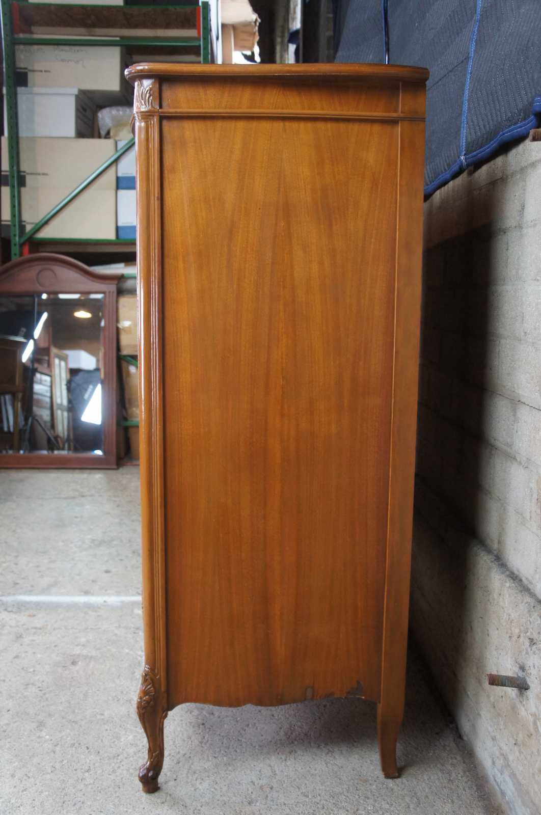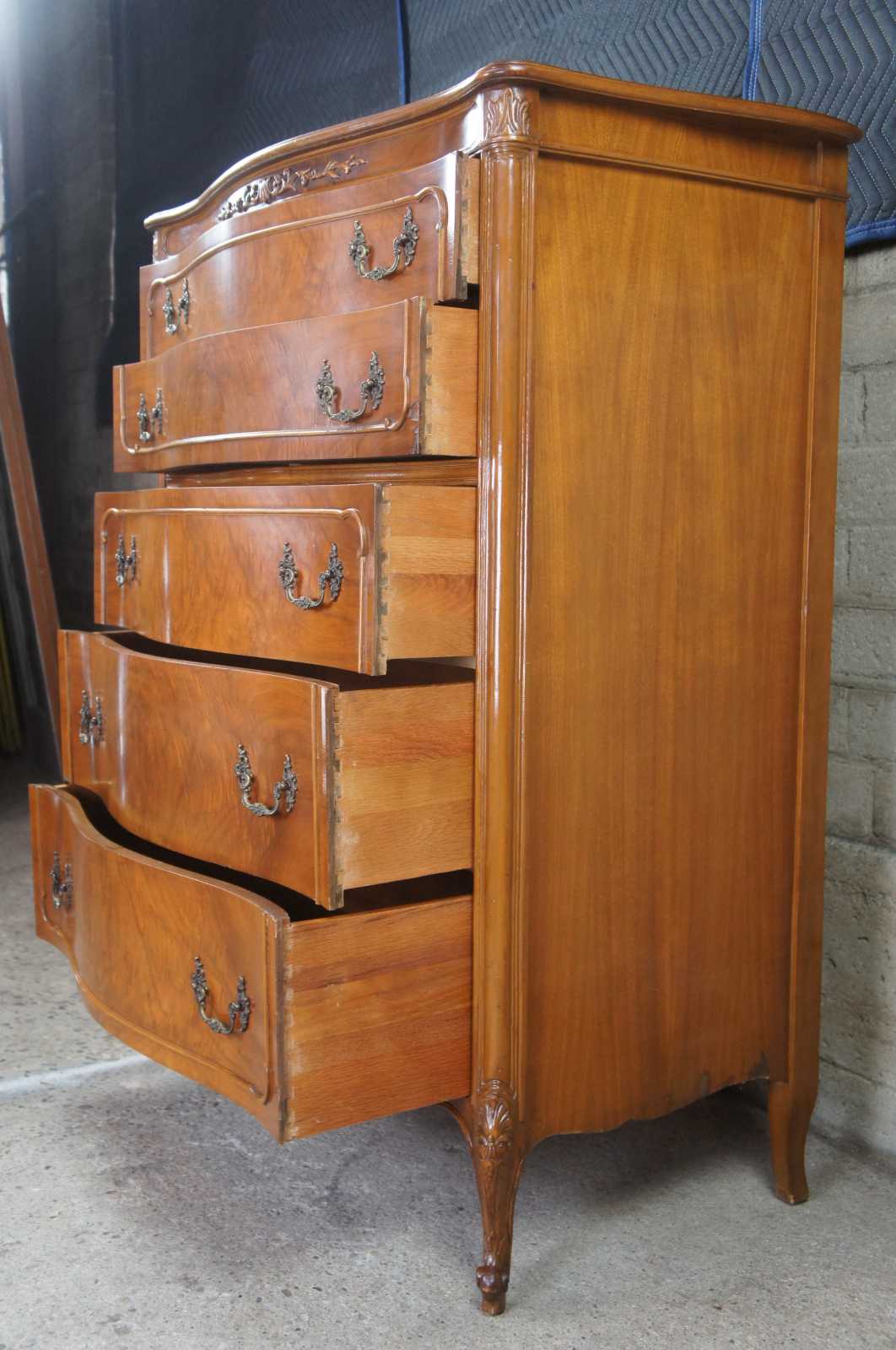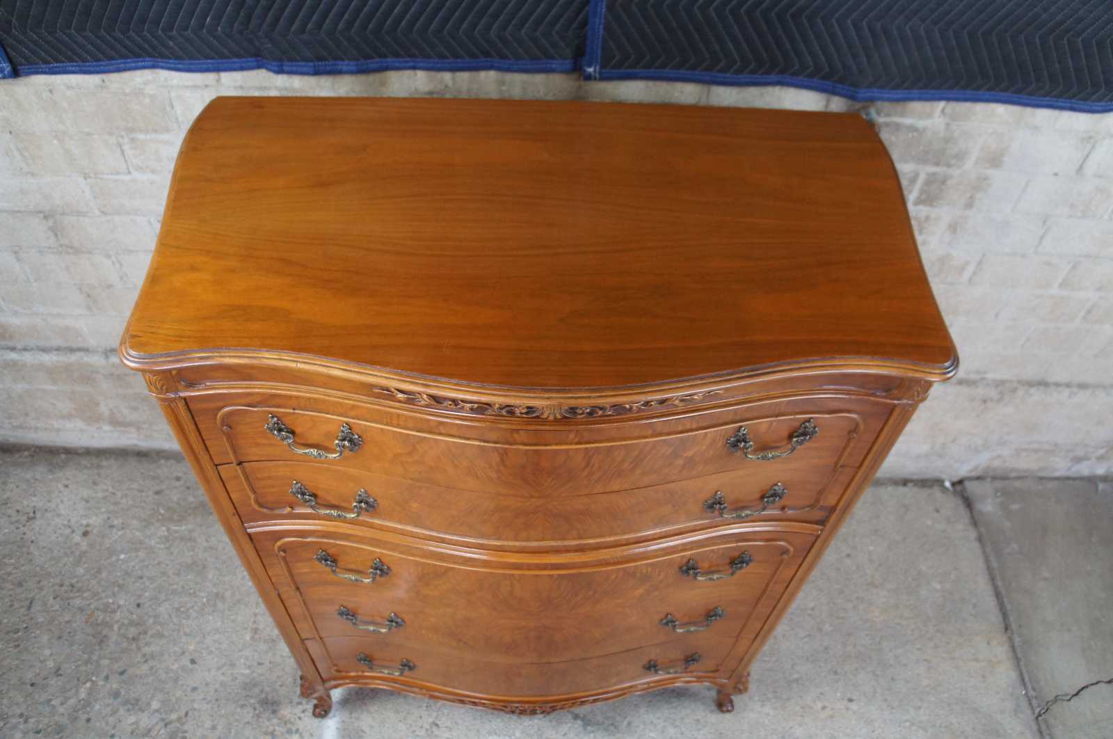Circa 1940s French tallboy dresser or chest of drawers. Made from walnut with a serpentine front and crotch veneered drawers. Features carved accents, scalloped brass hardware, cabriole legs and glass top(not pictured)