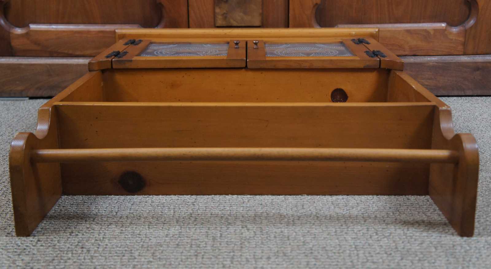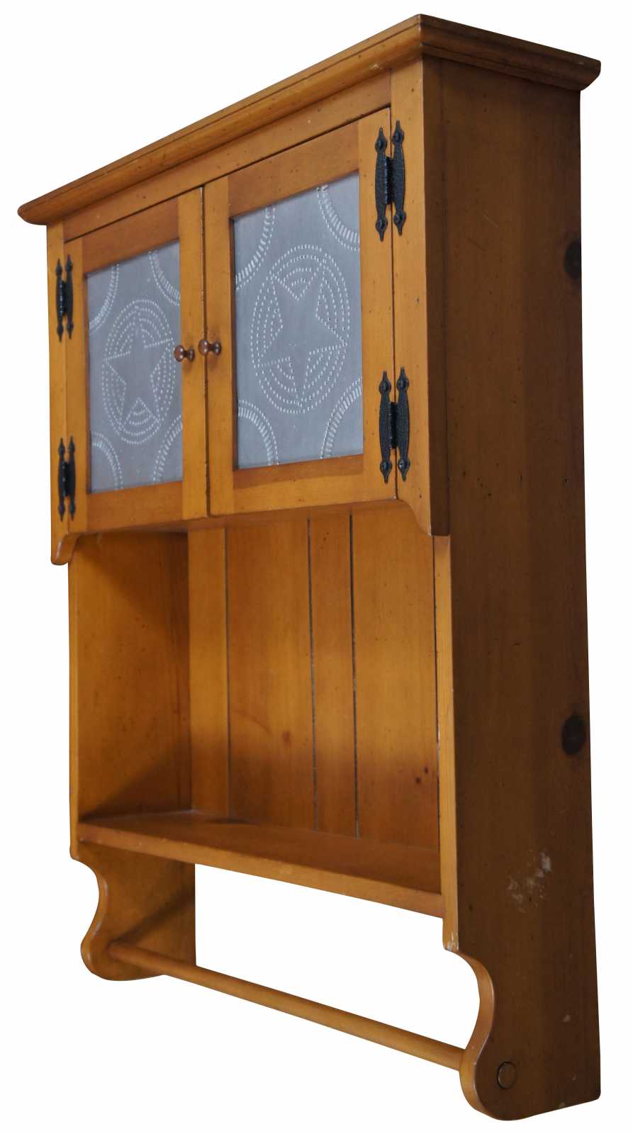 Country style wall hanging cabinet with towel bar and star stamped tin panels on the doors.