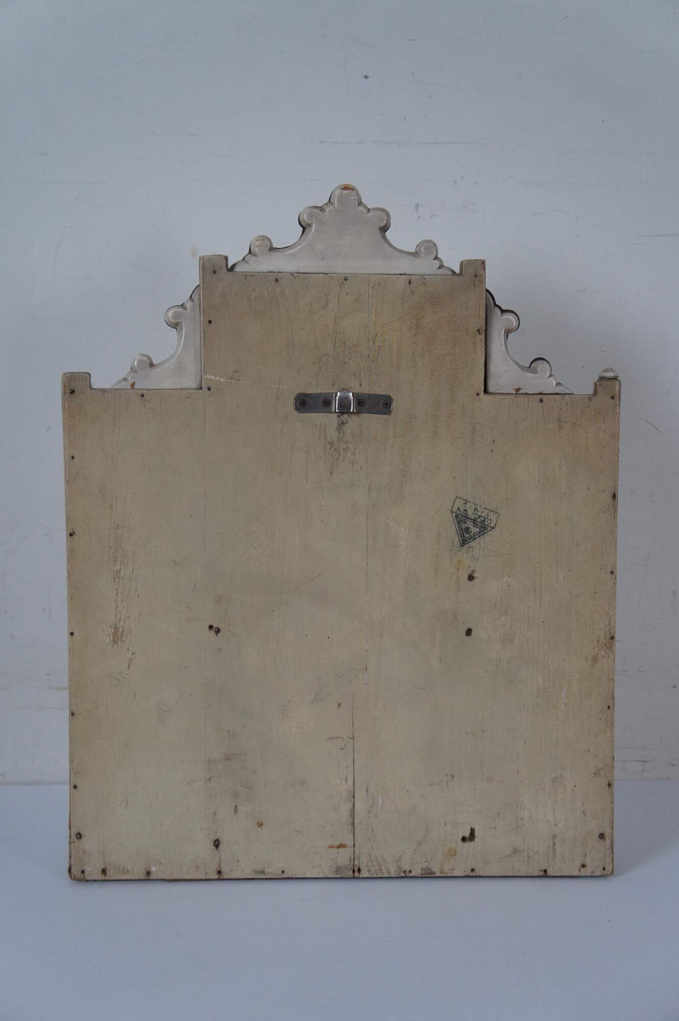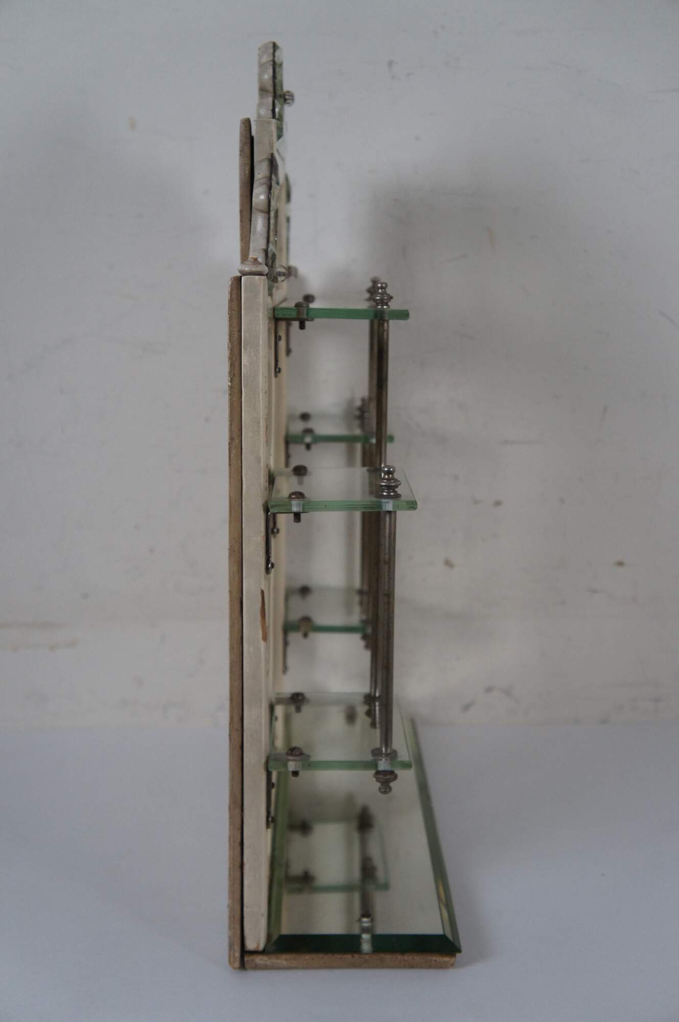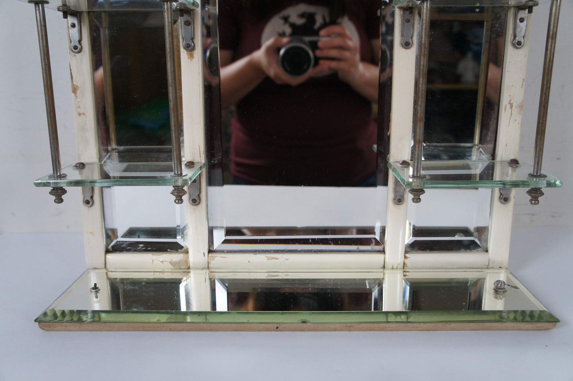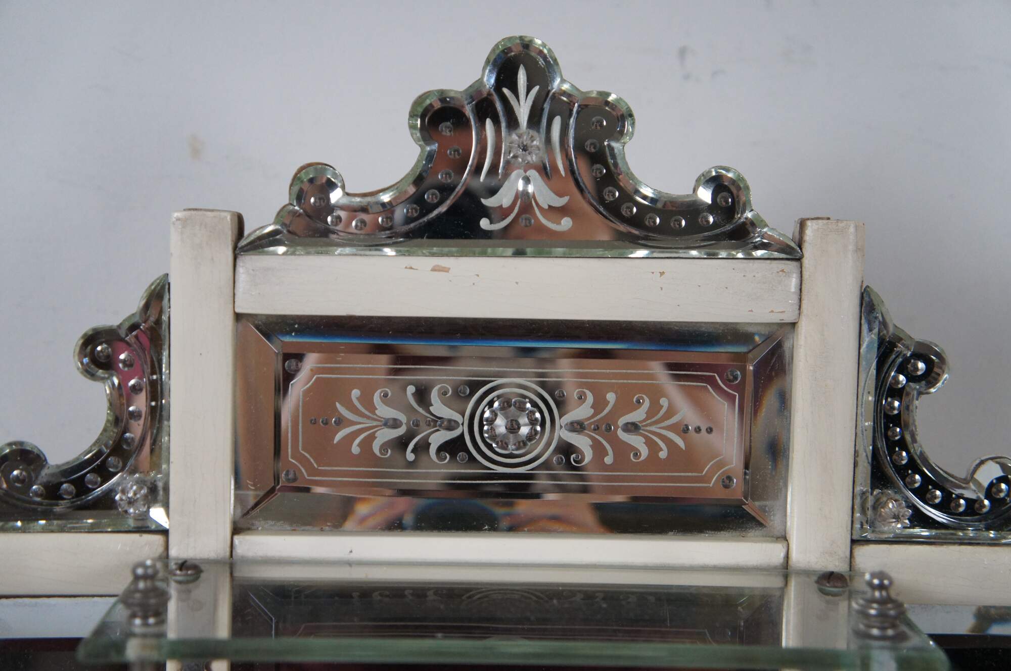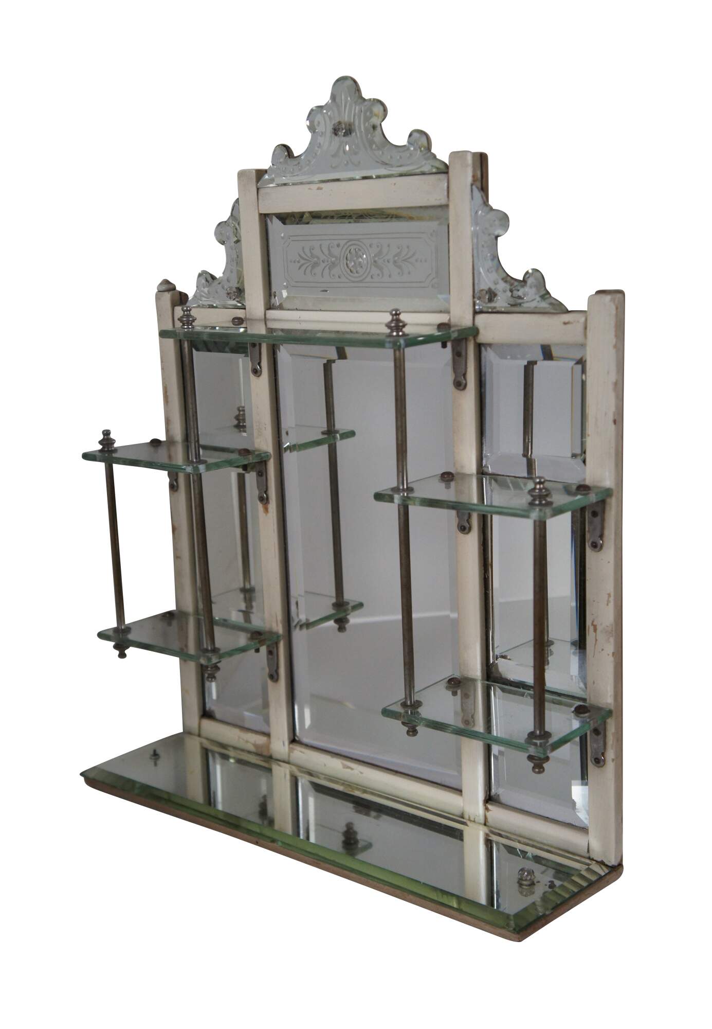 Vintage Venetian mirrored wall hanging curio shelf featuring beveled mirror panels framed in off-white painted wood and topped with a beautifully etched and scalloped mirror crest. Features a mirrored shelf along the base and five smaller clear glass shelves supported with metal rods. Stamped with a triangular mark that reads D.C.C. C.N. TIMIS.