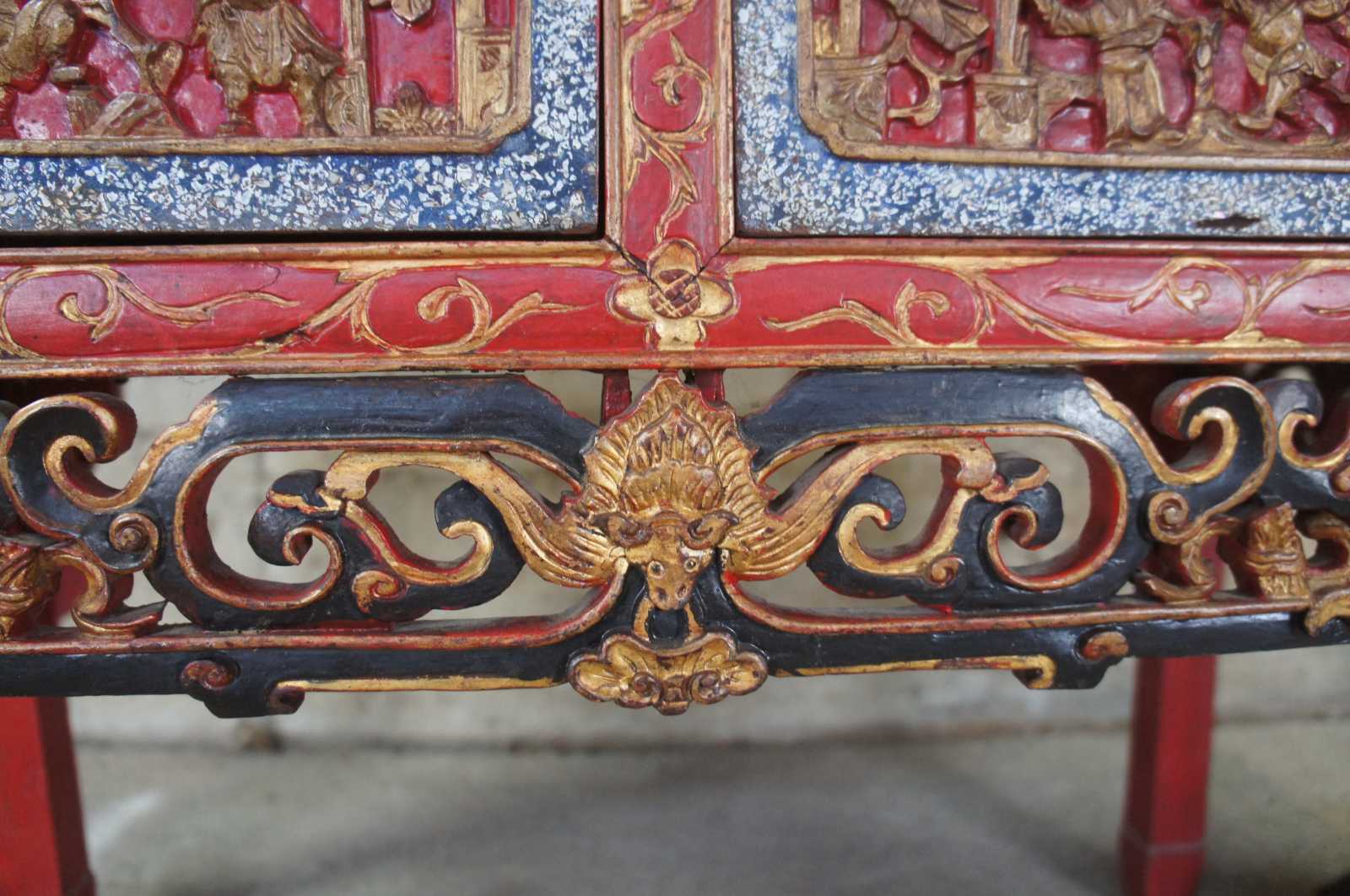 Antique chinese altar table, circa 1900s. Features red painted exterior with carved high relief figures and a central bat below two dovetailed drawers.
