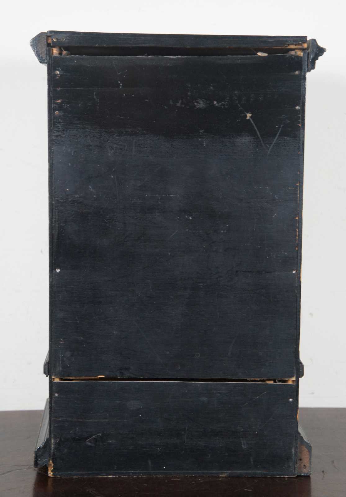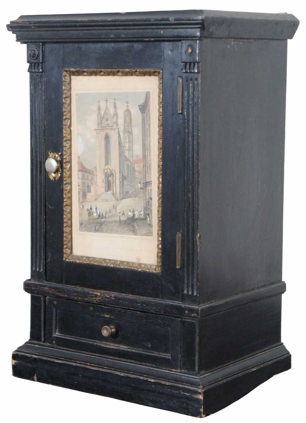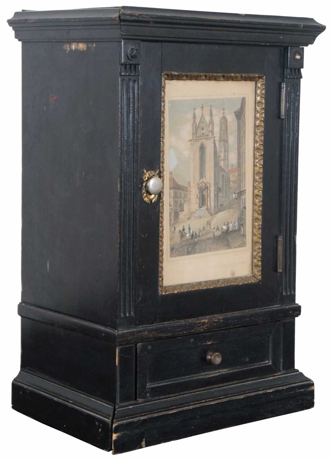 Antique black painted miniature cabinet with lower drawer, three interior shelves and door displaying an antique print by Carl Rauch titled Ansicht der Maria Stiegen Kirche in Wien (View of Mary by the Shore Church in Vienna). “Maria am Gestade or Maria Stiegen is a Gothic church in Vienna, Austria. One of the oldest churches in the city—along with St. Peter's Church and St. Rupert's Church—it is one of the few surviving examples of Gothic architecture in Vienna. Carl Rauch was born around 1804; engraver, painter and draughtsman, specialized on architectural subjects, worked in Darmstadt, Germany.”