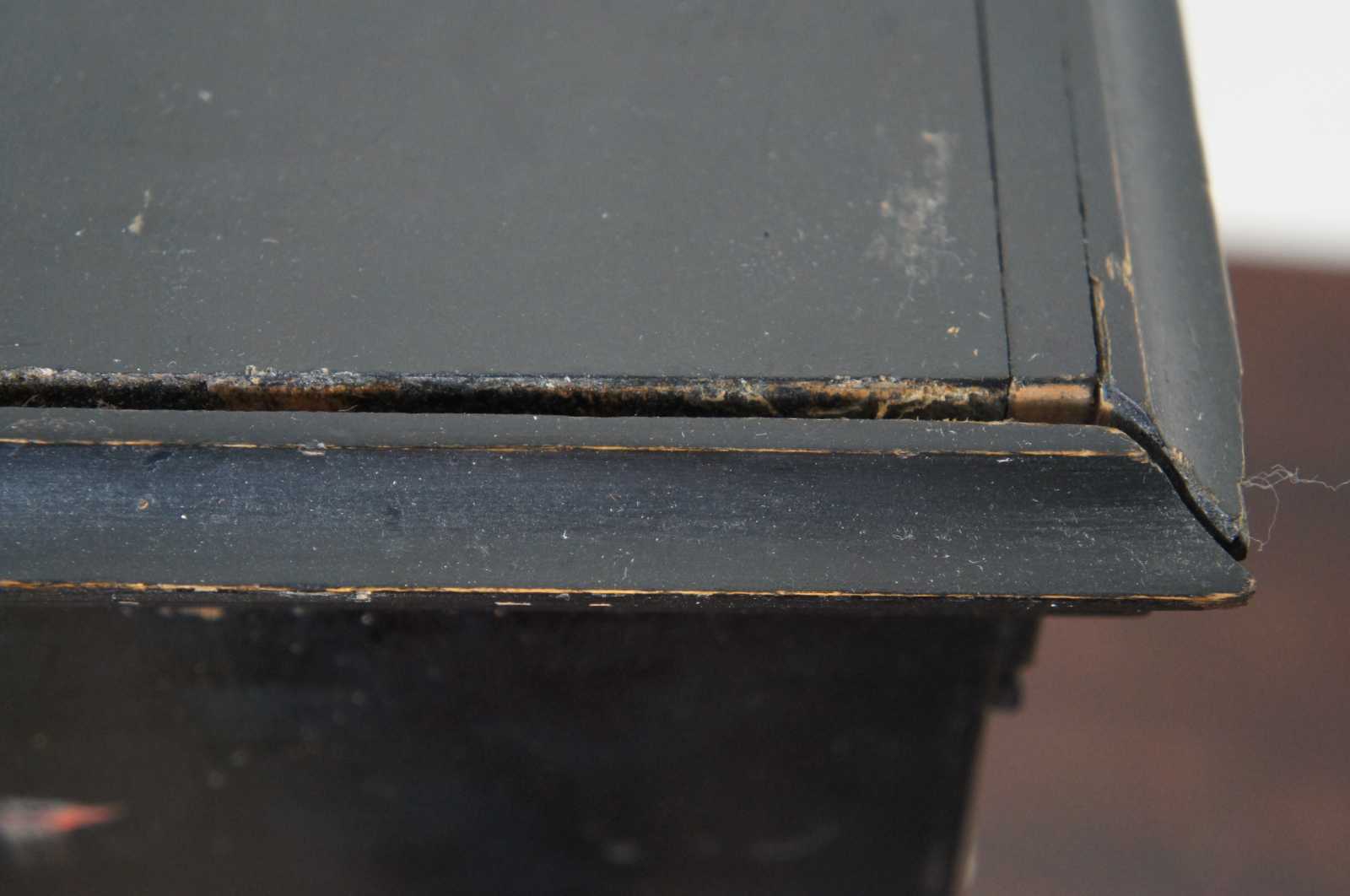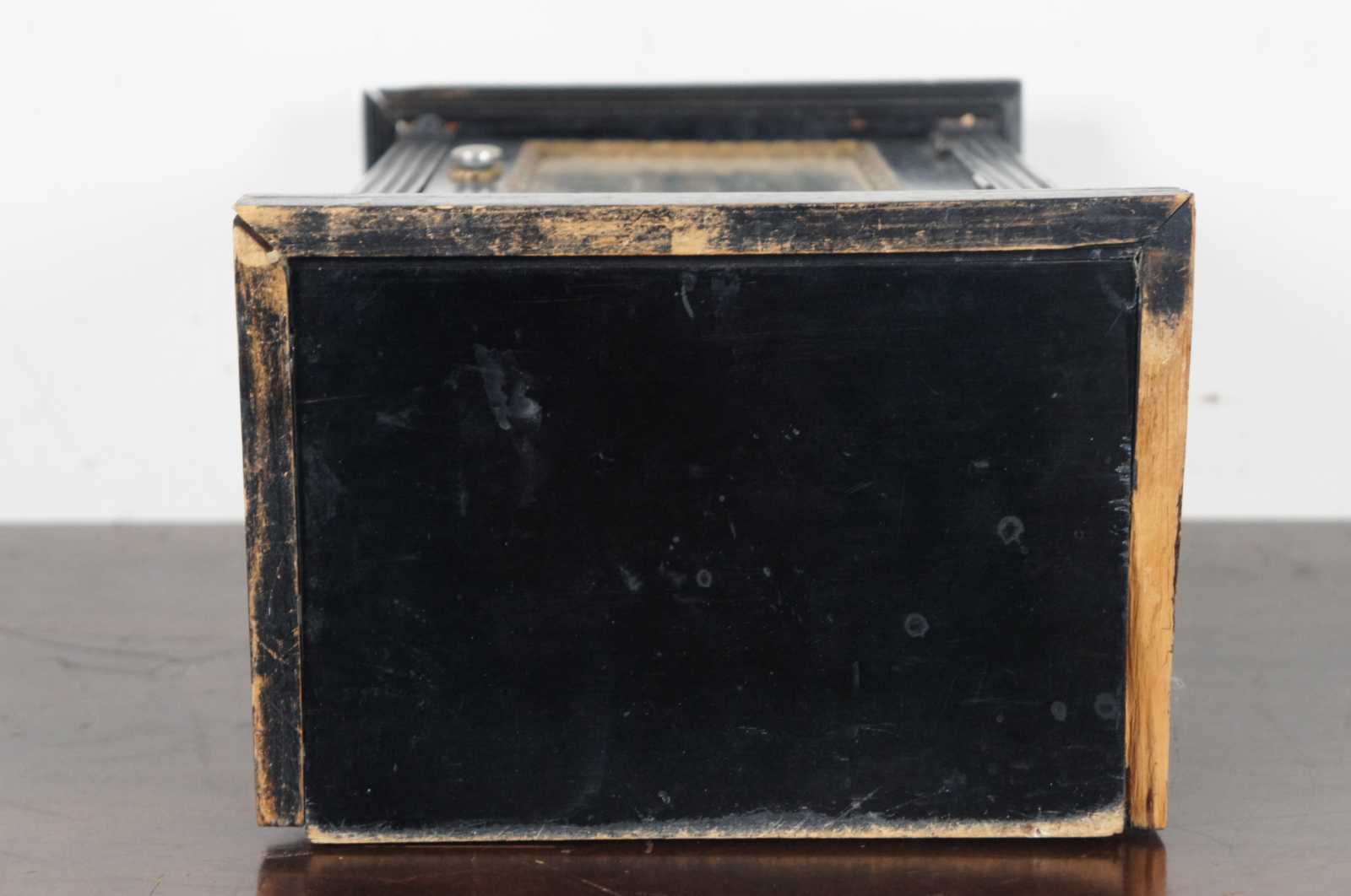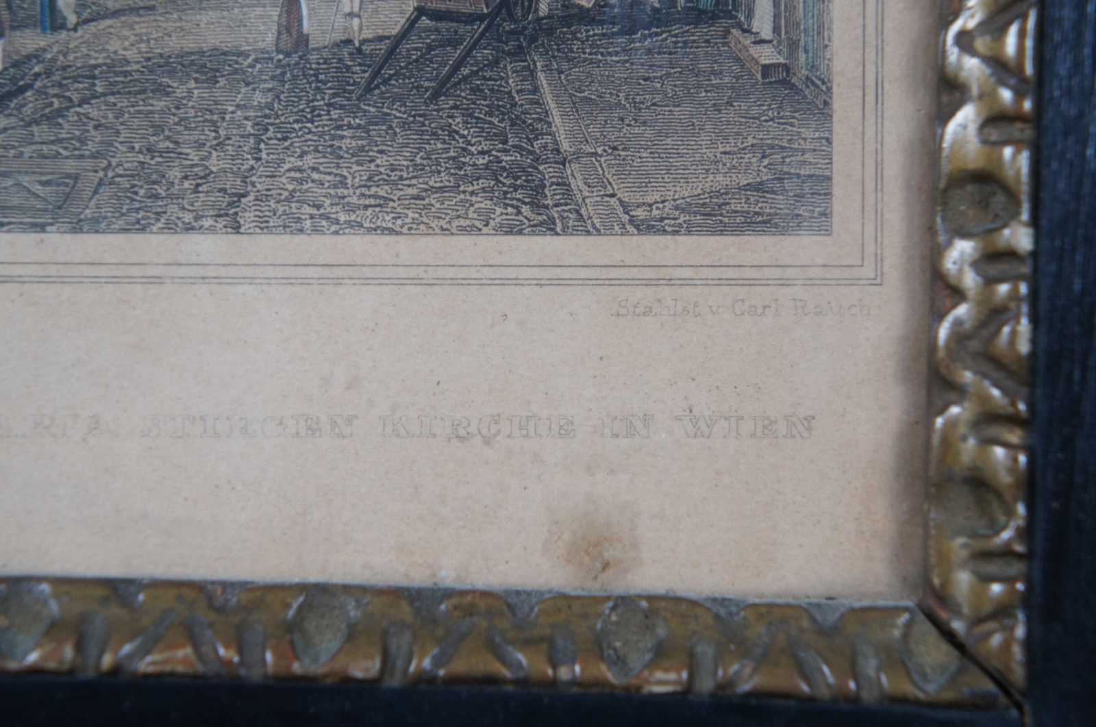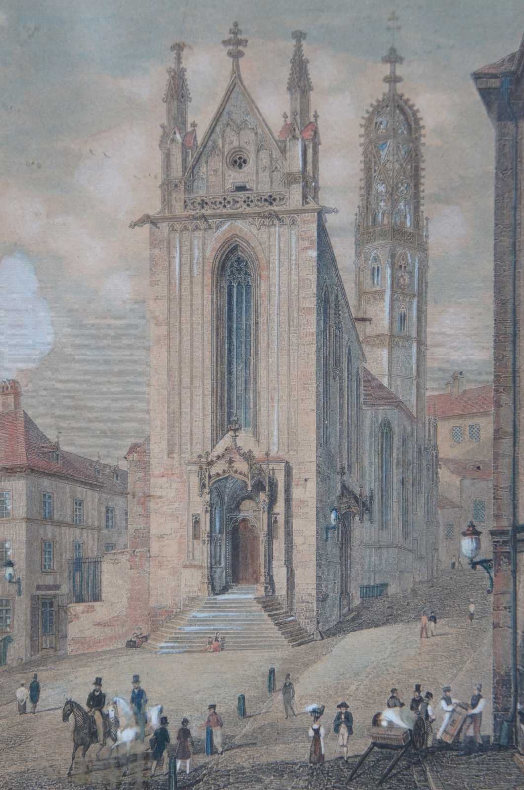 Antique black painted miniature cabinet with lower drawer, three interior shelves and door displaying an antique print by Carl Rauch titled Ansicht der Maria Stiegen Kirche in Wien (View of Mary by the Shore Church in Vienna). “Maria am Gestade or Maria Stiegen is a Gothic church in Vienna, Austria. One of the oldest churches in the city—along with St. Peter's Church and St. Rupert's Church—it is one of the few surviving examples of Gothic architecture in Vienna. Carl Rauch was born around 1804; engraver, painter and draughtsman, specialized on architectural subjects, worked in Darmstadt, Germany.”