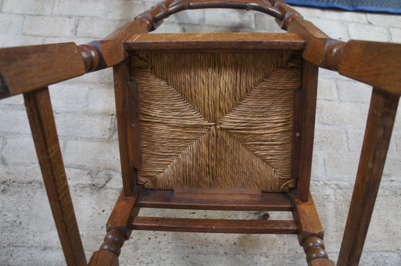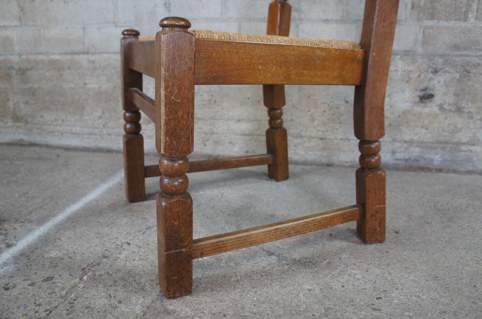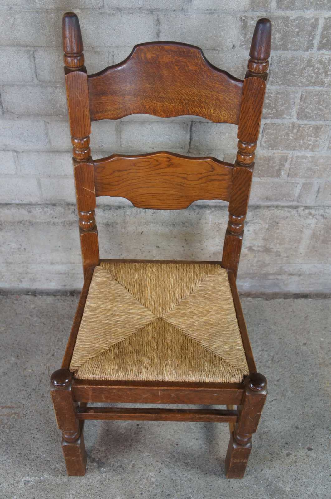 Set of eight old world dining chairs. Made from a heavy oak frame with curved ladder back, gothic style posts and rush seat.
