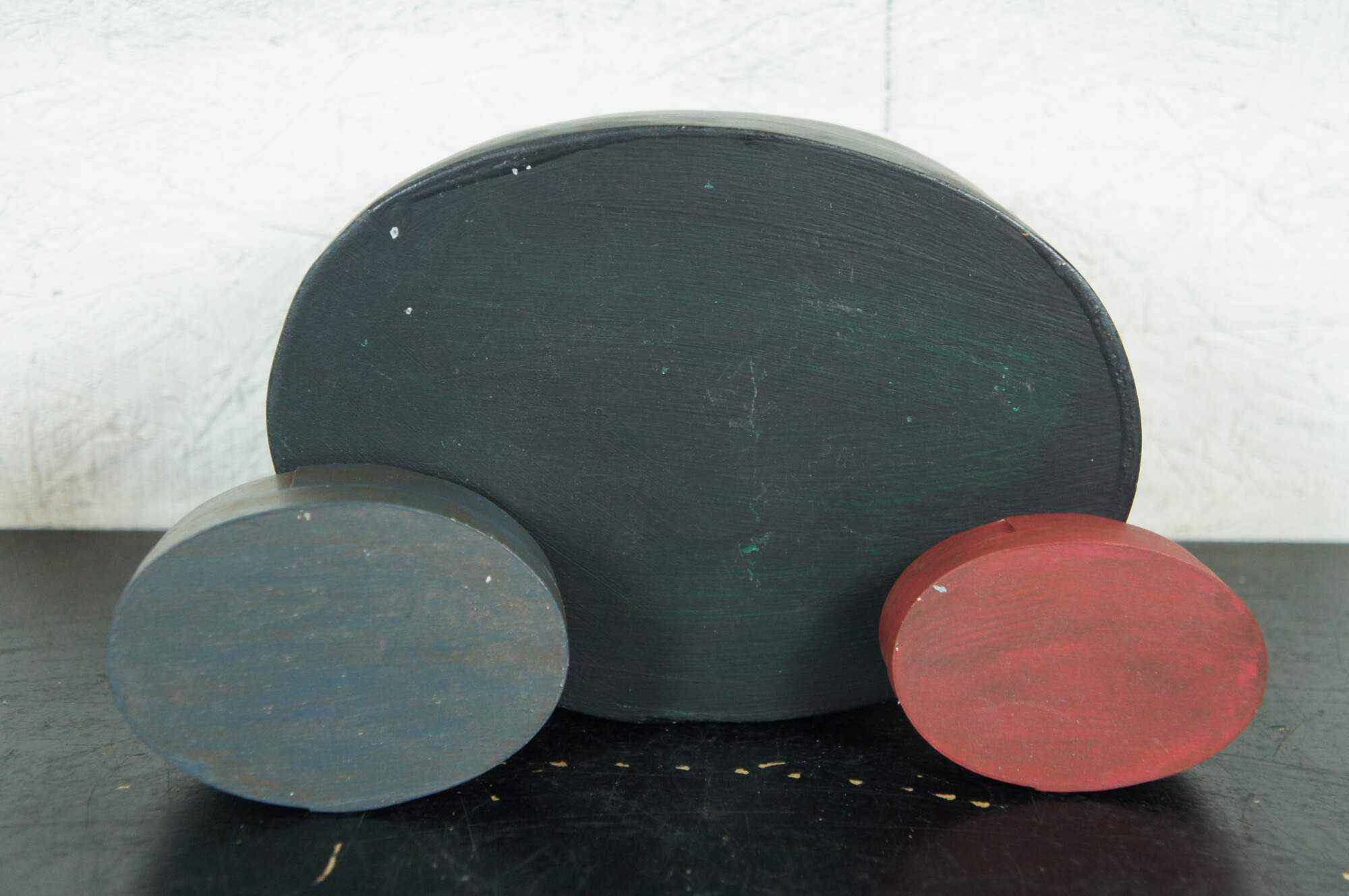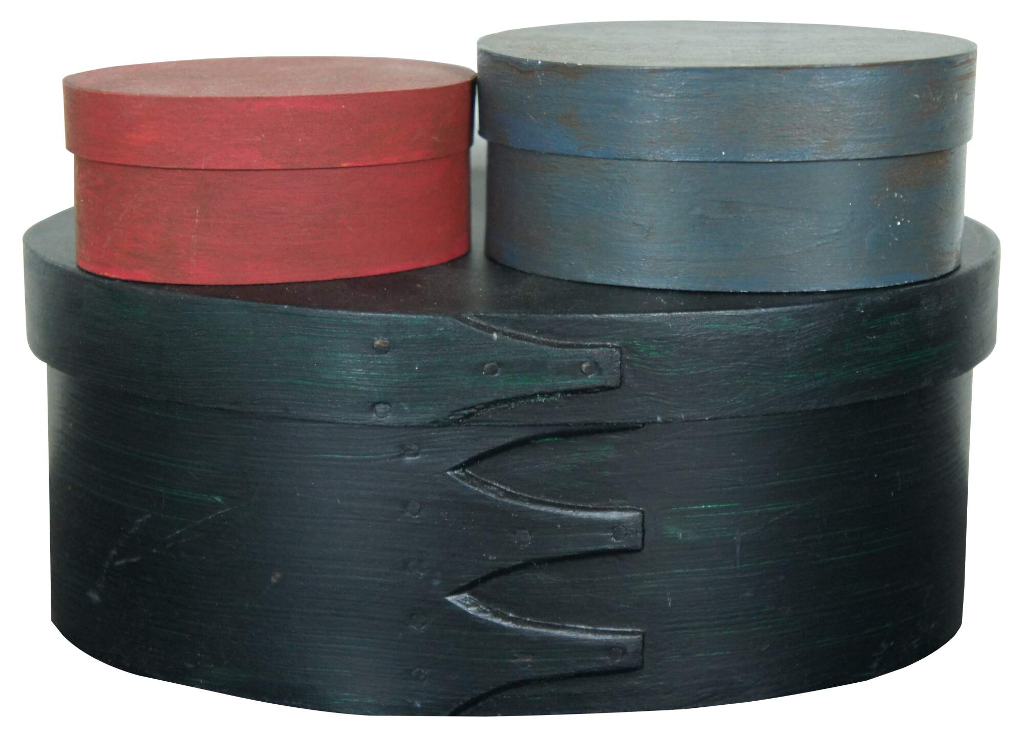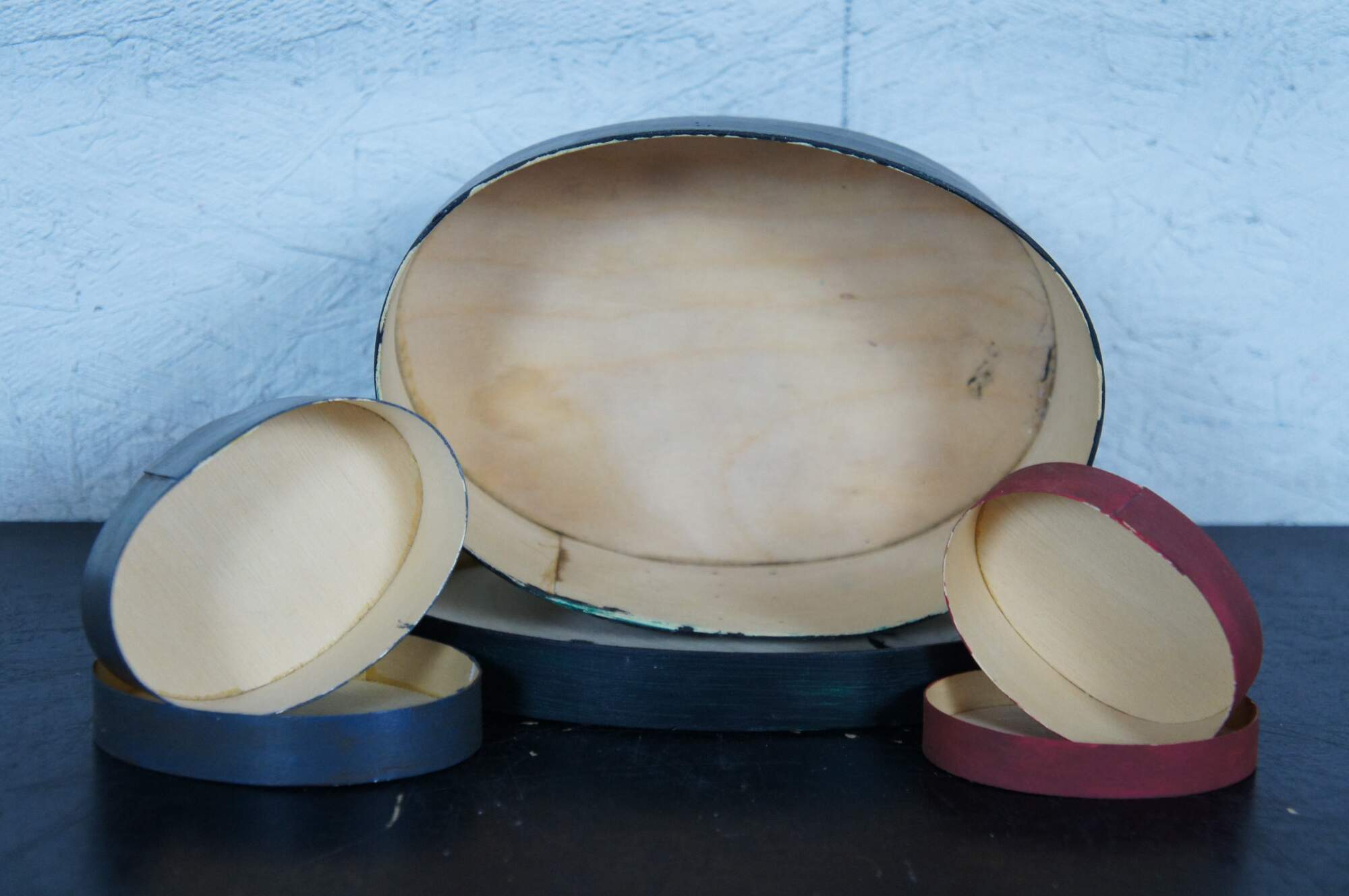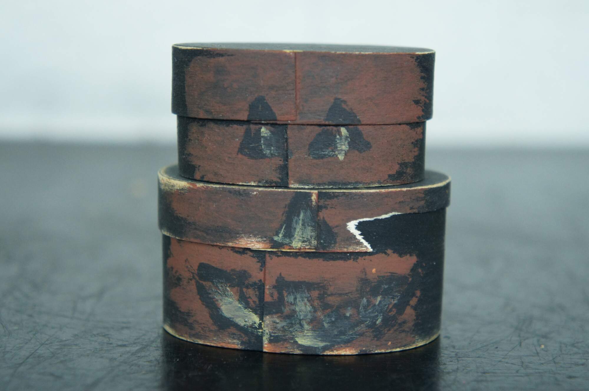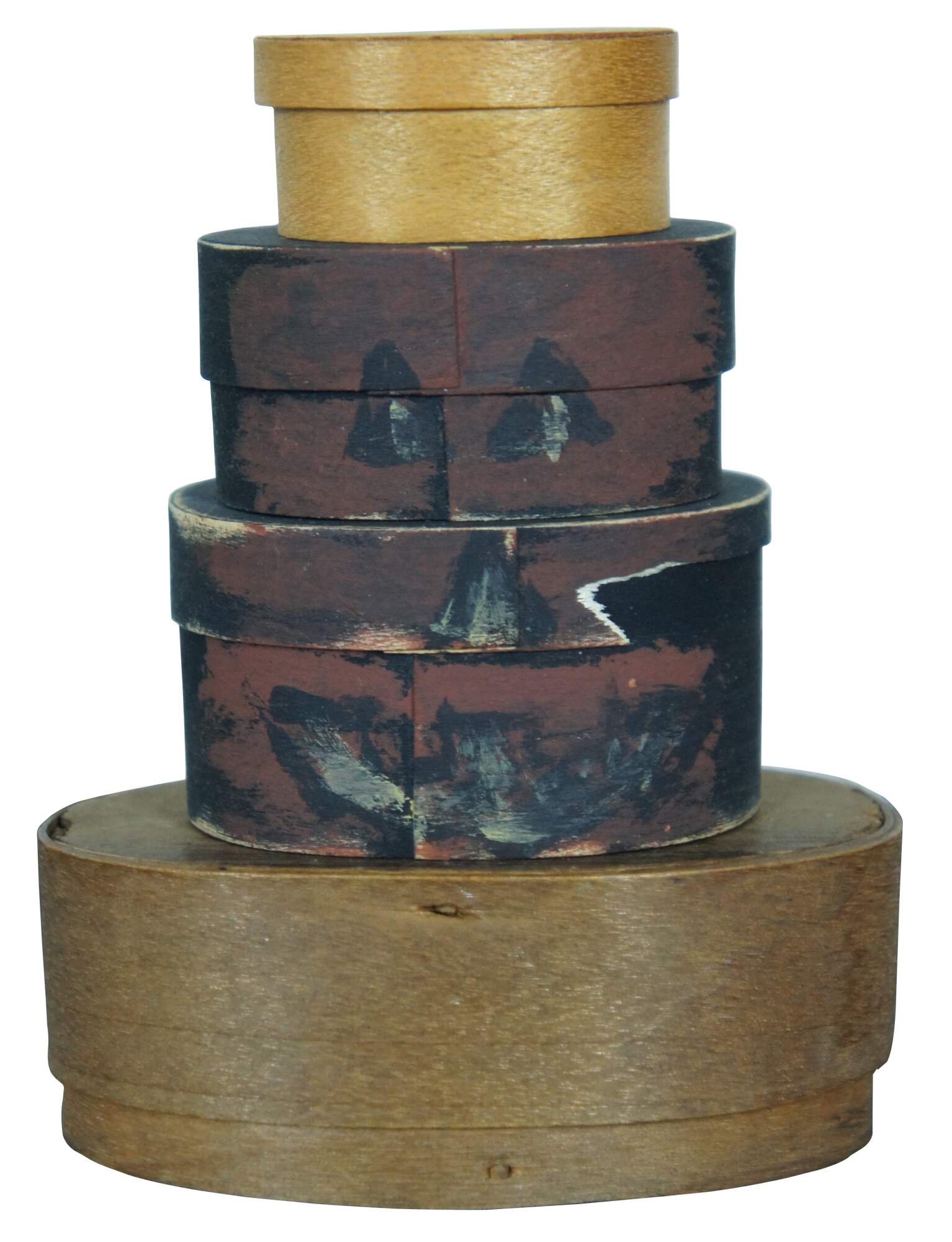 Seven vintage and antique 20th century Shaker style miniature bentwood boxes painted in a variety of colors, two forming the image of a Halloween jack-o-lantern.