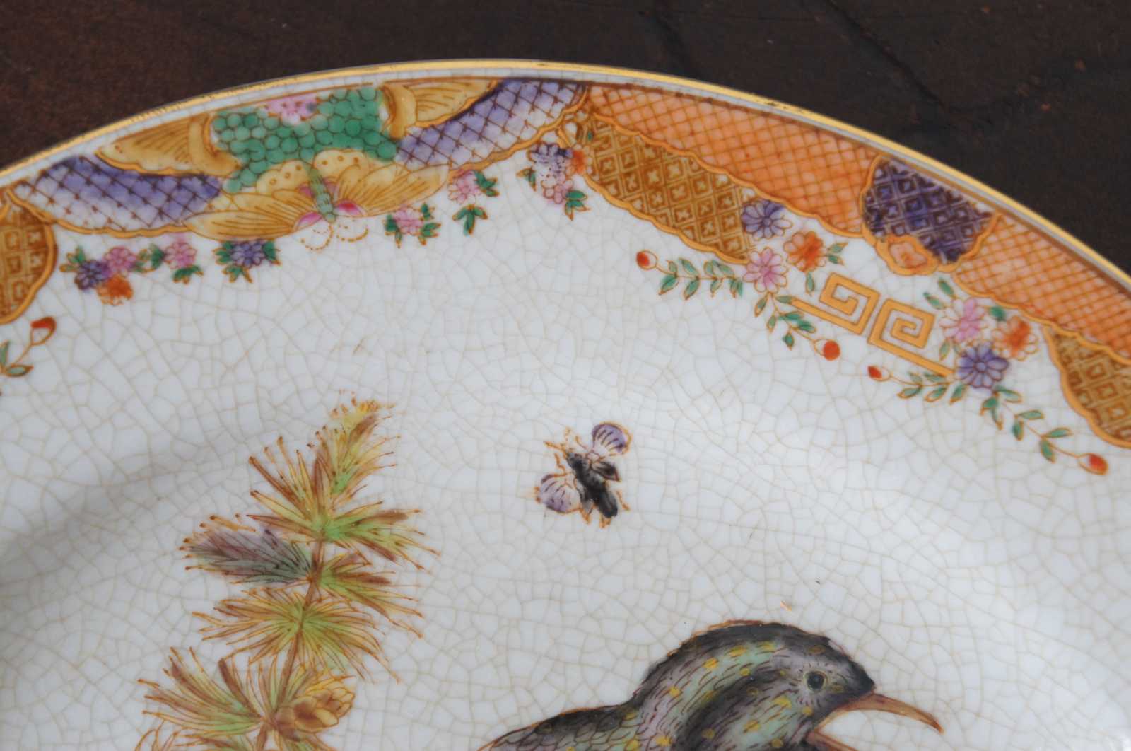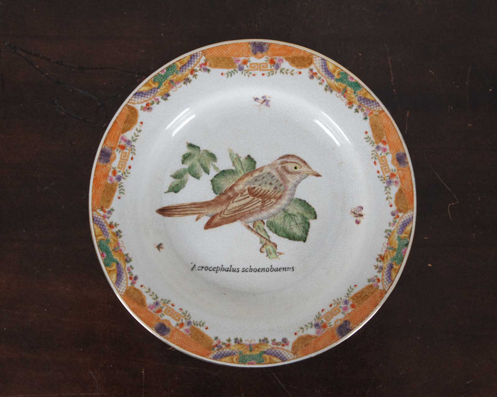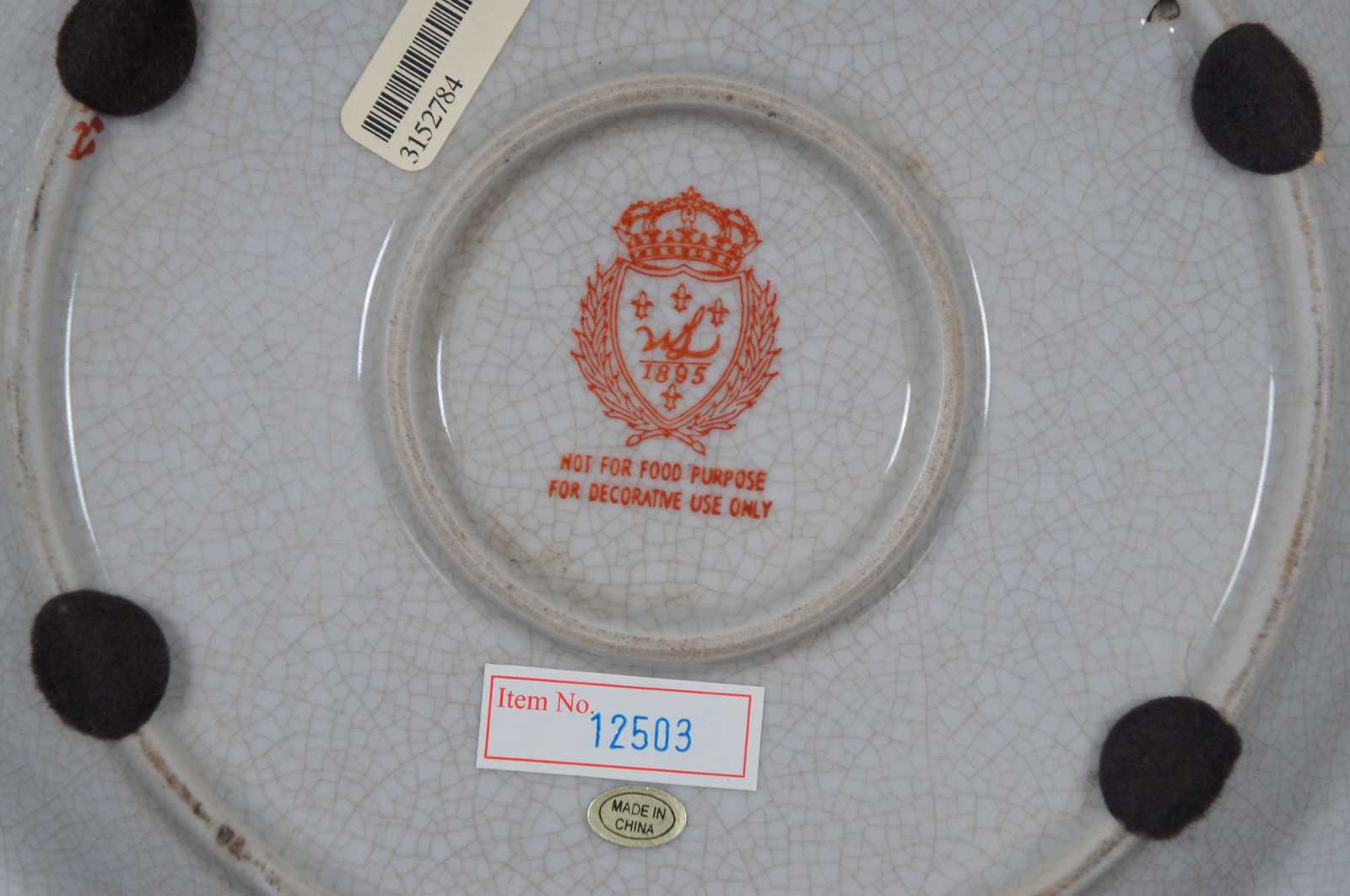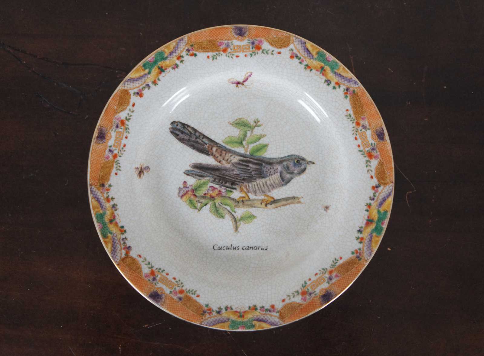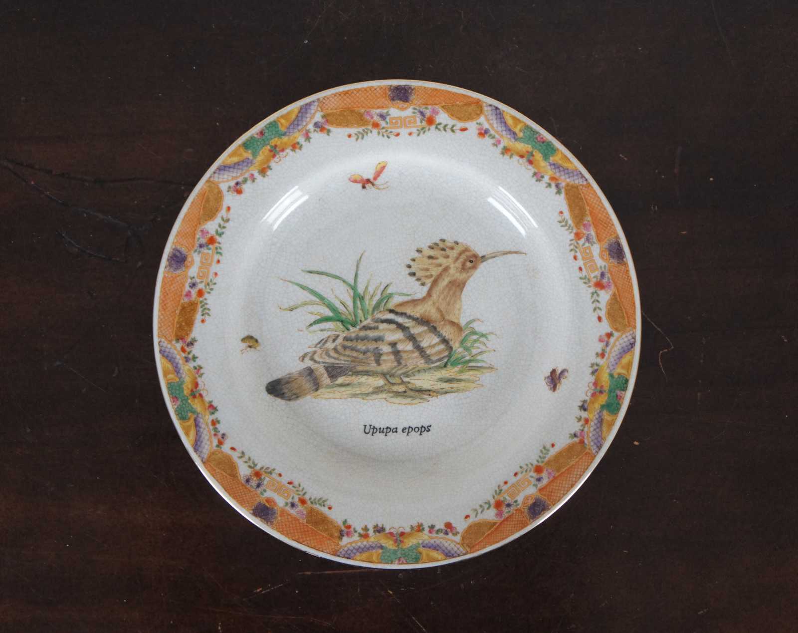 Set of eight decorative ceramic plates with different species of birds and their scientific names, in the style of Victorian illustrations, surrounded by an orange and purple Asian border and artificial crazing. “Wong Lee International Company of Hong Kong, specifically Wong Lee Productions Co. This mark has been used on exports since 1999." "was founded in 1995 and has been exporting since around 1999. 'WL' stands for Wong Lee and the '1895' is in commemoration of the end of the war between Japan and China ... exactly 100 years before Wong Lee Productions was founded.”
