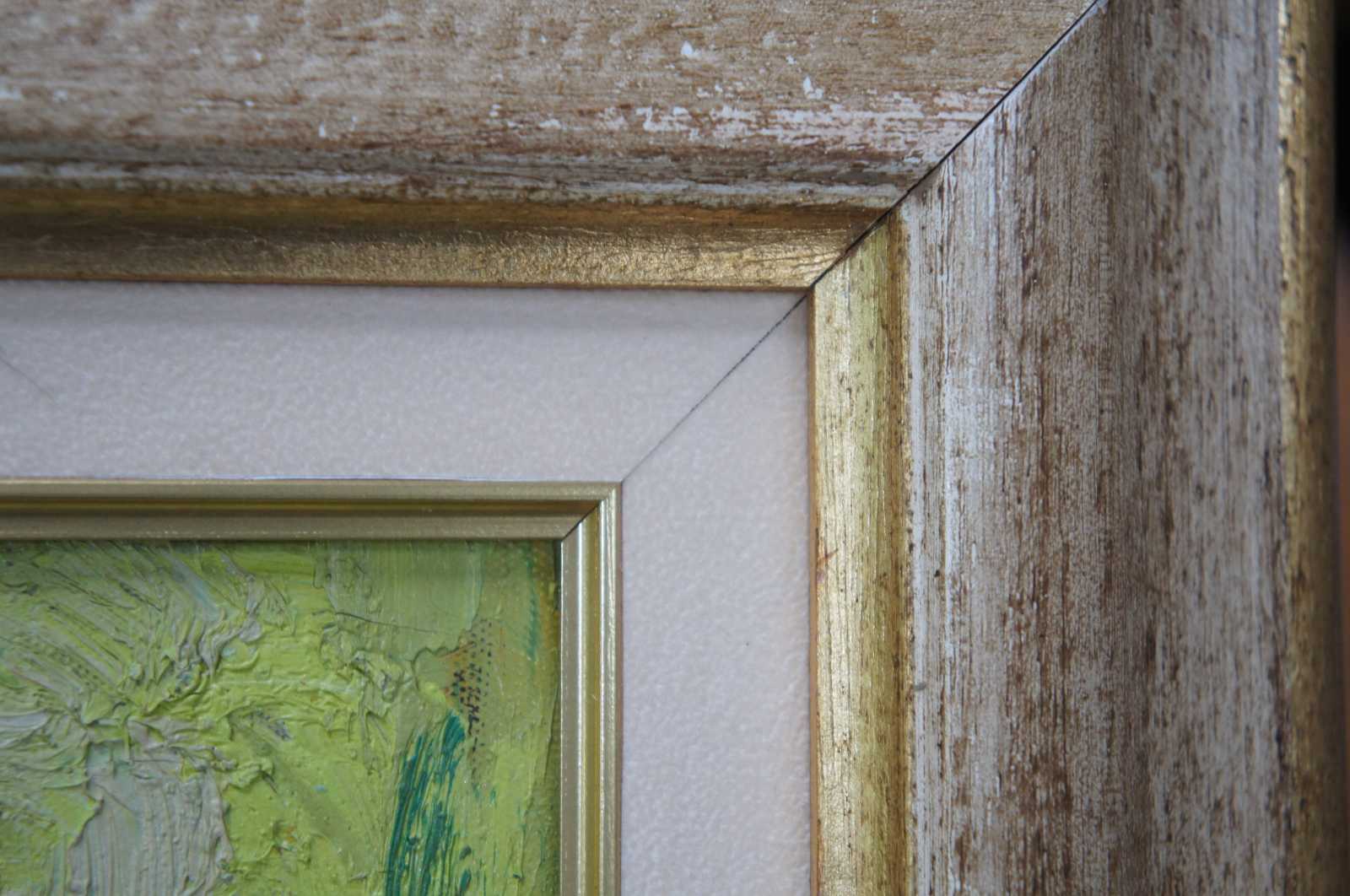 Abstract oil painting of a colorful river landscape with flowing flowers. Signed lower left.