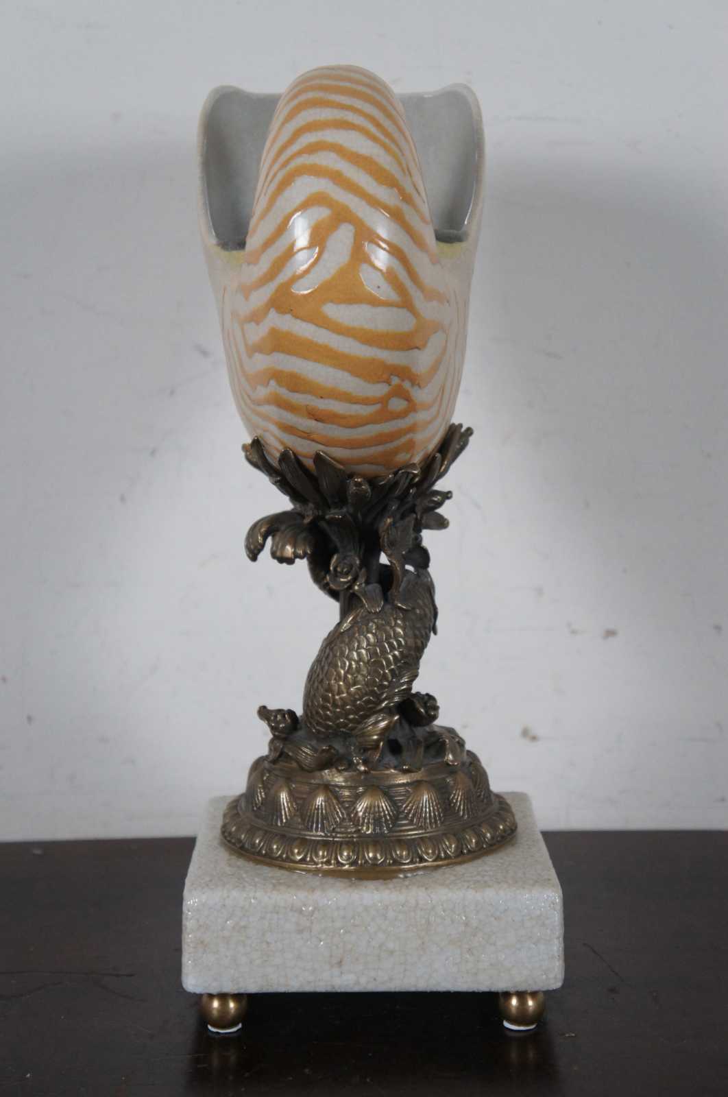 Castilian brand porcelain spiral sea shell in orange and white mounted on a brass dolphin base. “In 1977,Castilian began as a brassware and gift accessories import company.After 12 successful years in Mississippi,it was acquired by Simon and Lily Shen and relocated to Houston,Texas.
