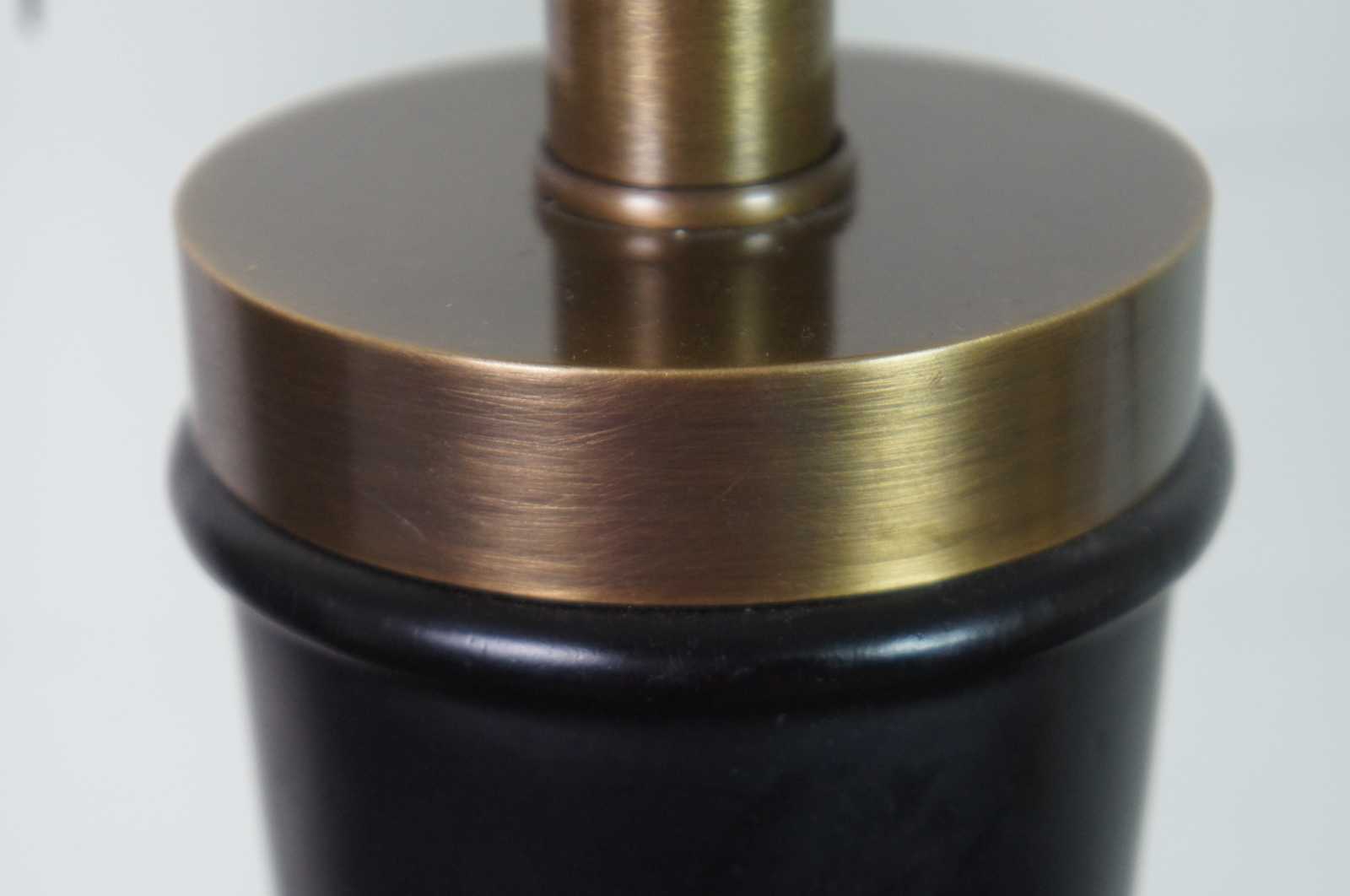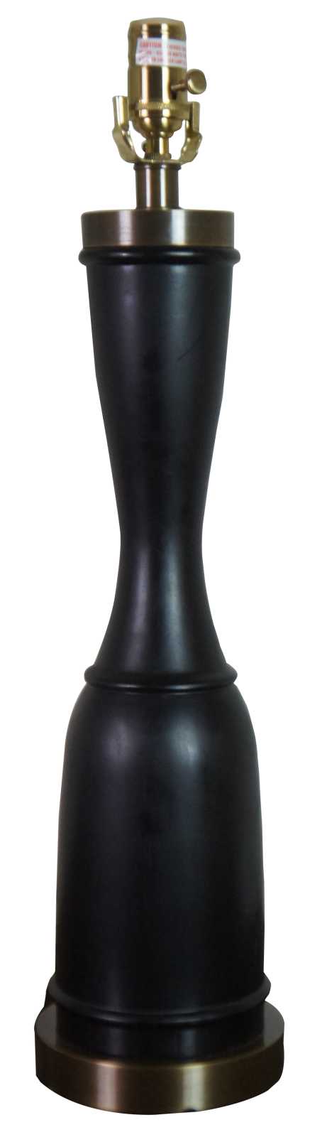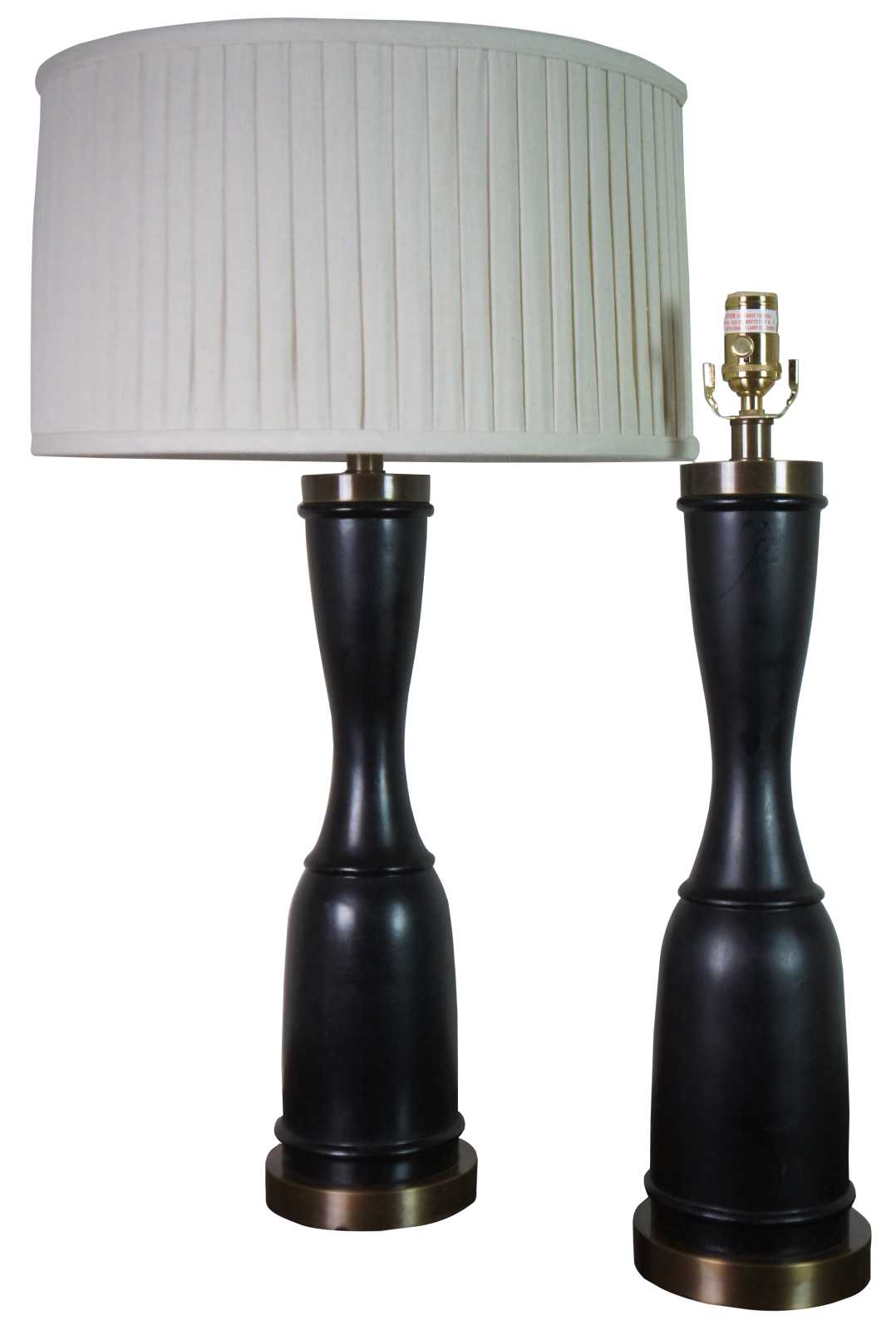 Two vintage designer table lamps featuring a turned trophy form with ebonized wood and brushed brass accents. Attributed to Baker Furniture.